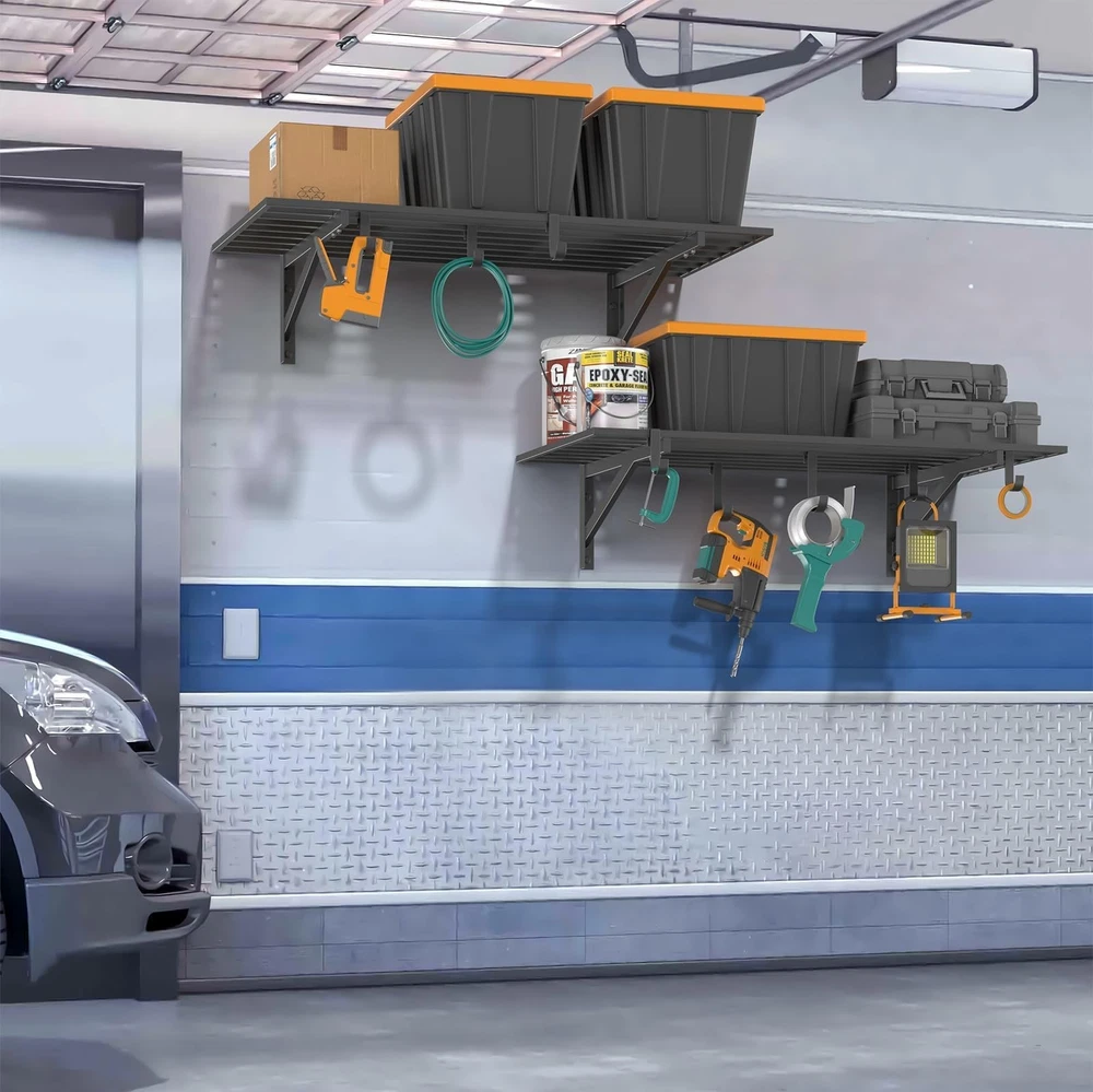 Garage Shelving HEAVY-DUTY GARAGE SHELVING: Our 2-Pack wall-mounted shelves provide generous storage, featuring two 2'x4' shelves per unit. Built from heavy-duty steel, each shelf holds up to 200 lbs, offering a combined capacity of 400 lbs. Ideal for garages, warehouses, offices, and beyond, these shelves are designed for durability, stability, and efficient space organization PREMIUM STRENGTH & STABILITY: Engineered with heavy-duty steel, our wall shelf system features reinforced square tube supports, a seamless integrated frame, and secure U-hooks for superior durability. Every component undergoes rigorous quality testing to ensure maximum safety and long-lasting performance VERSATILE STORAGE HOOKS: Designed with 2 large and 6 small hooks, this shelving system provides flexible hanging space below the shelves. Perfect for organizing garden tools, sports gear, extension cords, toolboxes, cleaning supplies, bikes, and seasonal decorations with ease EASY TO INSTALL: Designed for hassle-free setup, our wall shelf system includes an Installation Template, Bubble Level, and step-by-step guide for one-person assembly. All necessary hardware is provided for quick, secure, and precise installation on wood studs or solid walls (concrete/brick). Note: Not suitable for metal walls. WORRY-FREE PURCHASE: Backed by 24/7 customer support. For brick or concrete walls, use expansion anchors for secure mounting. Our dedicated team is here to assist with any questions.