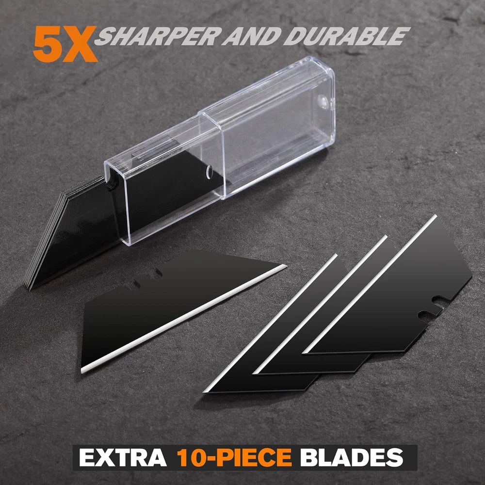 Ultra sharpness and double hardness blade, Perfect for hobby, DIY projects, cardboard, carpet, Rope,boxes, wallpapers, vinyl, rubber, leather, PVC material and etc Comes with 2-pack utility knife, retractable design and folding design. Ergonomical and rubbery handle offers strong grip all the time Blade storage design for easy and quick access. Extra 3 blades storage in the handle Extra 10-piece blades included. Made from high strength blackened SK5 steel for superior durability and long-lasting sharpness. 5X sharper and durable than normal silver blades. Rust-resistant design for longevity and reliability. Quick-change blade mechanism Product Description Attention: We recommend that you wear goggles when using. Although the utility knife is very common in daily life, but we still suggest to use them carefully. If you cannot release the blade, reconfirm whether to press the release button. We recommend to be patient when replacing the blade. Before use, please make sure that the blade is stuck in the slot. If it is not stuck in place, the blade will slip out. Never Allow Children To Use The Utility Knife Alone. REXBETI 2-pack utility knives can be the integral tool in your desk, office due to their versatility. the high hardness blade is ready for heavy duty use like home, art crafts, cutting boxes, cartons, DIY projects and most particular cutting tasks. The retractable design box cutter has 4 position retractable blade for various of cuttings and can meets your any cutting tasks. The folding design box cutter can fold in 3 angles. Both of these 2-pack utility knife are heavy duty design. The ergonomical rubbery handle offers perfect grip all the time. Sharp All The Time Unlike most cheap box cutters, REXBETI 2-pack utility knife are equipped with ultra sharpness and double hardness blade. Adventage:good hardness, not easy to break, good stability, good hardness and more powerful to cut like paper, tape, plastic, cardboard, photos, coupons, cardstock, mat board, foam board, fabrics, crafts or post office packages Perfect Grip A utility knife is an essential tool that everyone should have at hand at all times. Thanks to the ergonomical design, the strong grip will gives you more confidence when doing cutting tasks. The heavy duty anti-drop shell are made of hard plastic, you have no worry that it may be fragile like normal cheap box cutters. Smart Design Yes, you will get 2-pack utility knife. One with retractable design and another one with folding design. you can easily change the length of the blade or the angle that you want. Extra 3-piece blades are storage in the handle for quick and easy access when you need to change the dull blade.