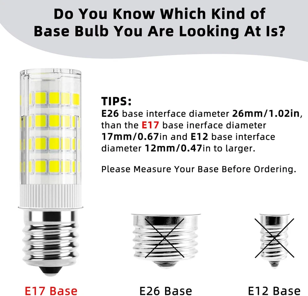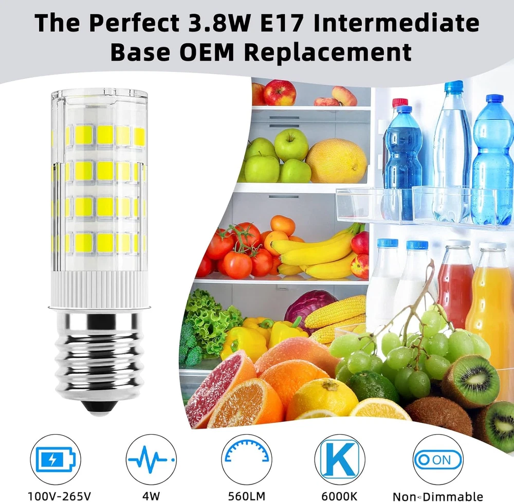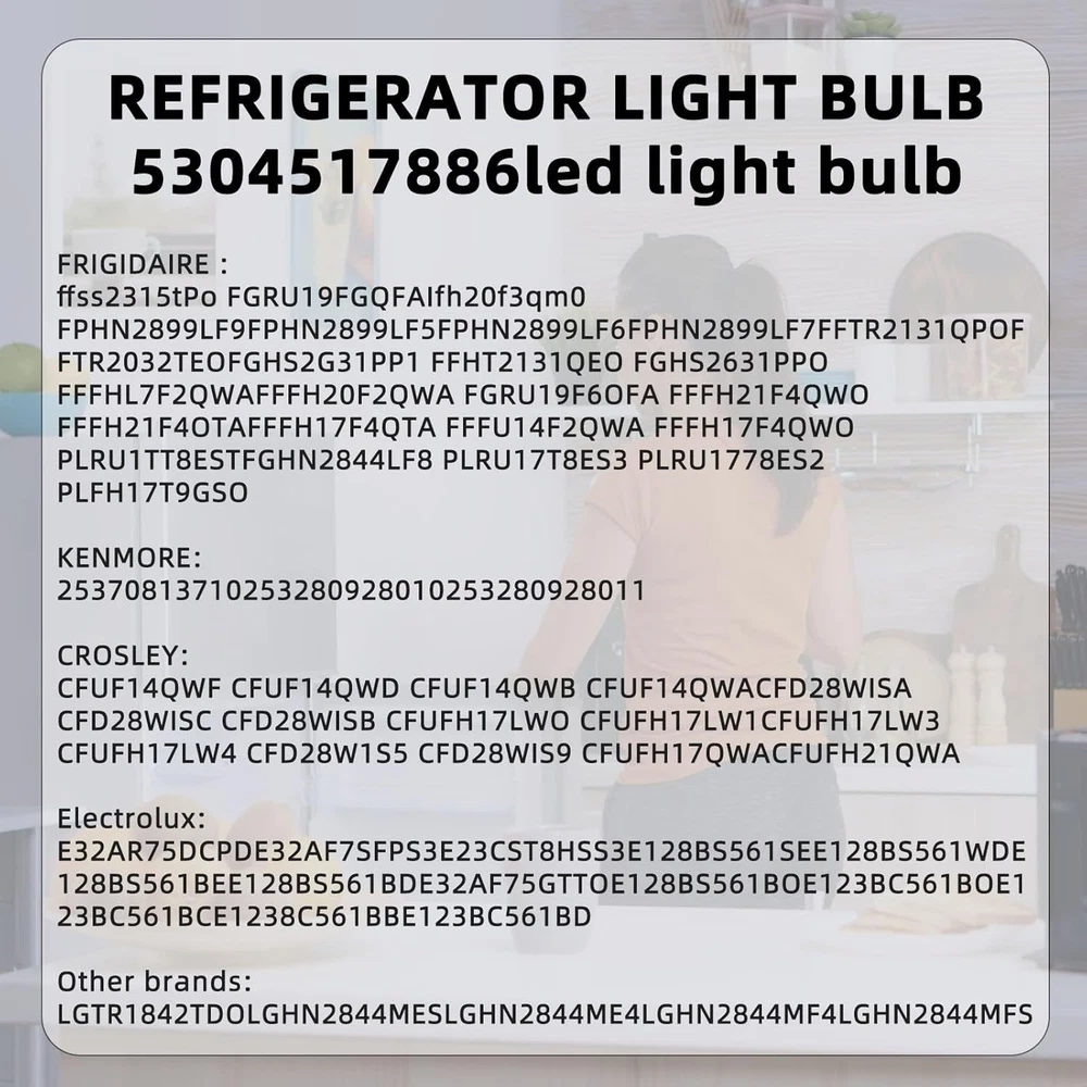 【E17 LED Note Tip】The diameter of the Edison screw base is the most important aspect to consider. E17 refers to a screw-in lamp head with a base diameter of 17mm. The letter E indicates the Edison screw base and the number after the "E" indicates the integer value of the screw base outside diameter. For example E17=17mm, E12=12mm, E11=11mm, E26=26mm. So be sure not to be misled by the similar appearance of the E26 bulb and make the wrong purchase. 【Good Material】 5304517886 refrigerated bulb has better quality than OEM. We have a professional research team and use higher quality materials to make it more durable. The quality exceeds that of OEM. Energy saving, shadow free, stroboscopic, dust-proof and waterproof. High quality refrigerator accessories. 【Model】5304517886 led light bulb is suitable for Frigidaire Kenmore Electrolux Crosley Compatible models: 5304498578 5304509249 5304495326 5304520040 297114000 216988100 216988000 7216988100 241552807 7241552801 7297114000 25370813710 etc. Applicable models: CFUF14QWF E23CS78HPS0 EI28BS55IW0 E32AR75DCS0 FFFC16M5QWE etc. 【Appliance Light Bulb & Home Lighting】In addition to the Refrigerator or Freezer Interior Lighting, can also be used for Microwave Exterior Lighting、Over Stove Appliance、Range Hood、Ceiling Fans、Under-Cabinet etc. (Note and Attention: That bulb CAN NOT be used IN ovens, when used in ovens, the temperature in the oven more than 300 ℉, PC cover and other parts of LED bulb will be burned and melt. ) 【No Buzzing or Flickering】Flicker Free, no glare, no humming, excellent heat dissipation, less light decay, Since they are made especially for refrigerators. (It is not dimmable, please do not use a dimmer, otherwise it may cause flicker and affect the use effect. ) Product Description In addition to the Refrigerator or Freezer Interior Lighting, can also be used for Microwave Exterior Lighting、Over Stove Appliance、Range Hood、Ceiling Fans、Under-Cabinet etc Note and Attention: That bulb CAN NOT be used IN ovens, when used in ovens, the temperature in the oven more than 300 ℉, PC cover and other parts of LED bulb will be burned and melt. )