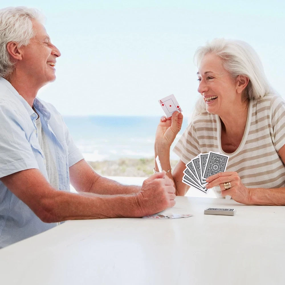 Jumbo index playing cards are super-indexed, big-faced and large-numbered, easy to see, helpful to players with imperfect eyesight, and favored by seniors Plastic-coated decks of cards for a smooth feel and extra durability, easy to shuffle; made from paper stock; linen finish for better handle; blue core sandwich construction for professional game play, nearly Casino Grade Playing cards are great for many card games: Texas Hold'em, Blackjack, Pinochle, Euchre, Bridge, Canasta, Go fish, Poker, Hearts, Baccarat and more 2 Decks playing cards: red and black backing; each deck contains 52 suited cards and 2 jokers Poker size (wide size) cards measure 2.5" x 3.5"; This is regular playing cards. If you play pinochle game, just pick out two copies of 9,10, J, Q, K, A cards of all four suits and remove unneeded cards. Product Description Jumbo Index Playing Cards If you have to strain to see the small print on standard index cards, then Jumbo Index is good choice for you. Jumbo index means the ranks, and suit symbols are printed larger on the cards than standard index. The card size is same with traditional card, measures 2.5" x 3.5". Super Index Playing Cards are easier to see from far away, especially great for Texas Hold'em, which requires you to hold few playing cards in your hand, and relies heavily on community cards for all the players crowded around the table to see. Jumbo Index is also suitable for players with imperfect eyesight, and favored by seniors. LotFancy Playing Cards LotFancy Playing Cards are made from paper, coated with a layer of plastic, to make slick, durable and flexible. These cards have excellent quality graphics, shuffle easily and feel very substantial. Blue core sandwich construction prevents from cheat, nearly Casino Grade, great for professional game play. Jumbo-indexed playing cards feature classic red and black suits, super-index, and big-face, available in both black and red card backs. Each deck includes 52 suited cards and 2 jokers. You will love it ! Playing cards are one of favorite items for party, travel and camping to kill time with friends and family, perfect for Poker Night and Casino Party. Whatever you play texas, poker, bridge, euchre, canasta, hearts, go fish, pinochle and other different variations of solitaire, even practice card sleights or cardistry, LotFancy playing cards can satisfy all your need. Specification Quantity: 12 Decks or 2 Decks Color: red; black Card size: 2.5” x 3.5” (63mm x 88mm) Index: jumbo size