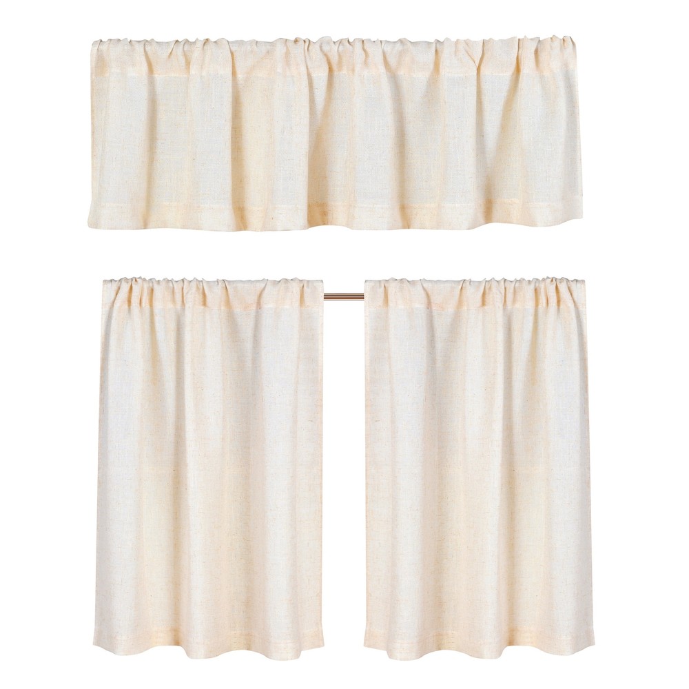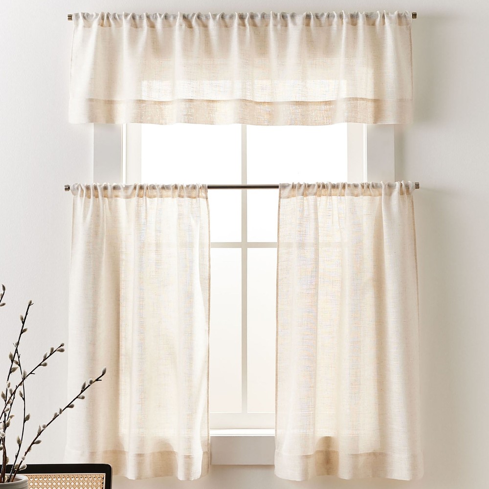 Includes: 3 panels,Hanging Style: Rod pocket top for easy installation and styling,Light Filtration: Sheer,Material: 90% Polyester / 10% Linen,Care: Machine washable,Country of Origin: Imported,Why Any Adult Will Love It: This effortless set elevates your home with a sheer linen blend. Choose from a variety of beautiful colors to go with all home decor styles,Style Tip: For windows you open often, choose sill length. For a casual look, let the fabric fall a few inches below the window. For a tailored or dramatic look, choose floor length curtains to make your windows a focal point Includes: 3 panels Hanging Style: Rod pocket top for easy installation and styling Light Filtration: Sheer Material: 90% Polyester / 10% Linen Care: Machine washable This effortless set elevates your home with a sheer linen blend. This exquisite set combines the timeless charm of linen with innovative light filtering technology, adding a touch of sophistication while allowing a soft, filtered glow to illuminate your home. This set includes both tier curtains and a coordinating valance, offering a complete and polished look for your windows that any adult will appreciate. On Jun 25, 2025 at 01:41:21 PDT, seller added the following information: