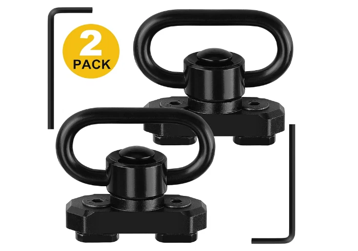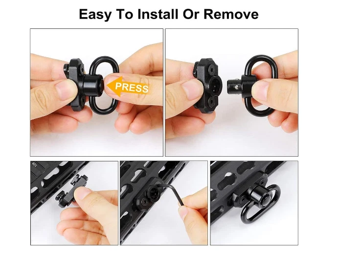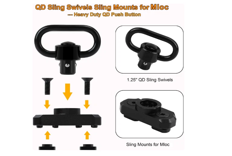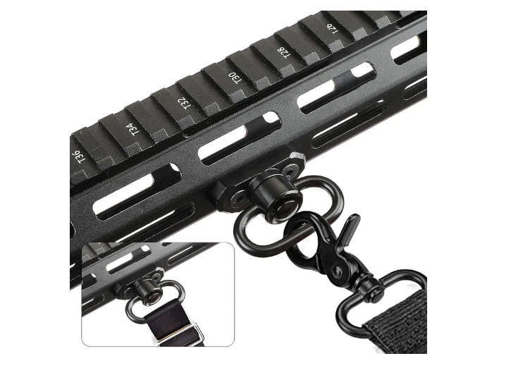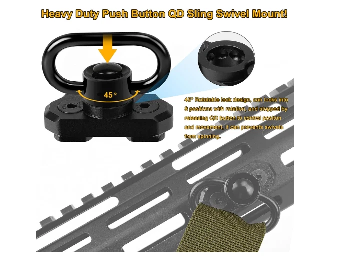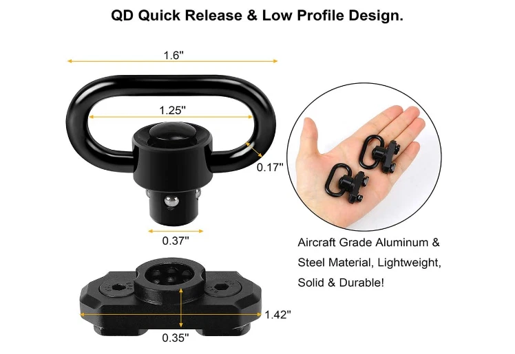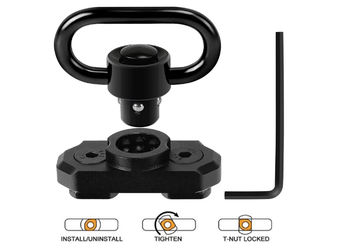 Product Description: 1.25" Quick Release Sling Swivels with M-Lok Mount 🔧 Perfect Fit for Traditional Slings: These 1.25" Quick Release Sling Swivels are designed to accommodate 1-1/4" wide two-point slings . Crafted with high-strength steel, they provide exceptional durability, ensuring no deformation or disconnection under heavy use. 🔧 Unique M-Lok Sling Mount Base: Featuring a customized, lightweight, and low-profile design , the M-Lok sling mount base attaches securely to all M-Lok rail slots. Equipped with steel locking T-nuts and screws , it ensures a tight fit without bending or breaking when properly tightened. 🔧 Non-360° Rotational Design: The mount adopts an innovative 8-point, 45° rotation locking system , offering stability and durability. Customize the placement of your M-Lok attachments for a secure and reliable fit wherever you need them. 🔧 Premium Solid Construction: Sling swivel: High-strength steel with a matte black finish for durability and a sleek appearance. M-Lok mount base: Precision-machined from aircraft-grade aluminum alloy , finished with matte black anodizing for long-lasting performance. 🔧 Quick Installation & Removal: Easily attach or detach the QD sling swivel with its push-button design. Install the T-nuts and screws onto your M-Lok rail using an Allen wrench for hassle-free setup and removal. Upgrade your gear with this durable, reliable, and easy-to-use 1.25" Quick Release Sling Swivel Set with M-Lok Mount —ideal for traditional slings and tactical setups.