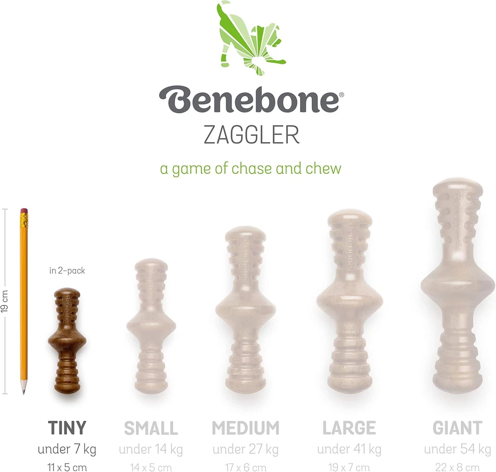 DURABLE, LONG-LASTING – Pint-sized super chewer? Bring it on. Benebones are tougher than real bones and last for weeks. REAL BACON AND REAL WOOD – We use only 100% REAL BACON for flavor and scent in our Zaggler, and real maple wood in the Maplestick. Trust us, little dogs can tell the difference. EASY TO PICK UP AND CHEW – Our Maplestick and Zaggler are uniquely shaped for a paw-friendly grip so your pup can quickly grab them and get a good chew going. Think about it: dogs don’t have thumbs. UNIQUELY FUN SHAPES - The Maplestick’s unique shape will surely upgrade your game of fetch. The Zaggler likes to roll around and is constantly on the move. Two fun shapes in one pack! USA Made – We make and source everything in the USA. The Benebone Tiny Maplestick/Zaggler Little dogs love to chew just like the big guys. And they dig real flavors like bacon and maple wood. About Benebone At Benebone, we started with the premise that dogs experience scent and flavor in a way we can’t even grasp. So we ditched the neon colors and loud squeaks. Inspired by a dog’s powerful sense of smell, we developed long-lasting durable chew that are jam-packed with real bacon and real maple wood. Once your tiny dog takes a bite of our USA-made chews, he’ll be hooked. We’re Obsessed with Safety Too Wonder if Benebone is right for your dog? Here’s what you need to know. Since it’s hard, it’s important that your pup has strong teeth. If you’re unsure, check with your vet. Nobody likes an unexpected trip to the dentist. Keep an eye out for wear and tear. Within a month or so, we find that most dogs chew Benebone into submission. See the wear page on our website for helpful photos to determine when to replace yours. Keep away from households with peanut or other allergies. What’s Inside? Nothing but Nylon and Real Bacon & Real Wood for Tantalizing Flavor