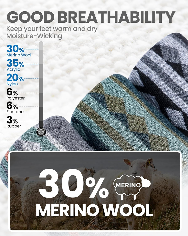 BREATHABLE, WARM & COMFORTABLE Made in a wide range in sizes of a Merino Wool blend that is LIGHTWEIGHT, BREATHABLE and PREVENTS build-up of SMELL. It also helps keep feet dry due to it's moisture wicking properties. OVER CALF DESIGN High calf design & elasticity for the ULTIMATE COMFORTABLE FIT. Perfect for skiing, snowboarding and other snow sports. STAYS UP Equipped with NON-SLIP CUFF that ensures that the sock stays up. Socks slipping down in the boots is a thing of the past! ITCH-FREE, MADE TO LAST, EASY TO WASH & BEAUTIFUL PACKAGE BAG Have an itch-free time out in the snow with this high quality merino wool blend. And afterwards, enjoy great MACHINE WASHABLE quality that is made to last. The package bag makes them a perfect gift item! Make sure that your kids feet are comfortable, warm and dry when out in the snow. The merino wool blend of these socks ensures a comfortable, itch-free, fun time. Specifications Sizes: M/L fits: Men 6-11 Women 6.5-12 L/XL fits: Men 11.5-15 Women: 12.5-16 Material: 30% Merino Wool 35% Acrylic 20% Nylon 6% Polyester 6% Elastane 3% Rubber Package Includes: 2 pair OutdoorMaster Adult Ski Socks
