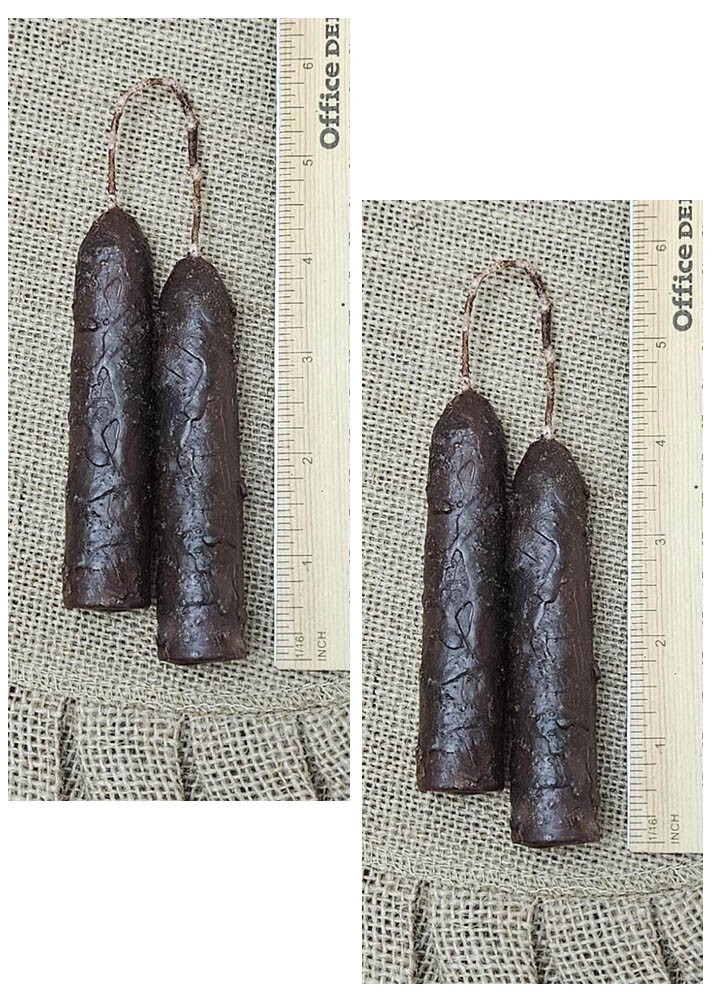 ~ Welcome to 1804 Primitives ~ "Joined-Wick Hanging Candles" Enjoy the grungy goodness of our 2-pair joined-wick hanging taper candles Each candle measures about 4" in height with a base width of 7/8", offering a classic taper shape that complements any decor Hang them from a peg, on a tree, or from a hook anywhere in your home These dark brown candles have a slight hint of burgundy, providing you with a touch of primitive charm ~ Thank you for shopping in our little corner of eBay ~