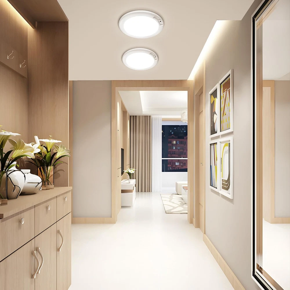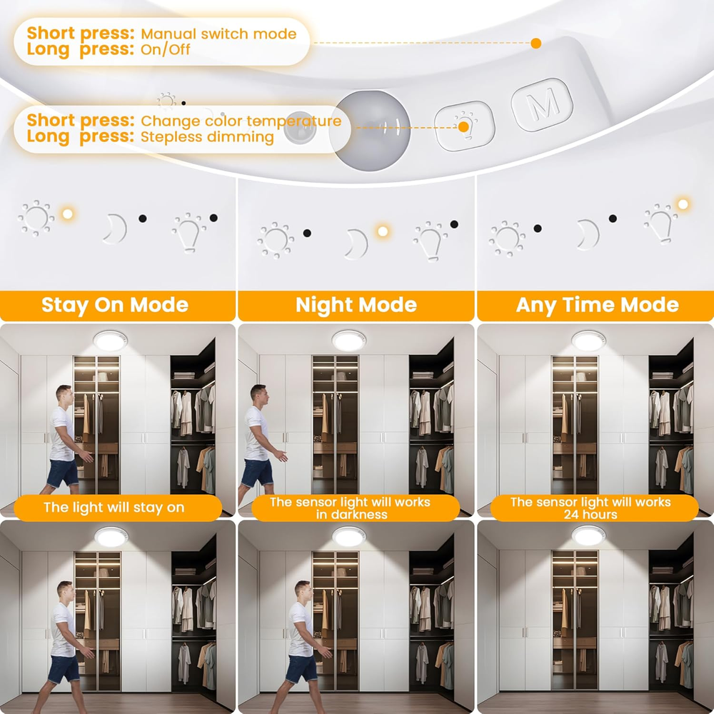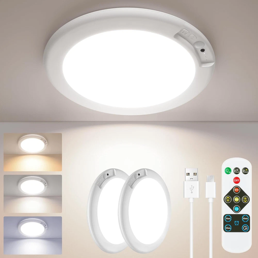 No Wiring Required & Magnetic Installation: Say Goodbye to Complicated hard wired Installation. No assemble, no drill, no wiring, no socket, the led ceiling light is installed with strong magnetic suction: Only need to adhesive the iron sheet to the ceiling(no rough surface), the magnet part will be attracted to the iron sheet. It’s easy to remove the ceiling light to charge and install back to the ceiling. 3 Sensing Modes: The 2 PACK motion sensor led ceiling light with 3 sensing modes. Stay ON Mode: Battery-operated light stays on day or night, just like a regular light without motion sensing; Night Mode: Wireless closet light works in a dark environment. It only works at night and when the ambient light is below 15LUX; Anytime Mode: Motion sensor light works 24 hours. The rechargeable closet LED light will automatically light up whenever motion is detected, day or night. Built-in Rechargeable Battery Powered & Long Lifespan: No need to buy batteries to replace! Smart sensor lights built in 4000mAH rechargeable battery. The motion-detection ceiling light fixture can be used for 15 hours in the highest brightness and constant light mode, and 60 days in induction mode. 3 Color Temperatures & High Brightness: The LED closet light has three color temperatures (3000K/4000K/6500K) and multiple brightness levels (100%-10% smooth dimming); the three color temperatures can be selected on the remote control or the buttons on the light; a variety of combinations can be selected according to your needs. Smart Timer Function & Lightweight and Wide Applications: 2 Pcs remote ceiling light with 3 groups of timing: 15min/30min/60min. Perfect for dark corners and no wire positions, ultra thin flush mount close to ceiling light applies for various spaces like storage rooms, showers, garages, staircases and hallways, providing versatile cordless lighting. Product description Modern Rechargeable Motion Sensor LED Ceiling Light Battery Operated LED Light 3 Sensing Function 3 Color Temperatures Timer Function Wide Applications Bathroom, Kitchen, Basement, Powder Room, Restaurant, Bedroom, Study Room, Farmhouse, Living Room, Mudroom, Guest Room, Galley, Dining Room, Kids Room, Nursery, Utility Room, Home Office, Workshop, Shop, Office, Hallway, Entryway, Porch, Balcony, Cafe, Foyer, Mudroom, Galley, Attic, Garage Discover More Products 24W 12 Inches Flush Mount LED Ceiling light Features: 24W, Non-Dimmable, CRI 85+, 25000+ Hours Lifespan, No Flicker Color Temperature Choices: 5000K Daylight White/6000K Cool White/4000K Neutral White/3000K Warm White Semi-Flush Mount Ceiling Light, Seeded Glass Shade Applications: Hallway Porch Corridor Kitchen Bedroom Living Room Mudroom Basement Foyer Features: Seeded Glass Design Color Choices: Matte Black/Matte Brown/Oil-Robbed/Brushed Nickel/Brushed Golden 11 Watts A19 LED Light Bulbs, 100 Watt Equivalent Features: 11W, 1100 Lumens, Standard E26 Medium Screw Base, CRI 85+, 25000+ Hours Lifespan, No Flicker, Non-Dimmable Color Temperature Choices: 5000K Daylight White/2700K/3000K/4000K/6000K 4-Light Industrial Semi-Flush Mount Ceiling Lights Applications: Bedroom Living Room Hallway Porch Corridor Kitchen Basement Foyer Warehouse Features: Metal 4-light Color Choices: Matte Black/Bronze/Oil-Robbed Black/Brushed Nickel/Brushed Golden Dimmable 5CCT 12 Inches LED Ceiling light Features: 20W, 5CCT Selectable, Dimmable, CRI 85+, 30000+ Hours Lifespan, No Flicker 5CCT Selectable: 5000K Daylight White/6000K Cool White/4000K Neutral White/3000K Soft White/2700K Warm White 25W Semi Flush Mount Dimmable LED Ceiling light Features: 25W, Dimmable, CRI 85+, 50000+ Hours Lifespan, No Flicker Color Temperature Choices: 5000K Daylight White/4000KNeutral White/3000K Warm White/6500K Cool White