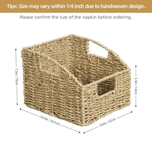 Return Policy Fast Delivery Trusted seller 2-Pack Seagrass Wicker Baskets for Storage, Trapezoid Decorative Baskets with Handles, Hand Woven Pantry Baskets, Open-Front Storage Baskets for Shelves, 8.4"L x 10.2"W x 7.4"H Product Description Product Dimensions: A package contains two storage baskets. They have two built-in handles. They measure 8.4 inch lengthwise, 10.2 inch widthwise, and 7.4 inch heightwise. Due to being handmade, sizes may vary by 1/4 inch Open-Front Design: The wicker storage baskets with low fronts and unique hand-woven weave not only add to the aesthetic and decorative appeal of the baskets, but also allow for better visibility and accessibility of the wicker baskets, making it easier to place and retrieve items Practical Function: Each pantry basket has 3 handles that can be lifted and pulled from the front or sides, making it easy to carry items from the shelf to the countertop. The woven baskets for shelving are made with a sturdy metal frame for durability Storage of Various Items: This multifunctional storage basket is perfect for storing spices, tinned food, pet food, baking ingredients, seeds and nuts, as well as personal care products, stationery, remote controls, CDs and small items Versatile Applications: You can organize your room with this hand-woven natural wicker storage basket to save space and keep it neat. It is ideal for living room, kitchen, bathroom, bedroom, living room, office Shipping Returns Payment Shipping Shipping is FREE to all addresses other than APO/PO boxes in the lower 48 states. All our stock ships from US-based warehouses. Shipped via USPS or UPS (depending on location and package weight) Unless stated otherwise, all orders will ship within 24-72 hours of your payment being processed. Check our feedback to see the great reviews of FAST shipping we offer. Returns Seller does not accept returns Payment We currently accept payment via eBay managed payments only. Once payment is cleared, we will dispatch your shipment within 1-3 business days. Please refer to the "Shipping" tab for more information regarding shipping speed to your destination.