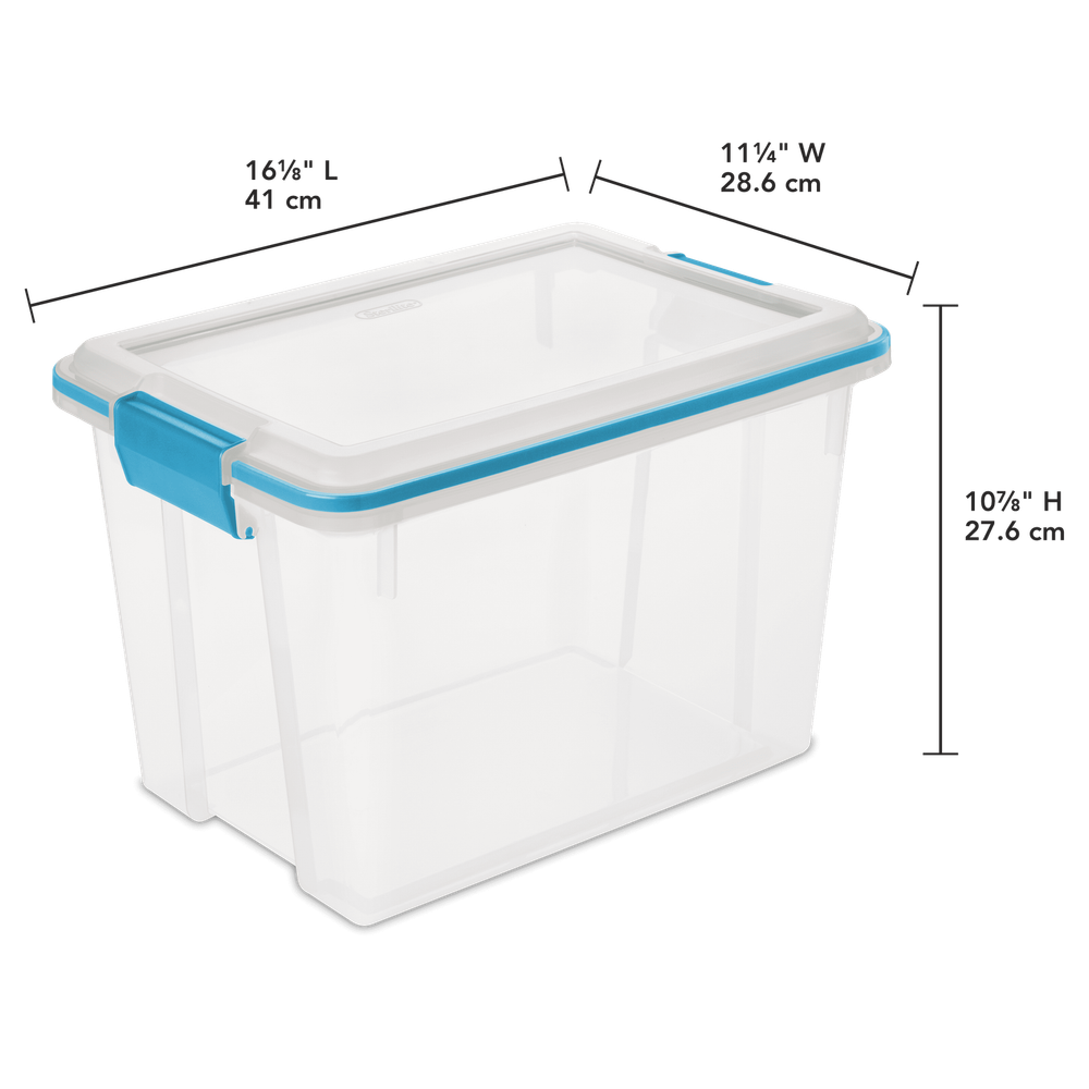 Sterilite's Gasket Box line is the ideal storage solution for keepsakes, photographs, important documents, linens, and other items that need to be stored away and protected. Gasket Boxes offer a gasketed seal to safeguard items from both air and moisture, keeping those special belongings safe from the elements, dust and pests. Durable, tight-fitting latches keep the lid secured to the base, and the clear lid and base allow contents to be easily identified, without opening the lid. The 20 Quart size is ideal for organizing school projects, paperwork and photographs that need to be protected, and fits conveniently on 16" wire closet shelving, making it ideal for organizing and storing small items in the closet. The gasketed seal also helps to keep pet food and other bulk foods fresh longer. The Gasket Box line has eight sizes, ranging from 7.5 Qt to 120 Qt, providing a variety of storage options for those items that need to be kept safe as well as for longer term storage needs. The 12 Qt and 20 Qt Gasket Boxes use the same lid, allowing both the shallow and deep sizes to be stacked in same footprint. The overall assembled dimensions of this item are 16 1/8" L x 11 1/4" W x 10 7/8" H. Sterilite 20 Quart Gasket Box, Weather-Resistant Clear Storage Bin with Lid, Blue Outside Dimensions: 16 1/8" x 11 1/4" x 10 7/8" Interior Dimensions at bottom: 12" x 8 5/8" x 9 5/8" Ideal solution for those items that need to be stored away and protected Gasketed seal safeguards items from air and moisture, dust and pests Durable, tight-fitting latches keep the lid secured to the base Clear base and lid allow for easy identification of contents, without having to open it BPA-free and phthalate-free