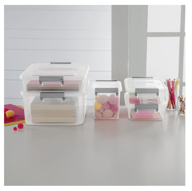 (2 pack) Sterilite 2.7 Qt. Modular Latch Box Plastic, Titanium Product details Sterilite's Modular Latch Boxes help make small storage organization easy! Available in a wide range of sizes and designed to stack and use vertical storage space efficiently. The color accented write-on latches keep the covers secured to the base while providing a space for labeling, making personalization simple! Label by contents, activity, or by name, use a dry-erase marker to erase and re-label as necessary or apply a standard adhesive label. Use the 2.7 Qt size for organizing closets, craft areas, play rooms, office spaces, bathrooms, workshops and more! Keep health and beauty items, accessories, and craft supplies, neat and contained, where they are most frequently used. Its clear base and lid allow items to be viewed from any angle. The 2.7 Qt and 5.5 Qt have the same size lid, allowing shallow and deep containers to stack in the same footprint. The overall assembled dimensions of this item are 11 3/4" L x 7 3/8" W x 3 1/4" H. About this item Sterilite Adult Plastic 2.7 Qt. Modular Latch Box Titanium: Outside Dimensions: 11 3/4" x 7 3/8" x 3 1/4" Use the 2.7 Qt size for organizing your living spaces - store health and beauty items, accessories, craft supplies, and more Single unit option Clear base and lid allow contents to be viewed at a glance, making them easy to find - Titanium Interior Dimensions at bottom: 9 1/2" x 6" x 2 5/8" Write-on ID Latches make personalizing storage easy Ideal for a variety of small storage needs Dry-erase markers easily erase if relabeling is needed Stack for efficient use of vertical storage space BPA-free and phthalate-free
