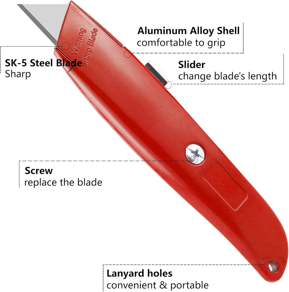 WHAT YOU WANTED: Economical and disposable box cutting blades.Comfortable grip and wider retractable blade. WIDELY USED:Ready to use, cut and toss or keep some around as a spare utility knife in your garage, tool kit, home and office. MORE WIDER BLADE - Heavy Duty Ideal for Thicker Cuts. Use for commercial or industrial applications like thicker paper, tape, plastic, cardboard, balsa, bass wood, photos, coupons, cardstock, mat board, foam board, delicate fabrics, crafts, amazon, ups or post office packages. SAFETY & EASY: Razor blade for deep exact cuts. Prevent blade slipping with the safety lock tab. PACKAGE CONTAINS: 2-piece heavy duty retractable box cutters. The utility knife has 8 different colors among which black, blue, green, orange, pink, red, silver and yellow. Please choose the one you prefer. Product Description DIYSELF———WELL WORTHY BRAND DIYSELF is a professional manufacturer of office products and household tools. We have our own factory and professional designers. Our products are carefully crafted by experienced workmen. We are committed to providing our customers with quality products and perfect service. Ultra Sharp Box Cutter The utility knife blade is made of SK-5 high carbon steel, trapezoid-shaped blade. The blade is thicker than the normal utility knife, the heavy-duty box cutters are more sharp and more durable. Premium Utility Knife Replace The Blades Easily The shell of the box cutter knife is made of aluminum alloy, comfortable to hold. As long as you use a screwdriver, you can replace the razor blades. When replacing the blade, you'd better wear gloves. Box Cutters Retractable Press and hold the slider to change the blade length. Different blade lengths help you cut different materials, easy and convenient. Heavy-Duty Utility Knife For What You Need The durable box cutter is perfect for adults and teenagers for daily use, suitable for various occasions, such as workers can use it to open boxes, housewives can use it to open wrappings, students can use it for crafts, and hikers can use it for camping.