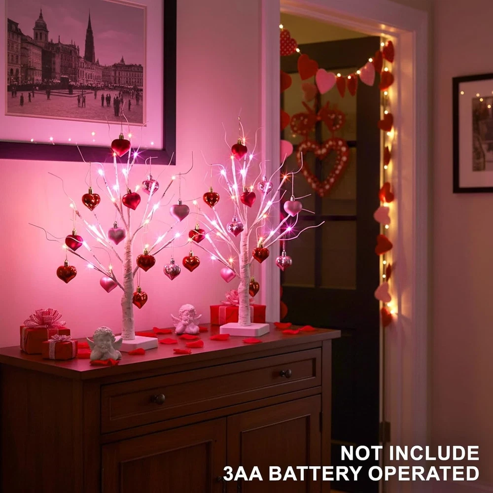 [Valentines Decorations for Home]:24" tall valentines decor birch tree light is embellished with 24 LED bulbs and12 pcs 1.8inch/4.5 cm heart ornaments,each valentines decor tree light is available in 2 different bulbs color (red and pink)and 2 surface style heart ornaments(3 red glossy surface & 3 red matte surface, 3 pink glossy surface & 3 pink matte surface), which is perfectly add more romantic and sweet atmosphere on valentine's day. USB and Battery Powered]:Each Valentines decor tree light provides with two power source options - USB or 3 pcs AA batteries (not included).Using USB interface to connect with power bank,laptop,socket,which can save your time and money.Using 3pcs AA batteries for freely moving the decoration.Attention Please:Please remove USB cable while using batteries in case of damage! [Adjustable Flexible Branches]:Satisfy your personal DIY need with the adjustable branches. you can adjust the shape of artificial valentines decor tree easily after receiving, making it the ideal natural tree shape.The base and branches of valentines birch tree are made of plastic,white branch and trunk are wrapped in electrical,there is an iron wire in each branch.this square base bottom is to ensure that the valentines light up tree stand stably. [Multi-color heart ornaments]:These heart shape ornaments is 4.5 cm in diameter very convenient to use as they come with pre-assembled with gold or silver threads, you can hang them on the branches, tree shirt, windows, Red wine bottle, door handles or other place you like.Add more sweet touch in your home decor!! [Wide range of application]: with a tinge of warmth and romance, the birch tree set is suitable for adorning Valentine's Day, anniversary, New Year and other holidays; besides, it also can be used as indoor decoration to beautify your home, adding fun to your life.