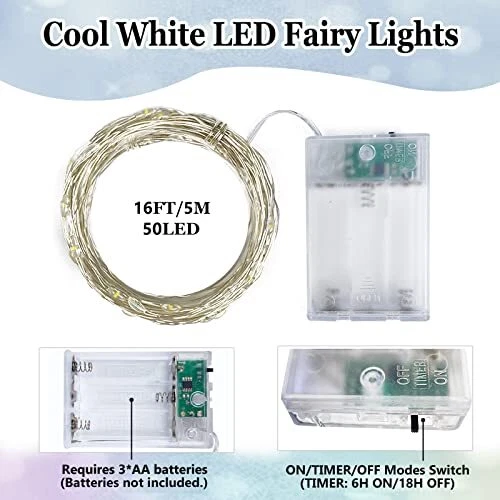 Return Policy Fast Delivery Trusted seller 2-Pack White Fairy Lights Battery Operated with Timer, Waterproof 16FT 50 LED String Lights Outdoor Indoor, Twinkle Lights for Bedroom Dorm Wedding Birthday Christmas Parties Centerpiece (Cool White) Product Description Fairy Lights with Timer: With built-in timer IC, when you power on the indoor string lights at timer position, the fairy lights will be on for six hours off for eighteen hours repeated everyday as long as batteries’ power is enough. Free your hands from turning on/off all the time and safe energy Ultra-bright and Durable Battery Fairy Lights: Made with ultra-bright LED and durable silver wire, the battery operated lights can last long and will be an ideal choice for classroom, dorm, bedroom and home décor. Each set contains two battery lights. Each battery powered lights length is sixteen feet with fifty LEDs. AA battery case, batteries not included Waterproof LED String Lights: With IP44 waterproof design, the silver wire battery fairy lights can keep shinning even under wet condition, ideal for indoor outdoor home decor. The battery case is a regular case and should be covered from rain/snow when used outside Easy Operation and Portable: The battery twinkle lights are very easy to use. Just put AA batteries inside the battery case with correct polarities and slide the switch ON/OFF/TIMER. With its small size, you can take the timer fairy lights anyw conveniently for a romantic trip and it is easy to hide into your design works Flexiable and Cuttable Battery Fairy Lights: With the bendable wire, the battery string lights are easy to shape and wrap around various objects, such as furniture, plants, or decorations. These twinkle lights are also cuttable, allowing them to be trimmed to the desired length without compromising their functionality Widely Application For Indoor Outdoor Use: The mini battery lights string can be widely used for classroom, dorm, girl's bedroom, home, wedding, garden, and centerpiece. It's also a good room dorm decor for students, creating a warm and cozy atmosp for school night Outstanding Customer Service: If you have any question or problem about our product, please feel free to contact us and our customer service team will respond you in twenty-four hours Shipping Returns Payment Shipping Shipping is FREE to all addresses other than APO/PO boxes in the lower 48 states. All our stock ships from US-based warehouses. Shipped via USPS or UPS (depending on location and package weight) Unless stated otherwise, all orders will ship within 24-72 hours of your payment being processed. Check our feedback to see the great reviews of FAST shipping we offer. Returns Seller does not accept returns Payment We currently accept payment via eBay managed payments only. Once payment is cleared, we will dispatch your shipment within 1-3 business days. Please refer to the "Shipping" tab for more information regarding shipping speed to your destination.