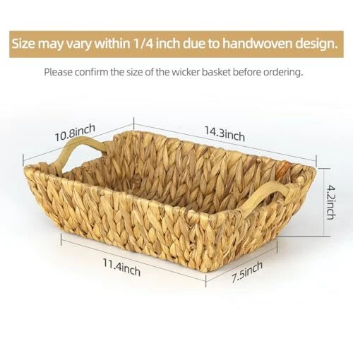 Return Policy Fast Delivery Trusted seller 2-Pack Wicker Baskets with Wooden Handles, Hand-Woven Water Hyacinth Wicker Baskets, Storage Baskets for Organizing, Decorative Woven Basket for Bedroom, Living Room, Bathroom, Shelves Product Description Handmade: This Wicker basket is carefully crafted by skilled artisans, using a hand-weaving design.Natural wicker baskets can add beauty and style to your home Natural Material: Made entirely of natural water hyacinth, this hand-knitted wicker basket is not only natural and environmentally friendly, but each water hyacinth basket is a unique craft Convenient Handles: The Wicker storage baskets with thickened wooden handles on both sides, easy to carry and move around as needed. The handles also add a decorative touch to the overall design Multiple-use Woven Basket: These hyacinth storage baskets are ideal for books, magazines, toilet papers, towels, makeups, fruits, snacks storage. Additionally, it can be used in bathrooms, vanities, entryway tables, bookshelves, kitchen counters, or office desks, demonstrating its versatility in numerous situations Product Size: 2 Pack wicker baskets for organizing size: 14.3"" Length x 10.8"" Width x 4.2"" Height. This rectangle wicker baskets for shelves fits all people, if you have questions, please contract us for immediate assistance Shipping Returns Payment Shipping Shipping is FREE to all addresses other than APO/PO boxes in the lower 48 states. All our stock ships from US-based warehouses. Shipped via USPS or UPS (depending on location and package weight) Unless stated otherwise, all orders will ship within 24-72 hours of your payment being processed. Check our feedback to see the great reviews of FAST shipping we offer. Returns Seller does not accept returns Payment We currently accept payment via eBay managed payments only. Once payment is cleared, we will dispatch your shipment within 1-3 business days. Please refer to the "Shipping" tab for more information regarding shipping speed to your destination.