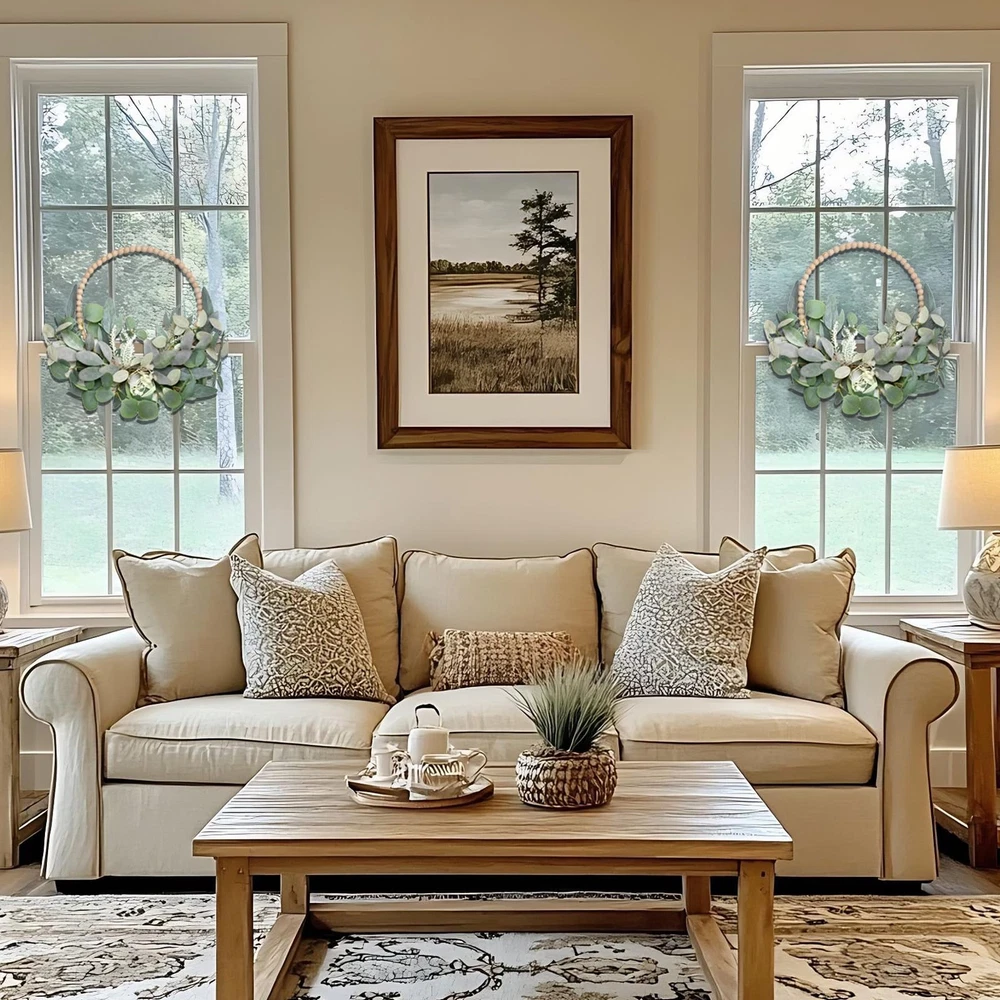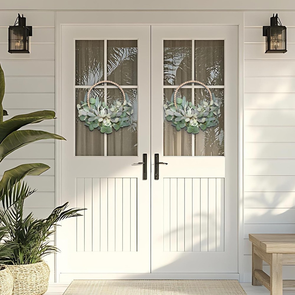 Spring/Summer Wreath DESIGN FEATURES: 16-inch wooden bead wreath paired with artificial eucalyptus leaves creates an elegant and natural-looking door decoration VERSATILE DECOR: Perfect for front door, wall, mantel, or window display during spring, holidays, or year-round home decoration.You can also diy and add your favorite elements to create your own wreaths DUAL WREATH SET: Includes two matching wreaths, offering excellent value and allowing for coordinated decorating throughout your space MAINTENANCE FREE: Artificial eucalyptus leaves maintain their fresh appearance without watering or upkeep, perfect for lasting seasonal decor RUSTIC CHARM: Natural-looking wooden beads combined with lifelike greenery bring farmhouse-style warmth to any indoor or outdoor setting