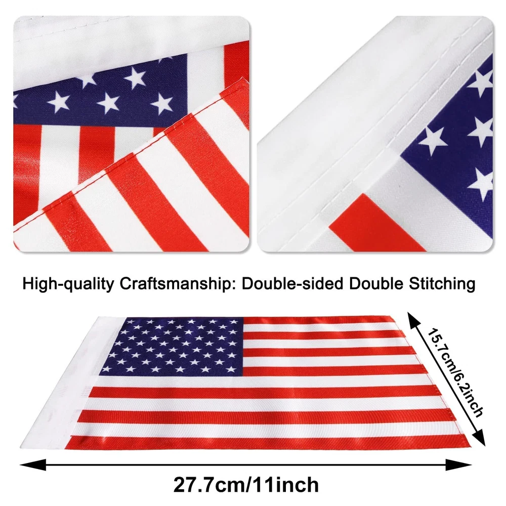 Describe: Product parameter Apply to UTV flagpole and motorcycle flagpole for 3/8 diameter poles Product condition:Brand new Size: 6×10 inches Material: polyester material Feature: Professional printing, cutting and sewing Durable material, durable outdoor Each US flag is double-sided and double-stitched Made of machine washable UV coated poplin you can freely fly the American flag and upgrade the appearance of your vehicle Packing: 2 piece of American flags If you have any questions about the product, you can us directly. Appropriate American Flag Size: 6.7 x 10 inches sleeved flag will accommodates up to a 3/8" diameter flagpole. Due to manual measurement, there may be a slight difference in the size of the american flag (Note: Flagpole is not included). Good Quality American Flag: Exquisite double-sided sewing process and double-sided heavy-duty polyester material American flag can withstand harsh outdoor environments. American Flag made of UV coated poplin that is machine washable.It is sturdy enough to handle the toughest weather but still flies in a gentle breeze. Excellent Decor for motorcycle: 6.7 x 10 inches flag is a gift with extraordinary significance to friends and teams who like to ride to decorate their vehicles. Special 6.7 x 10 Motorcycles Flags: Polyester,gorgeous, pure printed American flag, fly your flag proudly in the breeze. Package Include 2 piece of American flags for motorcycle.
