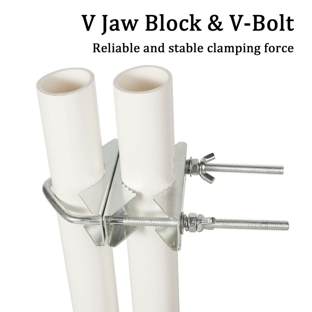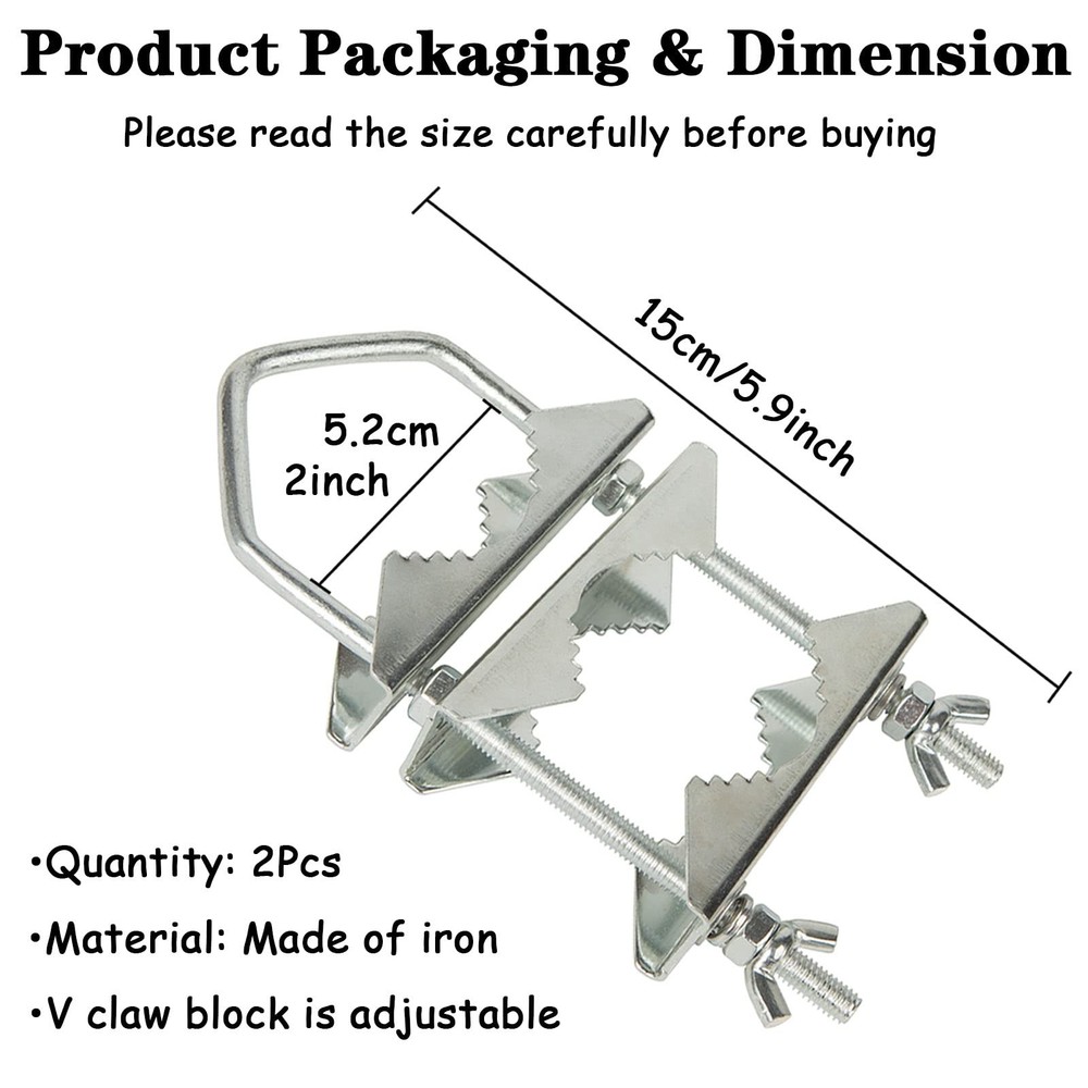 ★Color:Silver. ★Package Contents:2xDouble Antenna Mast Clamp. ★Accessories Include:Clamp V Jaw Block x 6 ; V-Bolt x 2 ; Nut x 8 ; Spring Washer x 4 ; Flat Washer x 4;Butterfly buckle x 4;Wrench x 1. ★This mast mounting clamp is designed to hold most Wifi, PCS, cellular, TV Antennas, CB, Ham, pipe, flag pole, torches, umbrella, parasols, fishing rods. ★Our Promise:If you have any questions about the products or services, please contact us and we will help you. ★PLEASE NOTE: 1. The dimensions are measured manually, there may be some errors, please understand. 2. The different shooting light may cause a slight difference between the color of the object in the picture and the actual object. ★SIZE→ The V-bolt is 5.9"/15CM long, 2"/5.2CM wide, 0.2"/0.5CM thick, and the Jaw Block is 0.04"/0.1CM thick. ★CLAMPABLE RANGE→ The maximum diameter of the clampable round pipe is about 5.0CM/2.0 inches. The maximum diameter of the clip-on square tube is approximately 5.2 cm / 2.0 inches. ★WIDELY USED→ This mast mounting clip design is ideal for supporting TV antennas, TV dividers, cellular, wifi, PCS, ham, garden parasols, flagpoles, torches, fishing rods, pipes, etc. Suitable for building roof or wall, deck, balustrade, balustrade or fence. ★3 ASSEMBLE SETUP OPTIONS→The antenna pipe clamp kit is great for mounting round pipe to another round pipe, square railings to another square railings, or mounting round pipe to square railings. ★MATERIAL→ Heavy duty antenna mast clamps are made of galvanized iron with a rust resistant coating for durability, rust and wear resistance. Can be applied to indoor and outdoor for a long time.