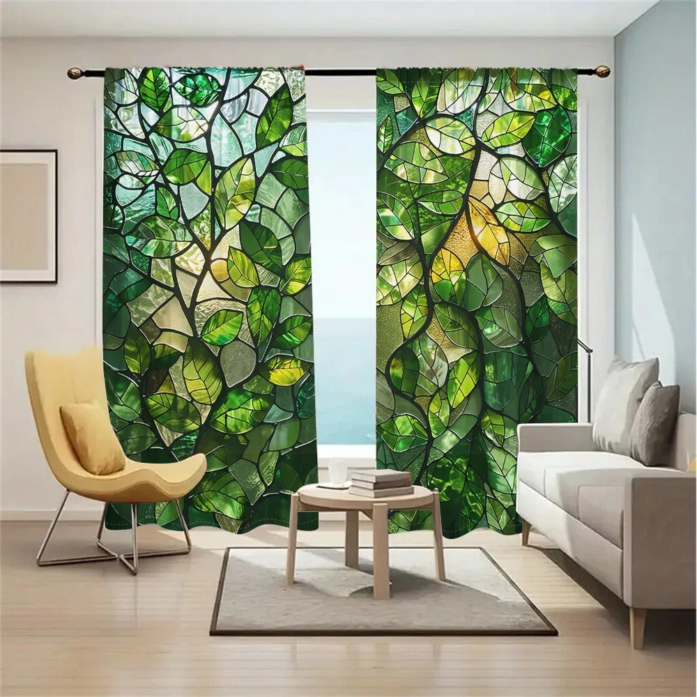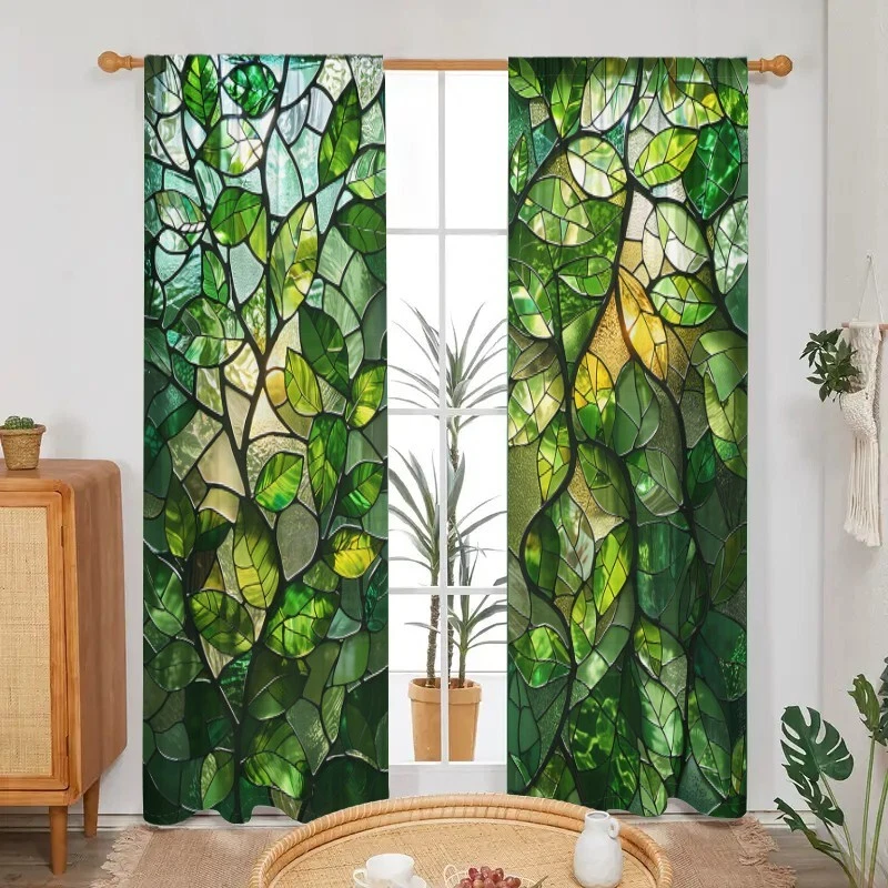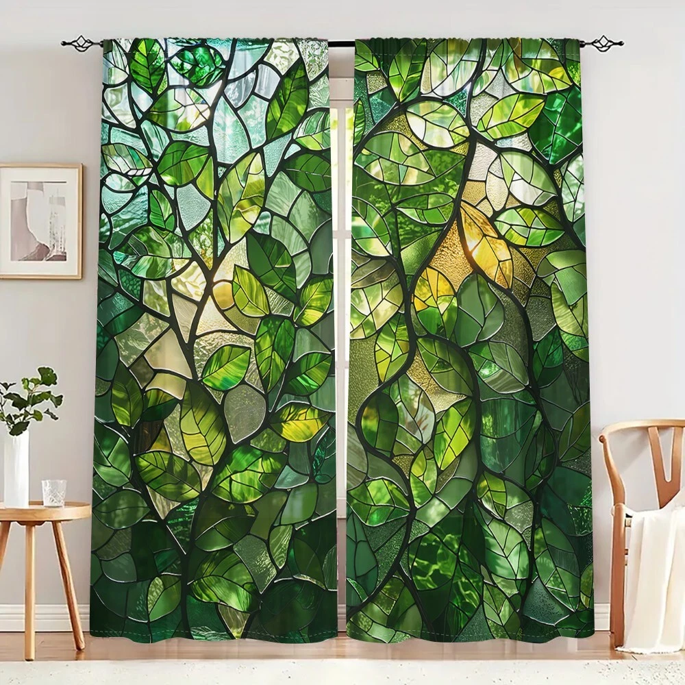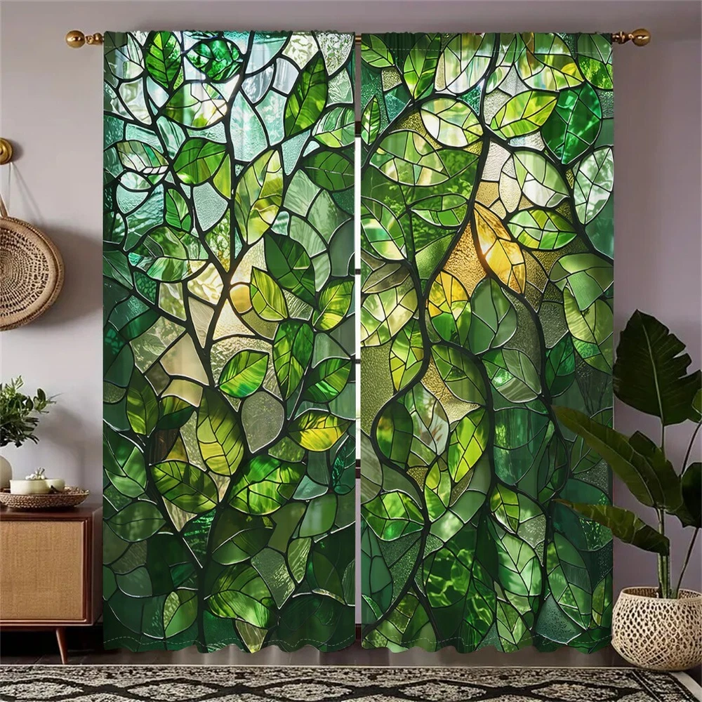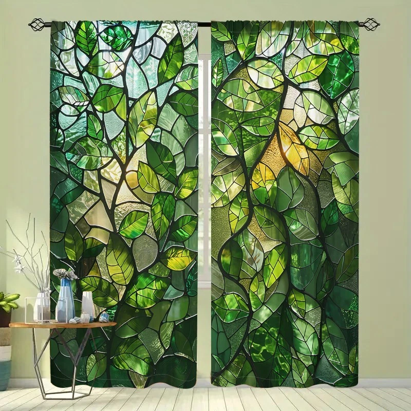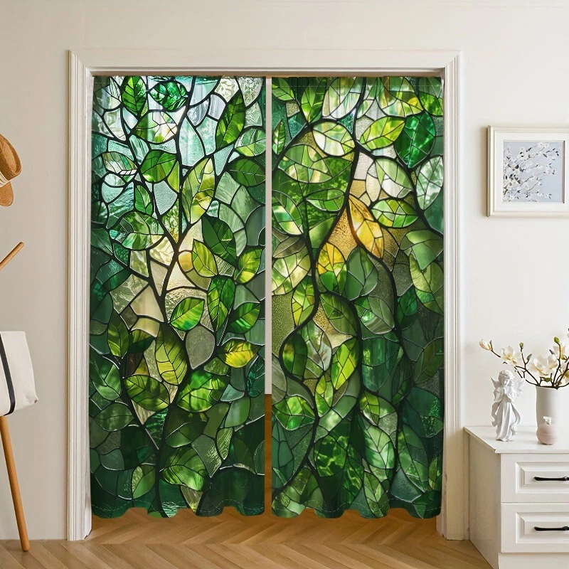 2Pcs Spring Green Leaf Glass Texture Window Curtain Bedroom Living Room Kitchen