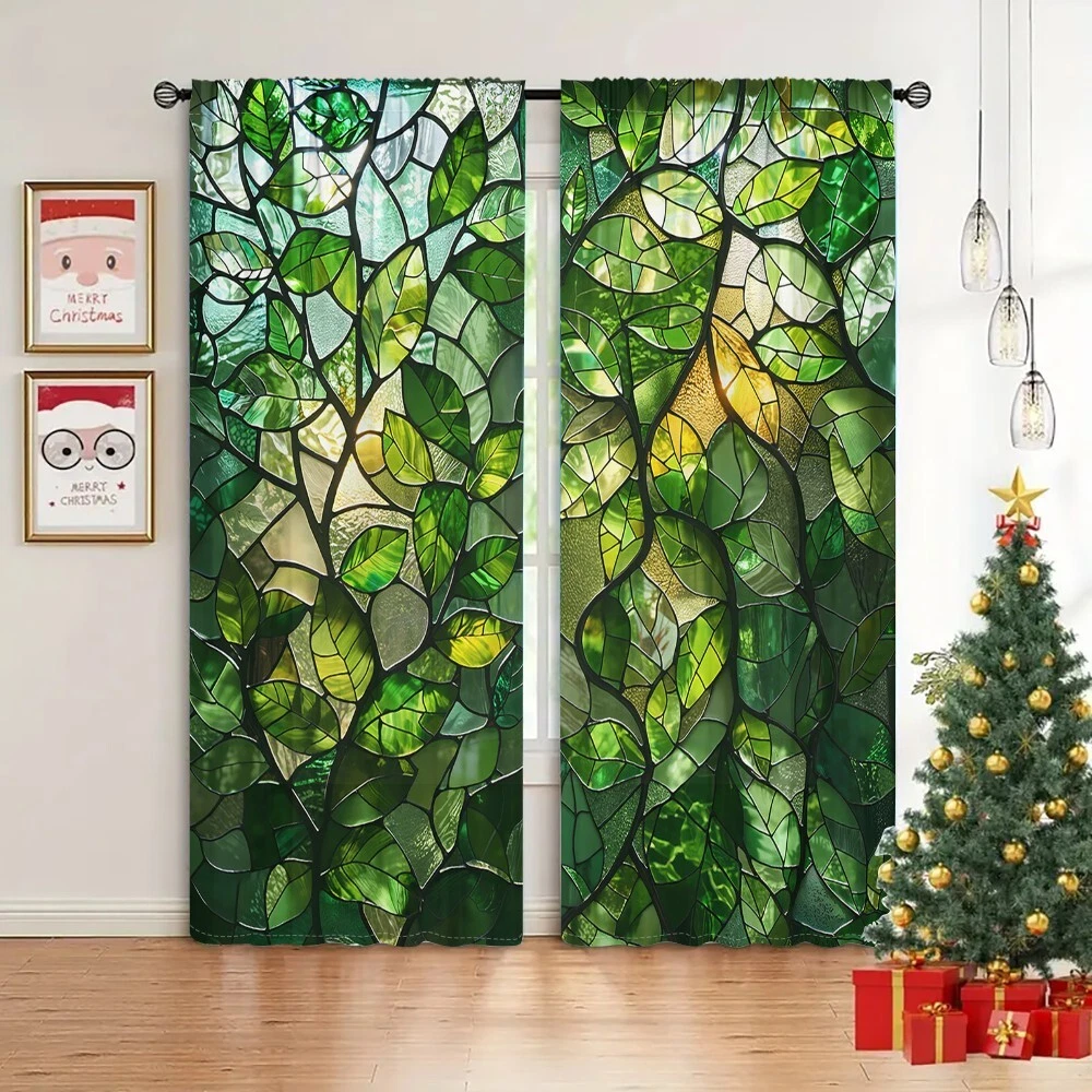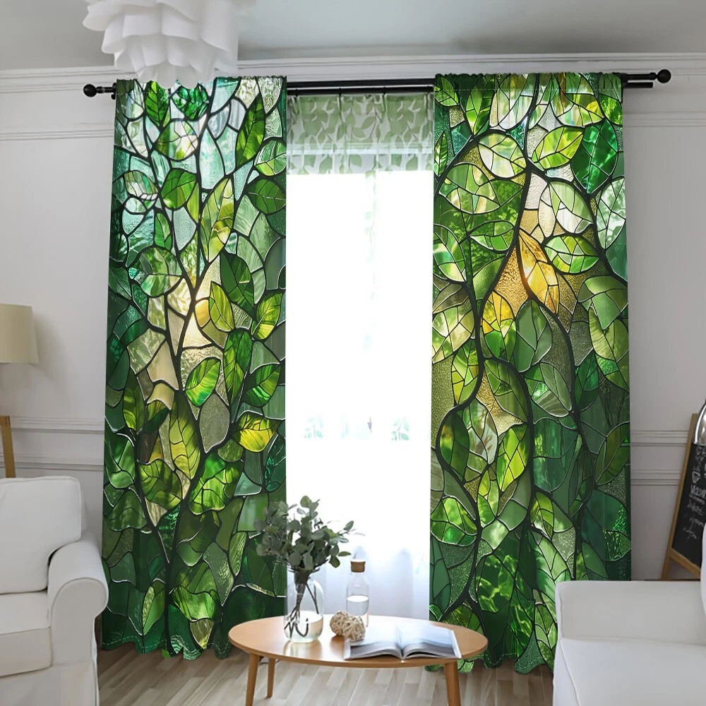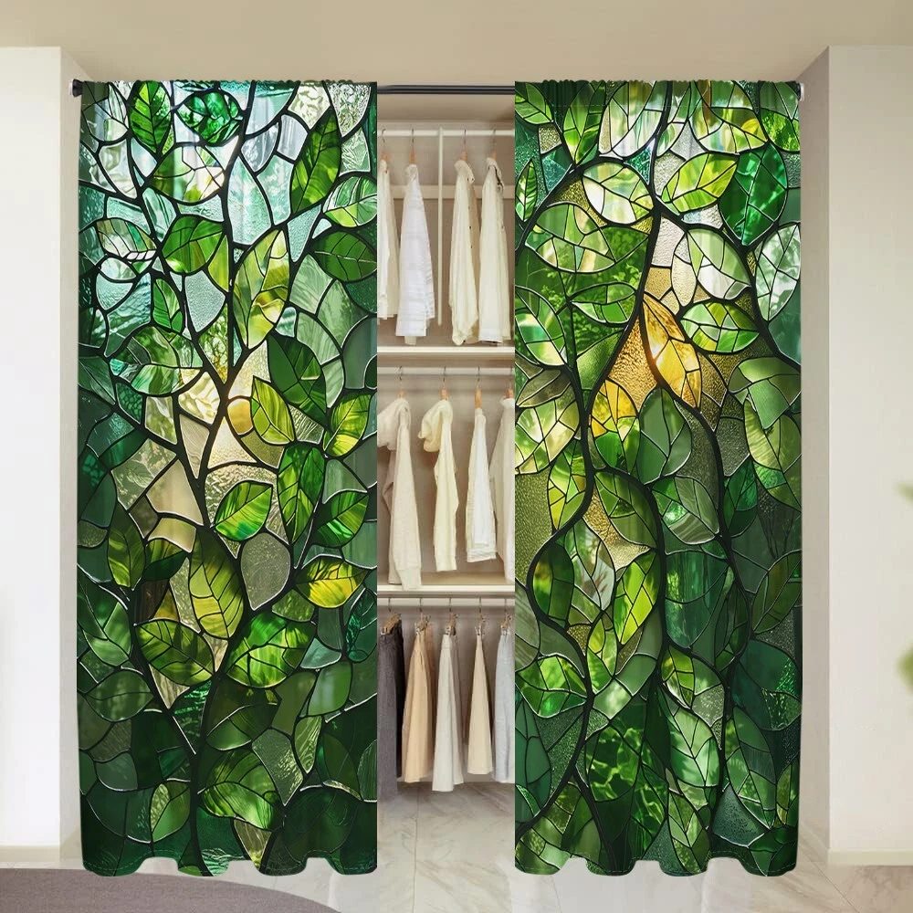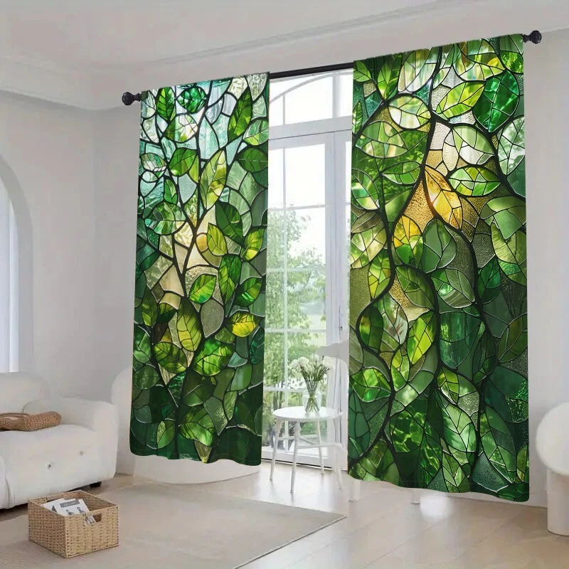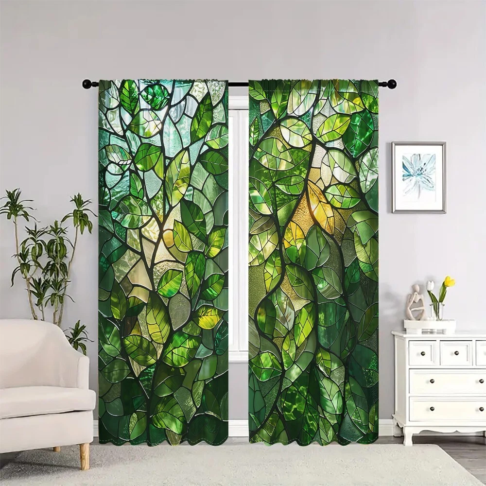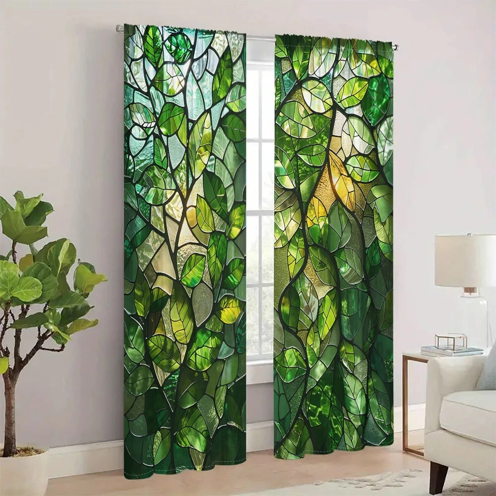 2Pcs Spring Green Leaf Glass Texture Window Curtain Bedroom Living Room Kitchen