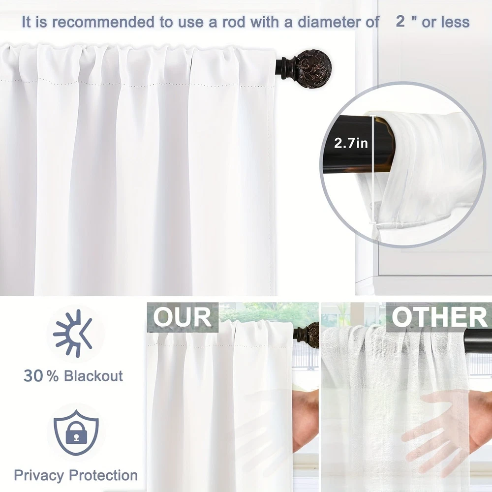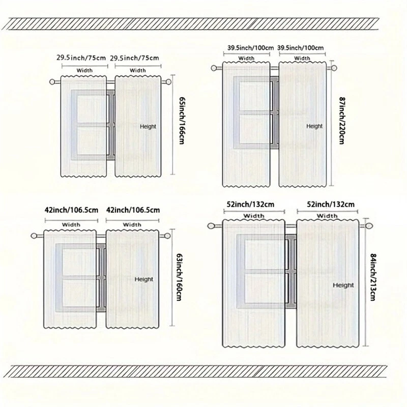 SIZE: 2panels/set 29.5in*65in*2Pcs (each panel 29.5inches wide,65inches height, total 59inches wide 65inches height) 42in*63in*2Pcs (each panel 42inches wide,63inches height, total 84inches wide 63inches height) 39.5in*87in*2Pcs (each panel 39.5inches wide,87inches height, total 79inches wide 87inches height) 52in*84in*2Pcs (each panel 52inches wide,84inches height, total 104inches wide 84inches height) Package Includes: Sold in set,each package includes 2 panels. Material: The curtain is crafted by 100% polyester. Light-filtering curtains block strong light to weaken the light in the room, but also retains enough light to illuminate the room Hanging Methods: The rod pocket interior diameter is about 2.7 inches, that is large enough for most rods in the market making it easy to move the curtain along the rods Easy Care: These curtains can be machine-washed or hand-washed in cold water. Hang dry, and iron at medium setting if needed. Do not scrape the panels with sharp objects.