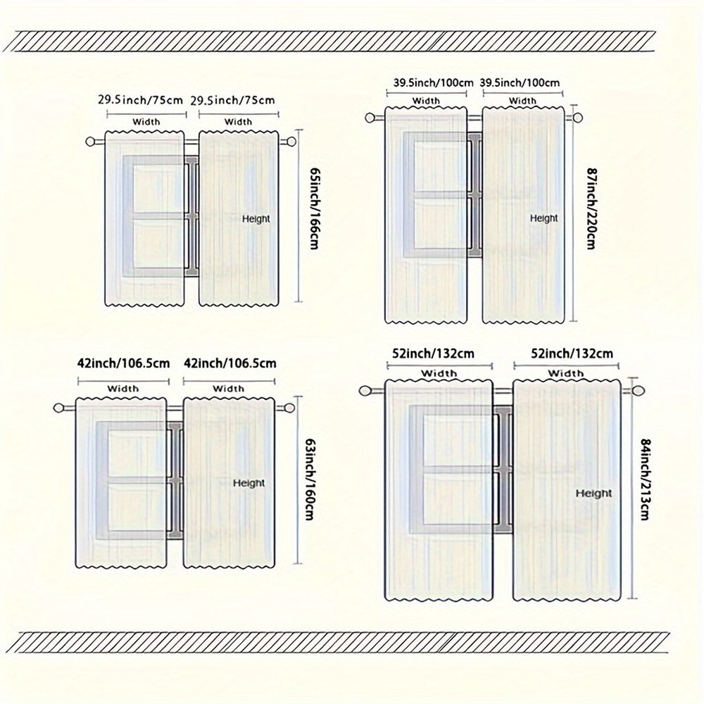 尺寸:2片/套 29.5 英寸 * 65 英寸 * 2 件 (每块面板宽 29.5 英寸,高 65 英寸, 总宽 59 英寸, 高 65 英寸) 39.5 英寸 * 87 英寸 * 2 件 (每块面板宽 29.5 英寸,高 65 英寸, 总宽 79 英寸, 高 87 英寸) 包装包括 :成套出售,每个包装包括 2 个面板。 材质 :窗帘采用 100% 涤纶制成。滤光窗帘可阻挡强光以减弱房间内的光线,但同时保留足够的光线以照亮房间 悬挂方式 :杆袋内径约为 2.7 英寸,足够容纳市场上的大多数杆,从而可以轻松地沿杆移动窗帘 易于护理 :这些窗帘可机洗或冷水手洗。悬挂晾干,如有需要,可中温熨烫。请勿用尖锐物品刮擦窗帘布。