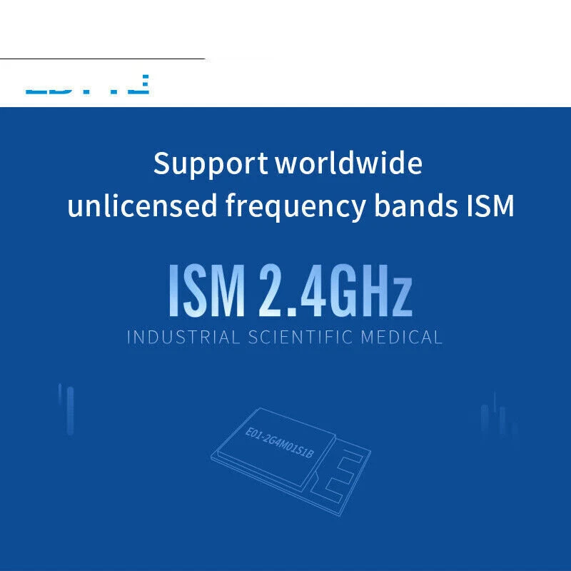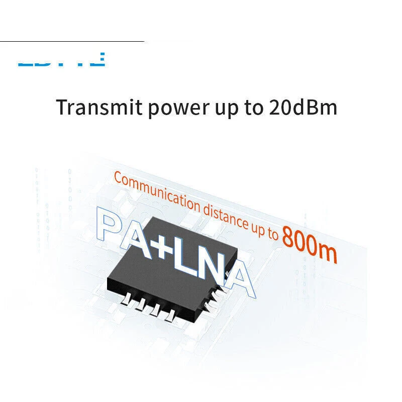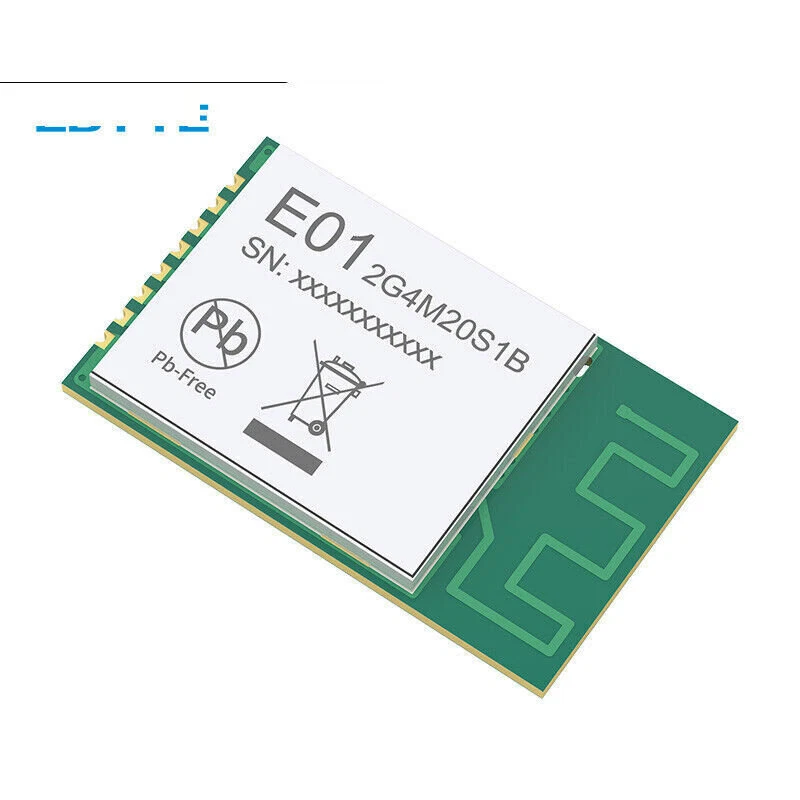 2.4GHz SMD Wireless IoT Transceiver Module 20dBm PCB Antenna nRF24L01 PA LNA Main parameter Description Remark Voltage supply 0~3.6V Voltage over 3.6V will cause permanent damage to module Blocking power -10dBm Chances of burn is slim when modules are used in short distance Working temperature -40 ~85℃ - Distance 800m in open and clear air, at height of 2.5m,air data rate:250kbps FIFO 32Byte Max packet length per time Crystal Frequency 16MHz - Modulation GFSK - Package SMD - Connector Half hole 1.27mm - Communication interface SPI 0-10Mbps Size 23 * 14mm with PCB antenna Antenna PCB antenna 50 ohm impedance match Electronic parameter Min. Typ. Max. Unit Condition Operating voltage 2.0 3.3 3.6 V ≥3.3 V ensures output power Communication level - 3.3 - V For 5V TTL, it may be at risk of burning down TX current - 135 - mA Instant power consumption RX current - 20 - mA - Sleep current 19 19.5 20 μA Software is set 0dBm, built-in pa