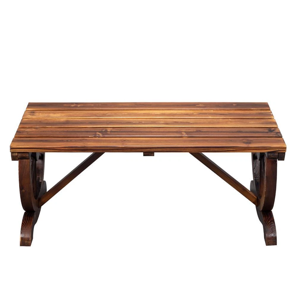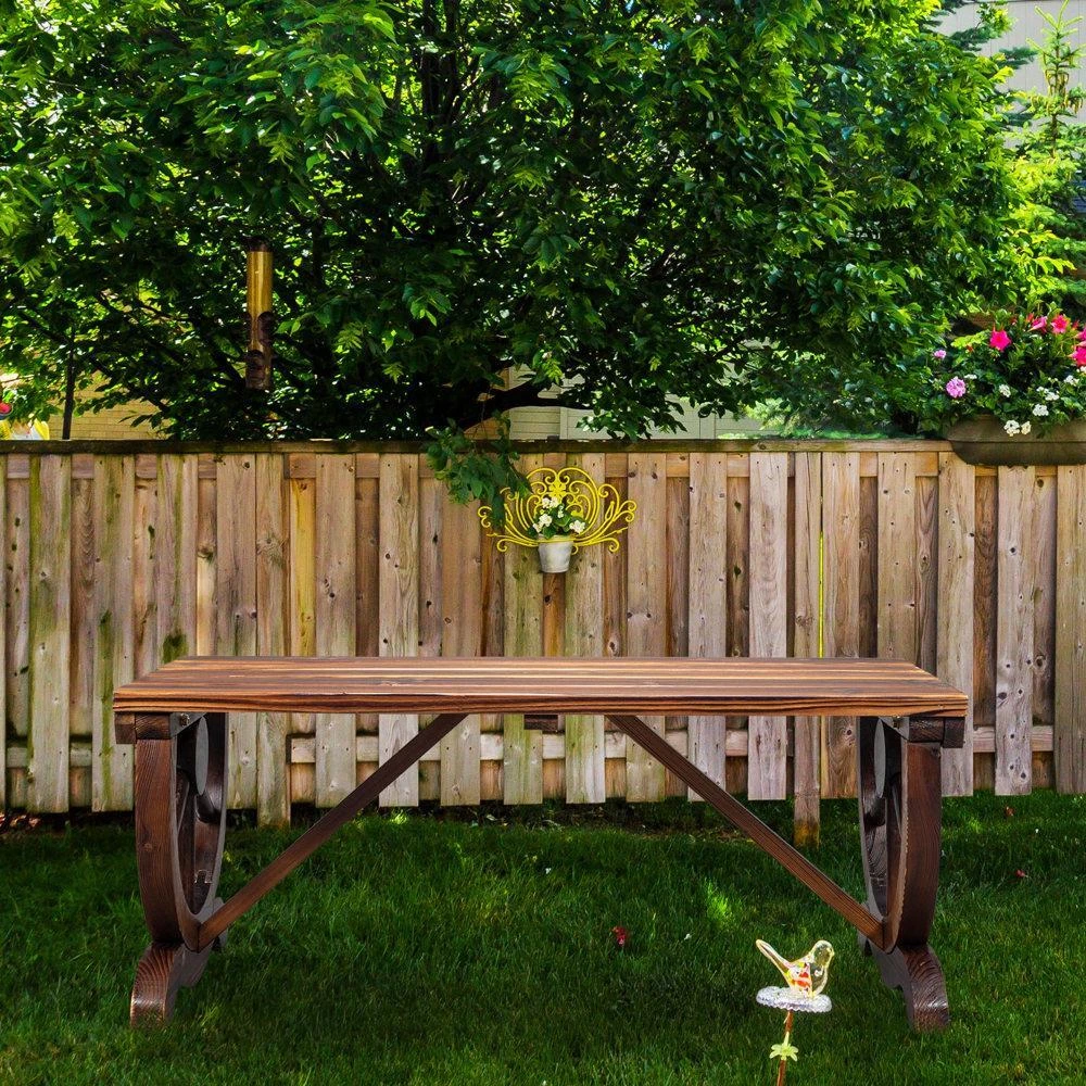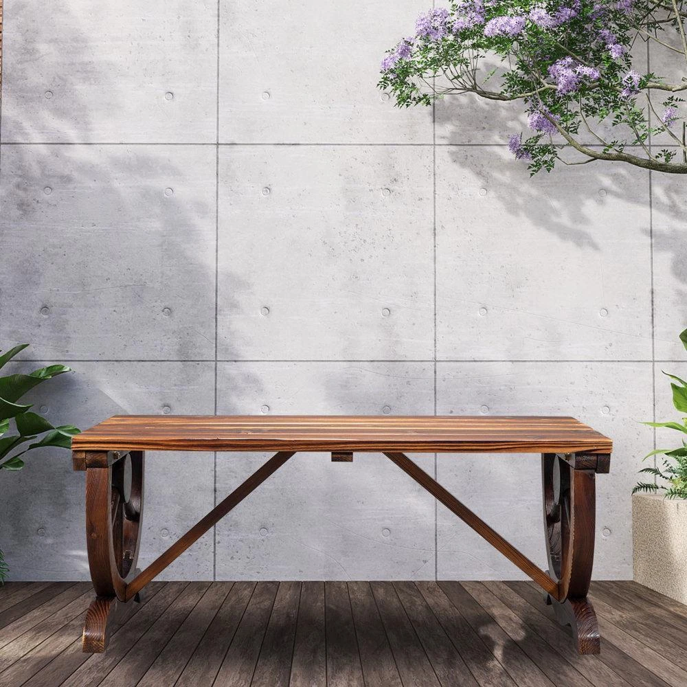 Introductions: On the hunt for a multifunctional garden bench? Our 2-Person Rustic Garden Bench is both practical and attractive. It's not only a useful outside seating, but also doubles as an elegant decoration in your garden. The bench legs are in the shape of wagon wheels, giving this garden furniture a vintage appeal and making it the perfect addition to any outdoor space. Features: 1. An attractive addition to any outdoor space: burnt wood finish creates a rustic farmhouse vibe to your backyard or garden 2. Charming, vintage design: two bench legs are designed into wagon wheels 3. Weather-resistant and long-lasting: charred wood is moisture resistant and insect-repellant, while slatted seat efficiently sheds rainwater 4. Comfortable seat for two: wide enough to seat two adults comfortably 5. Easy assembly: come with complete hardware and instructions Specifications: 1. Dimensions: (38.58 x 19.69 x 15.75)" / (98 x 50 x 40)cm(L x W x H) 2. Material: Fir 3. Color: Brown 4. Weight Capacity: 660 lbs / 300 kg 5. Wagon Wheel Diameter: 19.09" / 48.5cm 6. Net Weight: 18.2 lbs / 8.25 kg 7. Type: 2-Person Bench Package Includes: 1 x Outdoor Bench