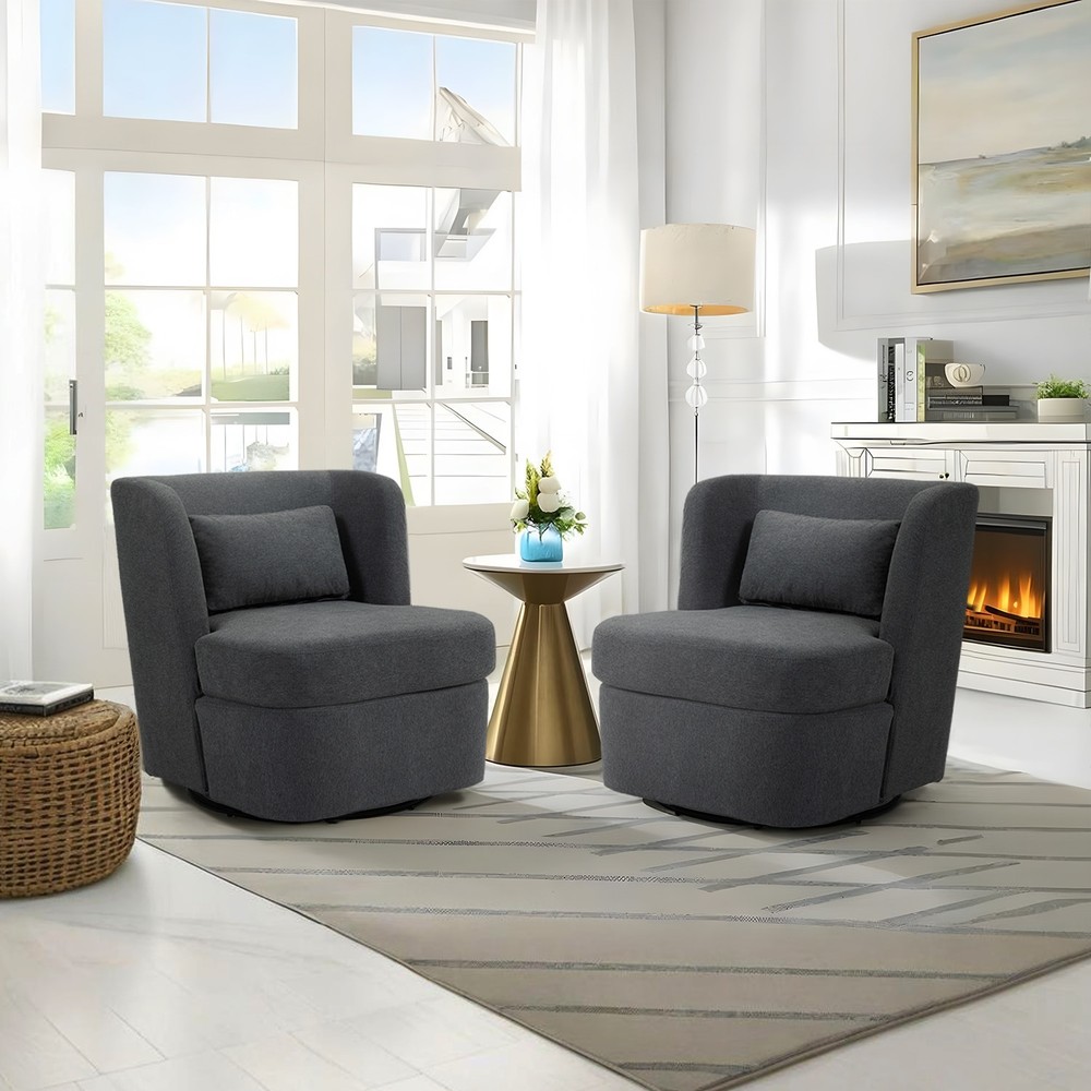 Designed for your leisure comfort, the circular modern armchair can swivel 360 degrees, making the seat more flexible and allowing you to easily adjust your sitting position without getting up. The swivel accent chair is made of comfortable and breathable fabric, with high density foam cushion provides excellent support and durability, which is soft and comfortable. This chair is best for sitting cross-legged while reading a book or curling up to watch TV. The included pillow provides extra support.Product informations: Color: 5 Colors(Gray,Beige,Boucle White,Boucle Gray,Boucle Blue) Products included: 2 Swivel Barrel Chairs Upholstery Material: Cotton and Linen, Boucle Leg Material: 360°Swivel Base Product Dimension: 28.6"W×29.8"D×29.2"H Product Weight: 54.01 lbs Packing Size: Free Shipping Over $49.99* Details 2Set 360°Swivel Barrel Chair with Cushion Product Description: Designed for your leisure comfort, the circular modern armchair can swivel 360 degrees, making the seat more flexible and allowing you to easily adjust your sitting position without getting up. The swivel accent chair is made of comfortable and breathable fabric, with high density foam cushion provides excellent support and durability, which is soft and comfortable. This chair is best for sitting cross-legged while reading a book or curling up to watch TV. The included pillow provides extra support. Product informations: Color5 Colors(Gray,Beige,Boucle White,Boucle Gray,Boucle Blue) Products included2 Swivel Barrel Chairs Upholstery MaterialCotton and Linen, Boucle Leg Material360°Swivel Base Product Dimension28.6"W×29.8"D×29.2"H Product Weight54.01 lbs Packing Size28.35"W×26.77"D×22.05"H Package Weight61.62 lbs Weight capacity:220 lbs Features: This modern chair can be rotated 360°, and has great flexibility in the house. The seat cushion of the chair is filled with a distinctive sponge, which is not only beautiful in appearance, but also more comfortable to ride. The fabric of the chair adopts the rare boucle fabric on the market, which is skin-friendly and soft. And there is also cotton linen fabric that is very durable. The accent chair is a unique decor for various occasions which can lift up the aesthetic of the interior design. Also it is a perfect addition to the hotel lounge, bedroom, living room, office, and nursery room.