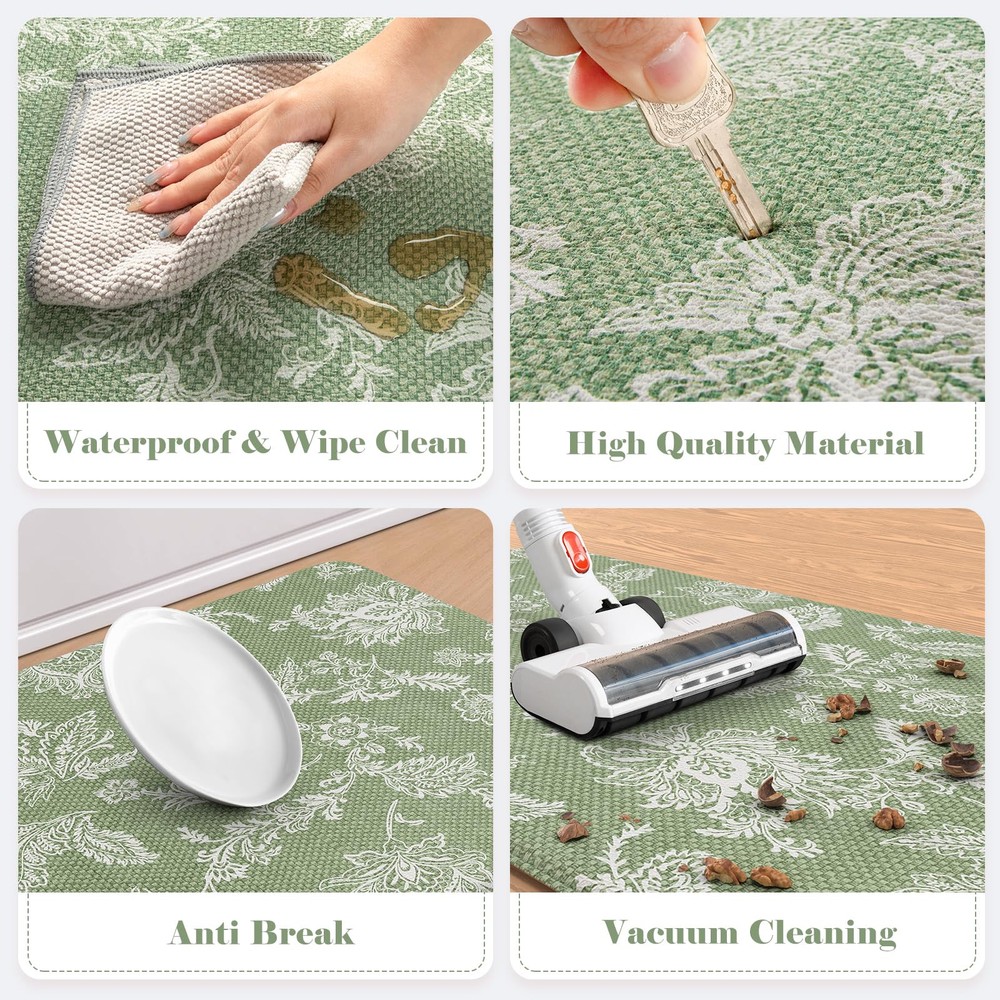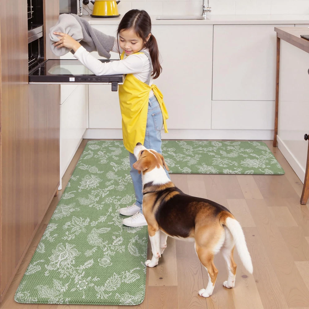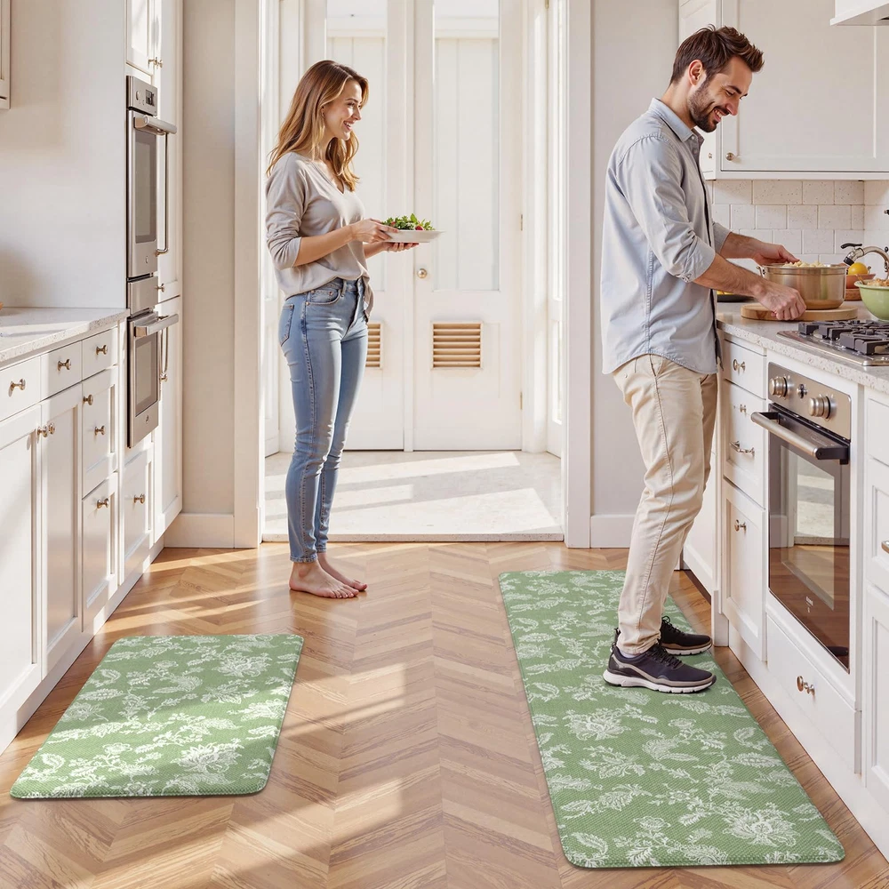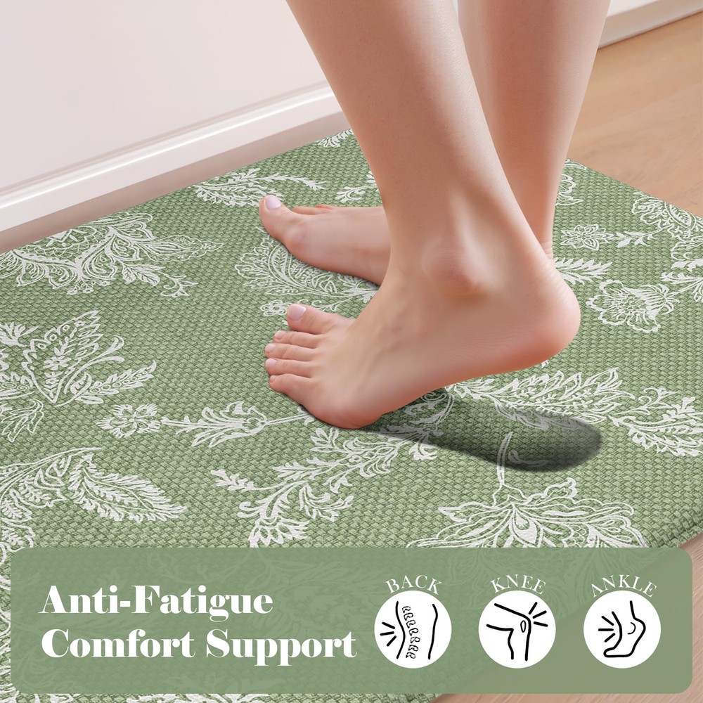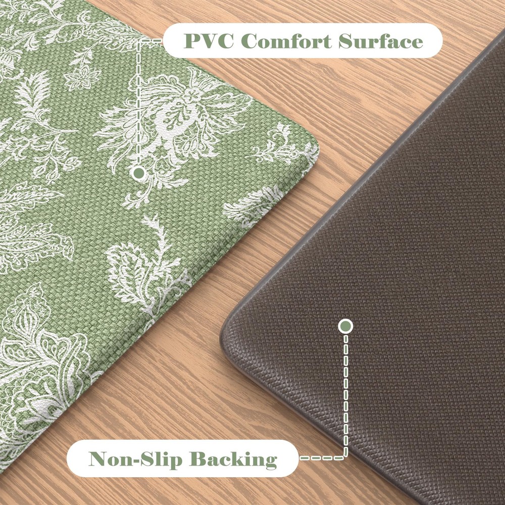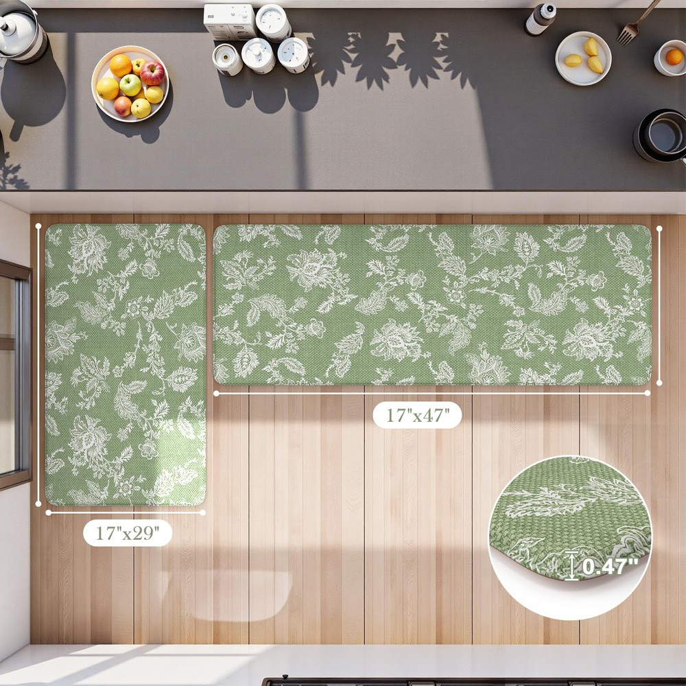 kitchen mats are made by superior quality PVC material,with non-slip rubber backing which ensures a safety using. The anti-fatigue kitchen floor mats provide the ultimate comfort to your feet, saving your back and legs. Make cleaning more convenient,when your kitchen rugs are stained,you just need a wet cloth to wipe out down! Spills are wiped off nicely. Slow-rebound feature protect your fragile porcelain. Thickness:0.47inch (12mm) Surface:High quality durable waterproof material Backing:Non-slip rubber backing Easy to clean:Simply wipe clean with a damp cloth or sponge, use any common household cleaner or sweep clean of dirt and dust,save your time and energy. Anti-Fatigue & Soft:Made of premium PVC materials,the 0.47 inch(12mm) kitchen anti fatigue mat set is cunshioned for standing.It provides comfortable support to improve blood circulation helping your feet not feel tired while being in the kitchen Non Slip & Safety:Our kitchen floor mats are designed of non-skid rubber backing for a better grip to prevent tripping or falling on any surface.Please keep the floor dry when placing the carpet because water under rug may result in slippage Easy Clean & Waterproof:The kitchen rugs anti fatiguet made of PVC material is is waterproof, oil-proofing,stain-resistant and easy to wash off.Simply wipe with a damp cloth or sponge with common household cleaners and it looks as new 2 PCS & Sturdy Material:It comes as a 2-piece set with a large long mat(17"x30") and a smaller one(17"x47") in a package.The kitchen rug set is made of special PVC material, not easily deformed,protecting floors from scratches and stains for long periods Boho & Farmhouse Style:Floral Line anti fatigue mats are decorated with beautiful floral and delicate leaf patterns.The uniquely designed mats are a great addition to the kitchen work spaces enhancing the coziness and natural style of the space