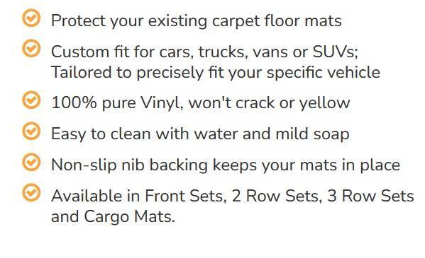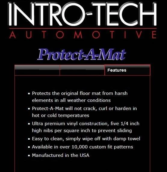 All Season - Great in Winter, Spring, Summer AND Fall Protect-o-Mats Custom Cut Floor Mats Designed to go ON TOP Of and protect your carpet mats ! NOTE: SAMPLE PHOTOS ONLY! Custom Cut for YOUR Vehicle The patterns are created to cover the original OEM floor mats for a vehicle. If your vehicle has had the floor mats replaced in the past, it may not line up exactly. There may be parts of the floor mats not covered if is creates a safety risk to add the thickness of these on top of the mat (such as behind a gas or brake pedal.) Protects the original floor mat from harsh elements in all weather conditions Protect-A-Mat will not crack, curl or harden in hot or cold temperatures Ultra premium vinyl construction, five 1/4 inch high nibs per square inch to prevent sliding Easy to clean, simply wipe off with damp towel Available in over 10,000 custom fit patterns Manufactured in the USA Over 10,000 custom fit patterns, including: full front overalls, rear overalls, cargo / trunk mats for all SUV’s, minivans, cars and trucks All patterns are computer precision cut Made With Pride in the USA Autonotions takes customer care and satisfaction Very Seriously. Making a sale is the easiest part of any transaction. The important thing is to make sure you are pleased with the purchase after the sale. I hope you will take a moment to review my Ebay Feedback and buy with confidence! Thank you for looking at my auction! Additional shipping charges for Hawaii, Puerto Rice, and Alaska. ABOUT AUTONOTIONS: See MORE Great Items we offer in our ebay store: Autonotions We take customer care and satisfaction Very Seriously. Making a sale is the easiest part of any transaction. The important thing is to make sure you are pleased with the purchase after the sale. I hope you will take a moment to review our Ebay Feedback and buy with confidence! Thank you for looking at our ebay item! We are a full line Auto Accessory Store. With over 100 suppliers, we can help you with all of your Accessory Needs. We carry brands like Wheelskins - Lebra - Putco - Bestop - Husky Liners - - Dee Zee - Westin - Bushwacker - Go Rhino - CoverCraft - CarCapsule - Napier Sportz - Intro-Tech - Lloyd - DashCare and many more. To learn more about us, be sure to visit us often. Check out our ebay store: Autonotions . Call us at [phone removed by eBay] HuskyLiners Husky Liners Lund International Rugged Ridge Rubbertite Lloyd Mats Thank you for checking out our Ebay item!