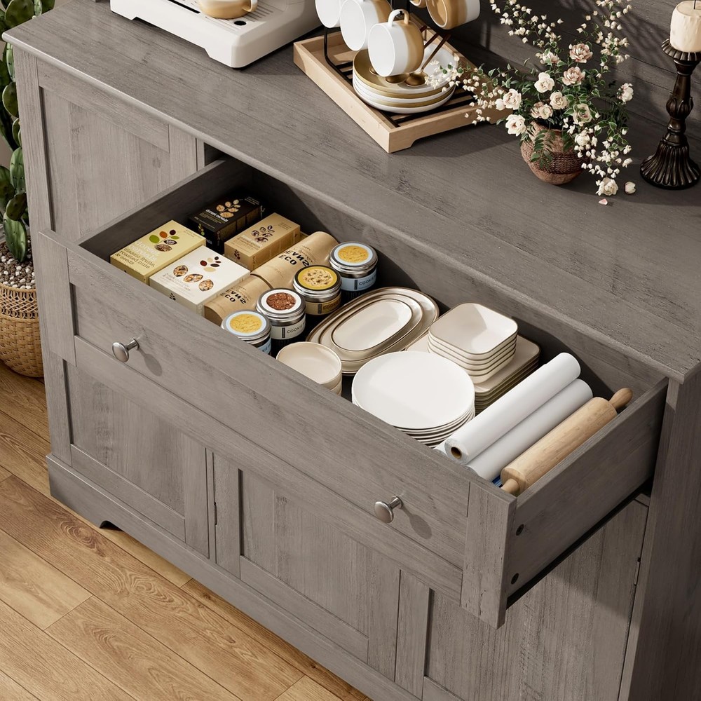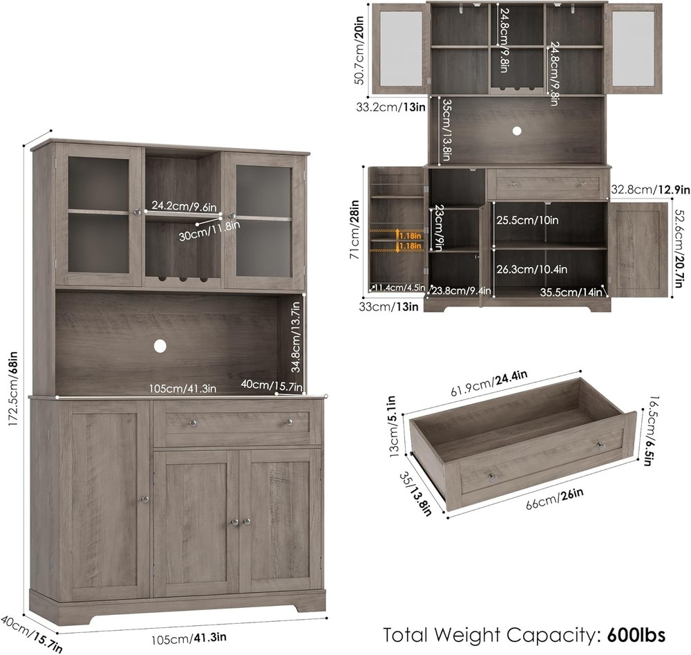 Product Description About this item 2 Pieces Pantry Set: - This elegant 2-piece kitchen set includes one pantry and buffet cabinet, which features large storage capacity designed into multiple open and hidden areas that can perfectly solves the messy storage dilemma in your kitchen All in One Storage Option: Spacious countertop can accommodate effortlessly microwave and coffee maker, while five doors cabinets, one drawer and one built-in wine rack make dust-free yet classified storage from tableware, snacks to kitchen appliances possible Multi Scene: Except being used as food pantry cabinet in kitchen, this hutch cabinet also works well as coffee bar, buffet cabinet in dining room or as bar cabinet in living room - It's the perfect pick that any family will love to fill their home Modern Minimalist: Featuring simple white finish and clean smooth lines, this buffet cabinet with hutch creates a touch of elegant and charming modern vibe, making itself an easy complement to any home style and show your extraordinary taste Crafted To Last: Waterproof painted body togehter with reinforced structure built from high quality engineered wood ensures the kitchen cabinet with superior stablility and durability for long term use and easy maintenance, the tabletop can hold up to 300 lbs Easy Assembly: Hassle-Free Assembly is allowed with straightforward instructions and labled pieces, normally you can finish the kitchen storage cabinet within 3 hours.