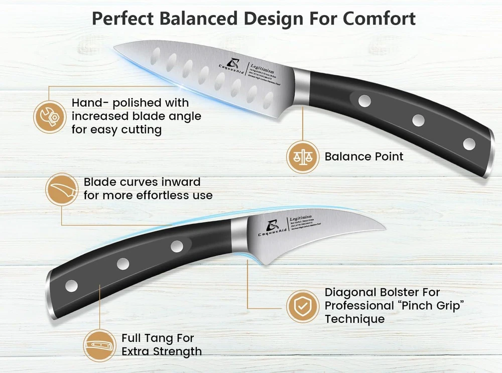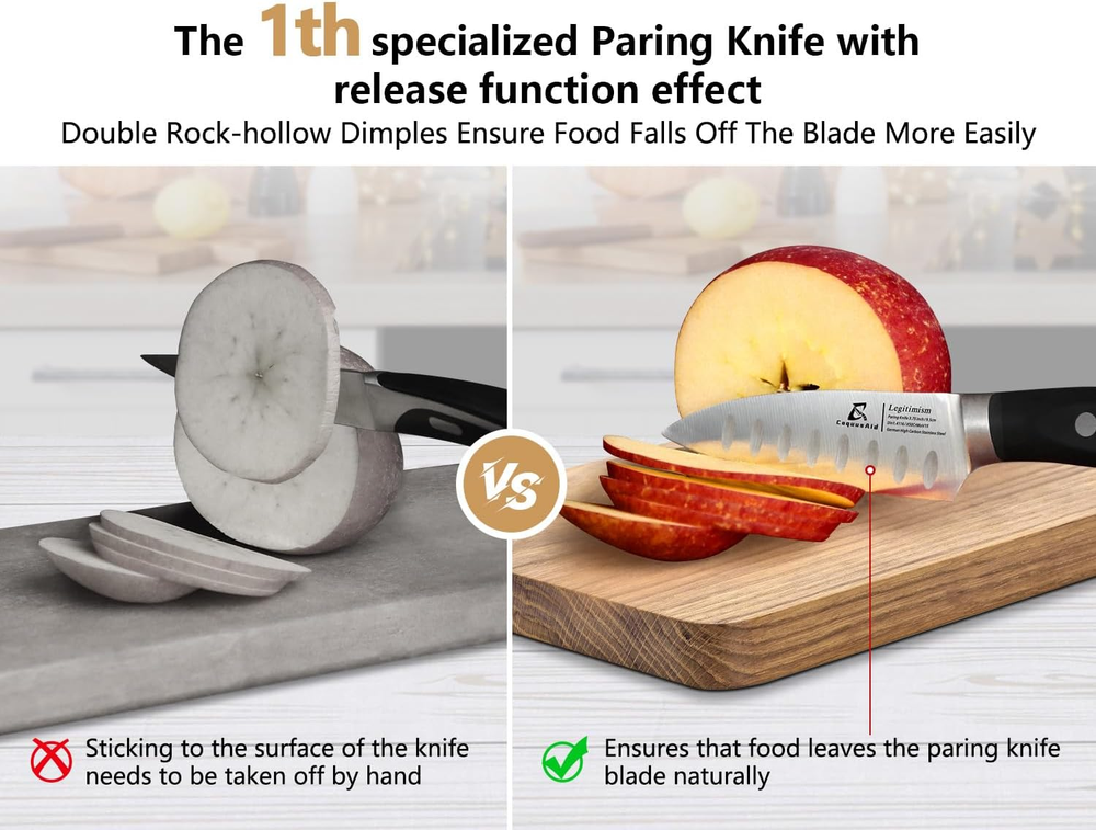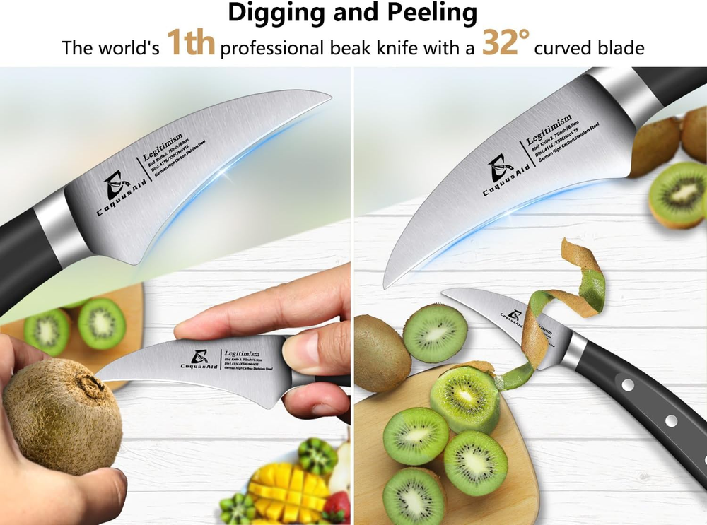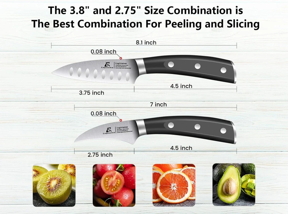 Multi-functional Paring Knife Set:3.8"Paring Knife and 2.75"Bird Beak Paring Knife combination is the best combination for peeling and slicing.For ingredients such as fruit,meat and vegetables in the kitchen, it can perfectly perform paring,chopping, slicing, dicing, shredding and more Paring Knives set:The Fruit & Vegetable Paring Knife Set are made of high-carbon stainless steel and has been finely polished to become very sharp,Easily handles the cutting needs of fruits and vegetables in the kitchen. And you can put the knives in a box and then directly into a drawer to save even more space Anti-slid ergongmic handle and blade:An ergonomically non-slip paring knife set handle can provide a safe grip while cutting. Balanced weight distribution and ergonomic handles minimize fatigue and maximize cutting precision Release function fruit pulp:Double Rock-hollow Dimples Ensure Food Falls Off The Blade More Easily,Solve the problem of food adhering to the blade and needing to be placed by hand,More convenient and hygienic Additional Features:This set of knives can easily chop and slice fruits for better nutrient absorption in juices, as well as create exquisite fruit platters, making eating fruit a pleasurable experience. Additionally, it can be used to carve fruits as a garnish for summer drinks, adding fun and joy to your daily life Product Description 1 Making Salad 2 Ornamental 3 Making Juice 4 Making fruit snacks 5 Convenient storage The video showcases the product in use. The video guides you through product setup. The video compares multiple products. The video shows the product being unpacked. Anti-fatigue Ergonomic design Blade curves inward for more effortless use Concave point design releases food easily Full-tang balance handle, ergonomically designed, Safe and comfortable to use, more durable The Perfect Combination Of High-Quality Materials And Advanced Technology 2PCS Fruit & Vegetable Paring Knife set