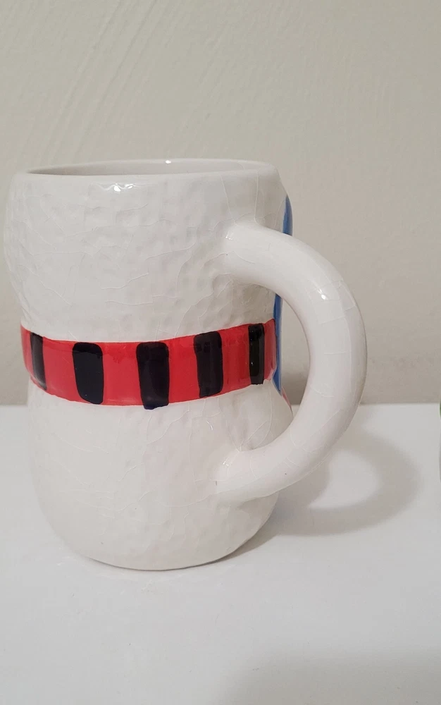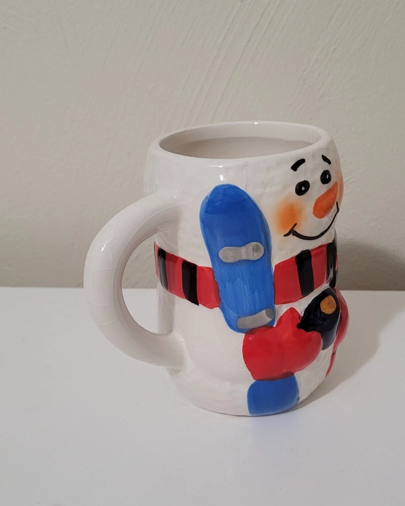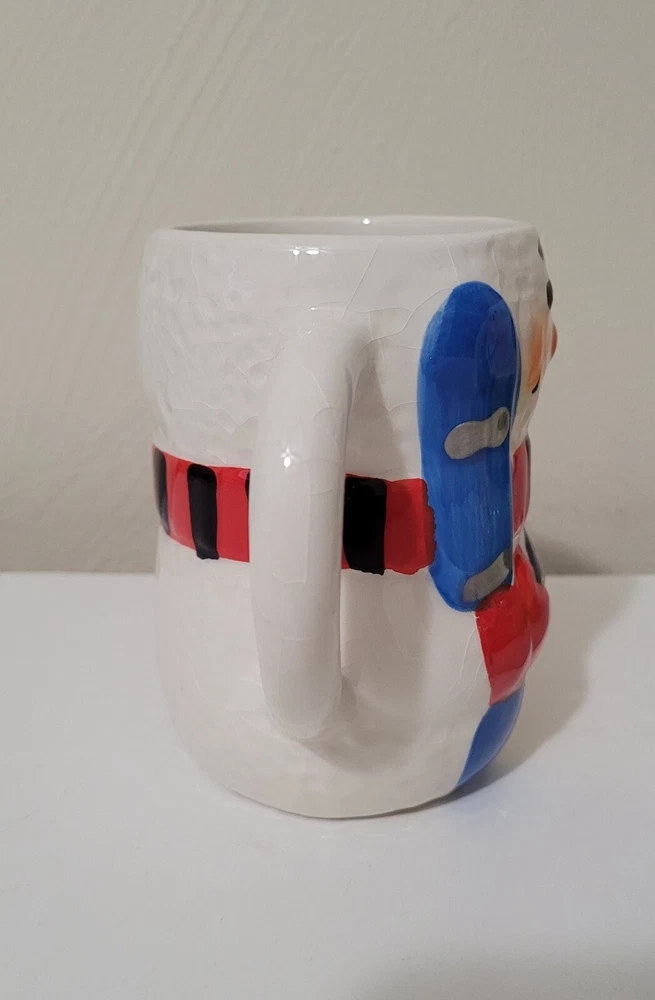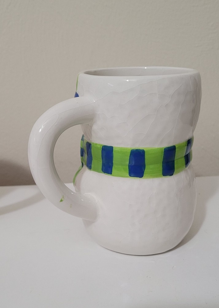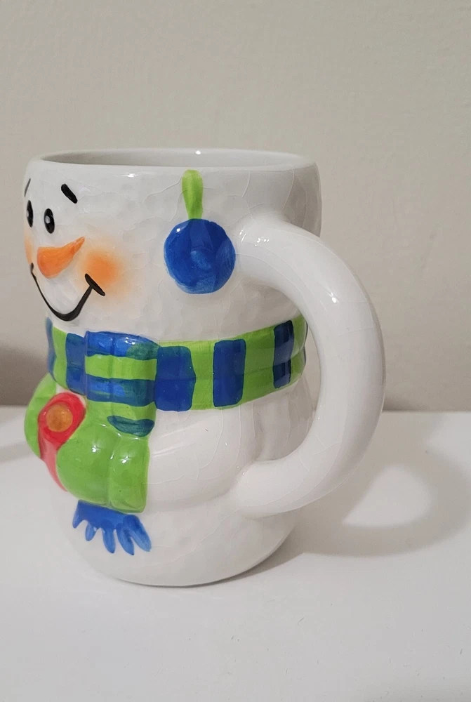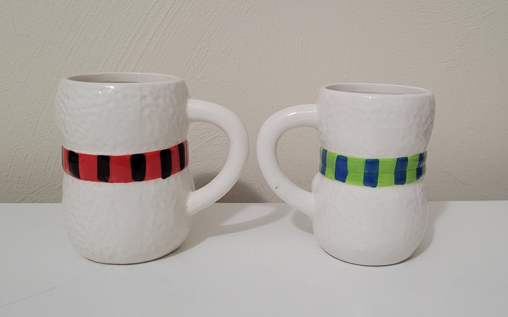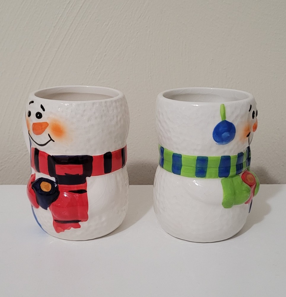 2 Bay Island Christmas/winter Snowman ceramic mugs. 4.5" tall. Painted & crackled effect. Great for hot chocolate, coffee, tea, and more. Like new condition. I don't believe we ever used them. No chips, cracks, etc.