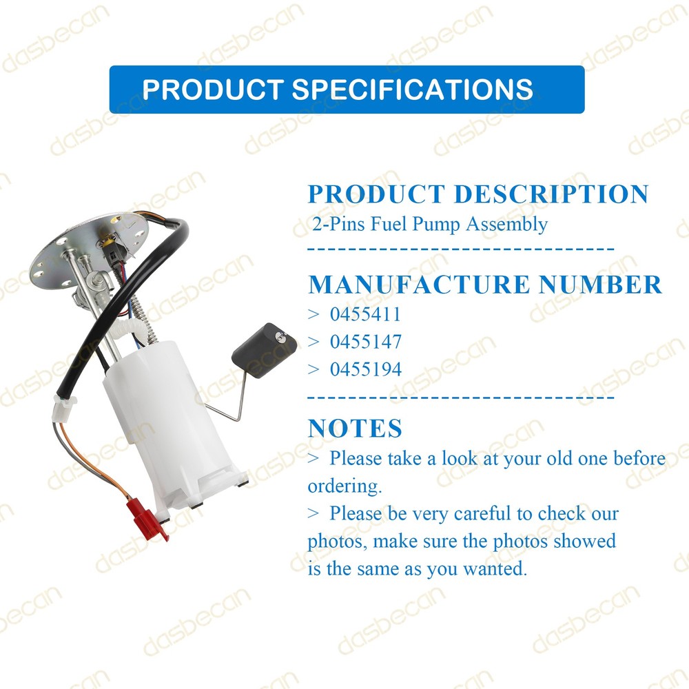Features & details 【Replace OE Number】CA7003, 0455411, 0455147, 0455194 【Compatible With】For 2016-2023 Polaris Outlaw 110 EFI ATV Please check if the picture and part number in the link are the same as your original part. 【 Description 】 Type : Fuel Pump Assembly Warranty: 1 Year Fuel Type: Gasoline Condition: 100% Brand New Fitment Type: Direct Replacement Color: As Pictures Shown Long service life and stable performance. Strict quality control standards to Build and test. 【 Features 】 Easy to Install. The Fuel Pump Assembly is made according to the original specifications and can be perfectly matched with your car. They are directly mounted without modification, which is convenient. Designed to meet OE specifications in form, fit and function. High quality components and materials. Superior performance and reliability. Reliability & Durability. Our Fuel Pump Assembly is made by leading factory, our products are reliable and durable. They are strictly tested and inspected to ensure better compatibility with the excellent performance of the car during driving. Ensuring Efficient Engine Operation. Engines have strict requirements for fuel. The fuel pump assembly achieves more precise supply management by integrating key control components. Reducing Failure Risks. The Fuel Pump Assembly fundamentally minimizes the risks of fuel leakage, pipeline blockage, or loosening, enhancing system safety. 【Package Included】 1x Fuel Pump Assembly (As shown in the picture) This item doesn't come with manual installation. 【 Notes 】 No installation instruction included, professional installation is highly recommended. If you are not sure about the part fitment to your vehicle, please supply your Vehicle Model / VIN Number / OE Part Number we will check it for you! 【Service & Warranty】 Purchase from DASBECAN, enjoy 1 year no worries-warranty, whenever you met issue when installing or using, please contact us via eBay Message, and we will reply within 24 hours and help solve the problem. Customer Question & Answers Q1: Will This Part Fit My Vehicle? We list all the compatiblity, if your vehicle does not show up on the compatibility table at the top of our listings, welcome you to contact us for free consulation before purchasing a product. Q2: Does they come with warranty? All of our product comes with 1-year warranty, but some times you need to pay the shipping fee. Q3: How to use it? If you don't know how to install this accessory, welcome to contact us, we will provide you with a video guide. Payment Shipping Warranty & Service Returns/Exchanges Contact us Payment Most of the payment methods are available, such as Paypal, Payoneer, Credit Card. Within 1 day of receiving your payment, we will start processing your order. Shipping All Items Will Be Ship Within 1working Days, and We Will Ship out All Orders As Soon As Possible After Payment Verified, Please Allow up to 1-6 Business Days for Delivery. Why Choose the Us Stock? 1. Us Local Shipping, No Extra Customs Cost. 2. Fast Delivery: 1-6 Working Days Delivery. Warranty & Service If the item is installed or defective after 30 days , please check our warranty page. We offers an one-year warranty on all parts sold unless otherwise noted. We aim to provide the high quality auto parts and accessories, but some rare cases happened. We offer following options for warranty service: If the item fails after installation : You must provide your valid purchase record , with photos or videos proving the product's own fault via eBay messages, after which we will provide you with a replacement warranty service. Please note that this warranty only applies to automotive parts installed in full compliance with the installation instructions, as well as return requests for which photos and videos proving the product's own fault are provided to us. If we send you the wrong parts: You can promptly send us a message to inform us, and we will prioritize arranging a replacement. Meanwhile, we will provide a return label for you to send back the incorrectly shipped items. Shipping Damage. We use UPS Ground, Fedex and USPS First class to ship all items . Buyer should check the parcel condition before sign the signature . Please refuse to sign the parcel if you noticed something wrong , and get a shipping damaged report from carrier. We will send you a replacement at the same day once you provide the shipping damage report . We won’t cover any lost if buyer don’t check the parcel condition before the signature. This warranty does not cover any expenses incurred in the removal and / or re-installation of the item. Specifically, this warranty does not cover any expenses for time, rental, or other parts not purchased from us, or any labor. This warranty does not apply, and will be voided, if the item sold has been damaged by abuse, misuse, accident, neglect, or alteration, or if it has been repaired by anyone . Your warranty will be null and void if the item fails due to improper installation or use. If the item sold should prove defective in material or workmanship within the warranty period, please contact us immediately. Returns/Exchanges Please contact us via eBay messages between 9:30 a.m. and 6:00 p.m. PDT, (Monday to Friday) to obtain a return label with a return number. Without a Return Authorization Number, we will not be able to identify your return request. All returns must be done within 30 days after receiving the package. Parts must be new and unused in the original condition : including box, packaging and all other accessories,or we will charge you a partial costs. Return requests initiated directly on the eBay platform may not be processed promptly due to delays in eBay's procedural timeline. We highly recommend that you contact us first to receive priority processing. If you receive an item that is incorrect, damaged, defective, or not as described, please contact us and provide relevant evidence (such as photos, videos, or other valid 