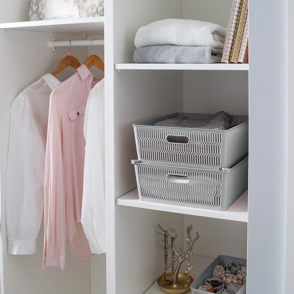 Maximize your storage space with the 2 Pack Slide 2 Stack It Shallow Storage Tote Baskets. Created with a patented slide to stack design which provides slide out corner support that allow the totes to be safely stackable. Storage totes hold up to 25lbs while stacked, allowing you to maximize your storage in closets, cabinets, shelves and more. The totes neatly nest inside when not in use. Organizing just became easier with the slide 2 stack it totes! Dimensions: 15" x 13" x 5" Patented Slide 2 Stack Design: The corners of each storage tote are designed with slide out support to allow totes to be stackable. This helps to maximize your storage space. Nestable: The totes nest easily inside each other when not in use for easy storage and will take up less space. Holds 40lbs: These baskets are strong and durable enough to hold up to 40 pounds when stacked. Multipurpose: These totes are perfect for your bathroom, kitchen, bedroom, and more. You can easily towels, soaps, lotions in it. Or you can use them to organize your craft room.