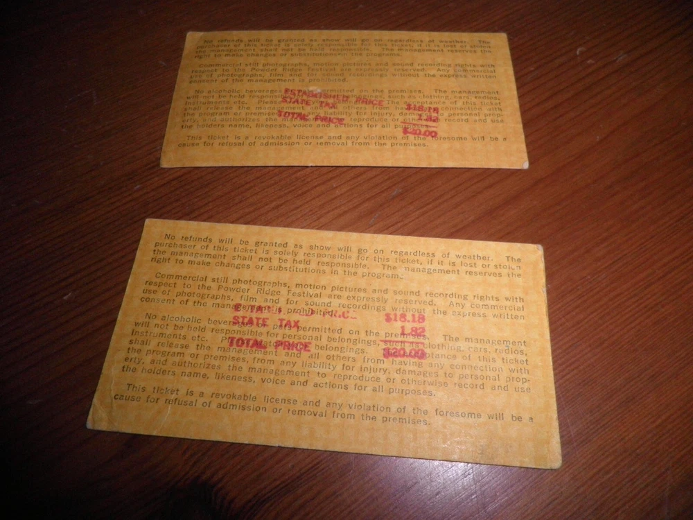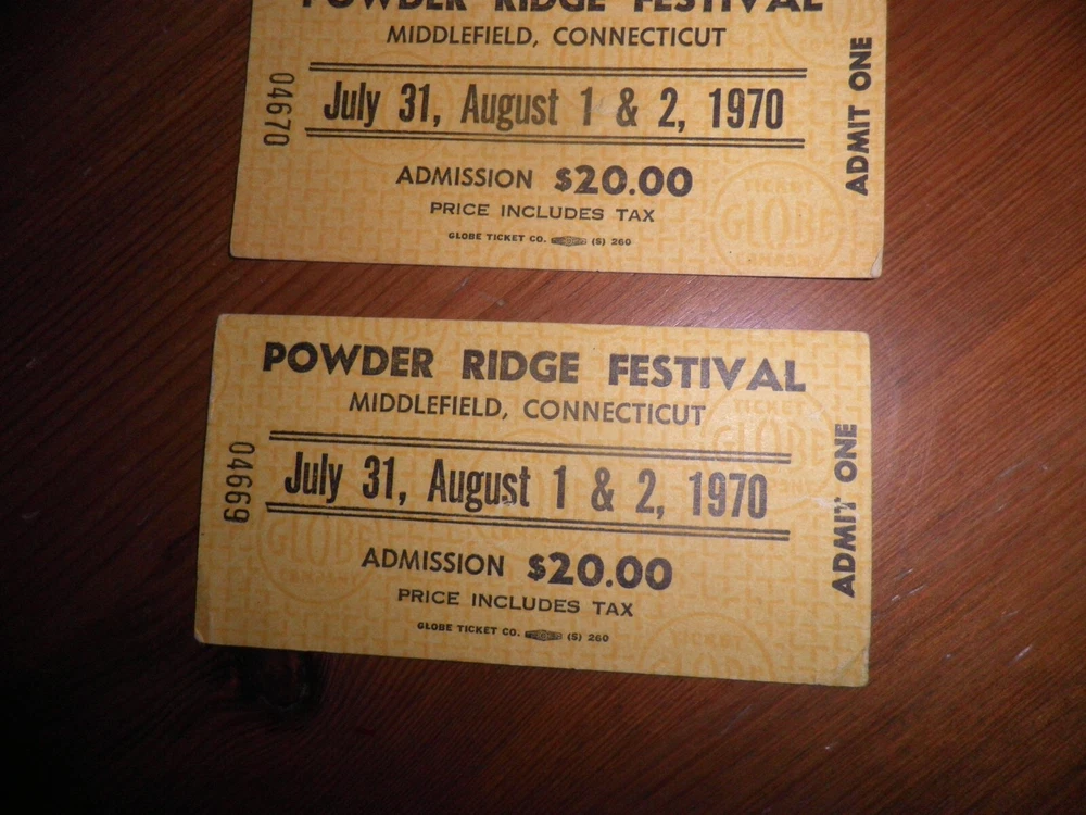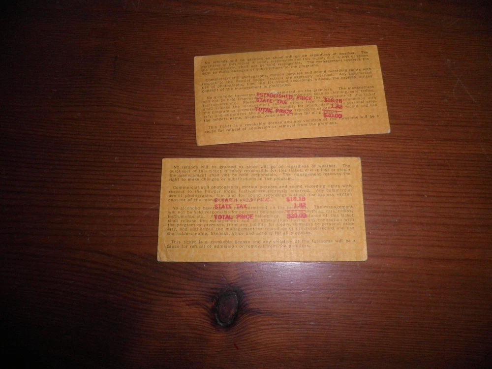 2 POWDER RIDGE TICKETS PLEASE ZOOM PICTURES SOLD AS IS I WANT TO BE HONEST THEY SMELL A LITTLE MUSTY--HAVE BEEN STORED IN A JEWELRY BOX FOR MANY YEARS--PROBABLY SINCE I BOUGHT THEM IN 1970 $125.00 OR BEST OFFER SHIPPING $12.00--IF LESS I WILL REIMBURSE THE DIFFERENCE