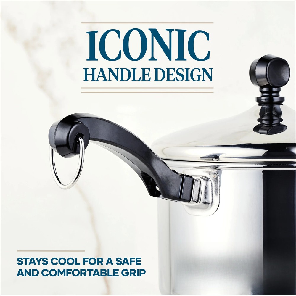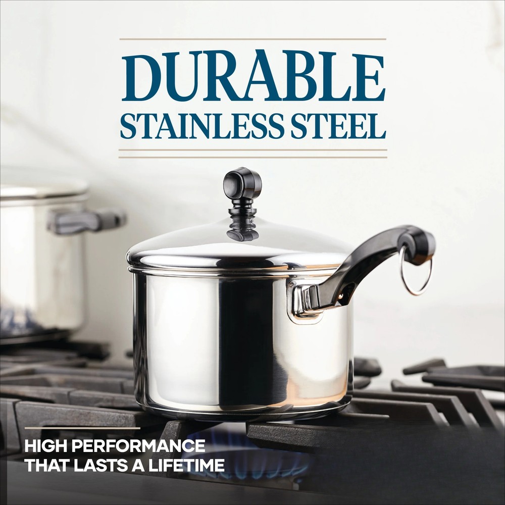 This Classic Series 2-Quart Stainless Steel Saucepan with Lid is sure to come in handy at all times of the day or night. A full cap base featuring a thick aluminum core surrounded by stainless steel provides rapid, even heating on any stovetop, including induction. The heavy-duty stainless steel is polished to a mirror finish for a classic touch, and the comfortable saucepan handle with iconic styling provides a confident grasp. This 2-quart saucepan works beautifully when reheating a serving of macaroni and cheese at lunch, cooking a side of rice during dinner, or warming chocolate sauce to top off an ice cream sundae for dessert. STAINLESS STEEL COOKWARE: The 2-quart saucepan full cap base boasts stainless steel layered over a thick aluminum core for rapid, even heating; pan exterior is mirror-finished DURABLE CONSTRUCTION, COMFORTABLE DESIGN: Comfortable handle with iconic styling provides a confident grasp; stainless steel, snug-fitting lid boasts bell shape, rolled rim and stylish knob OVEN SAFE, DISHWASHER SAFE COOKWARE: The stainless steel saucepan is oven safe to 350 degrees F and dishwasher safe for fast, easy cleanup SAUCEPAN COMPLEMENTS FRYING PANS: This saucepan coordinates perfectly with frypans, stockpots and other items from the Classic Series collection INDUCTION COMPATIBLE SAUCEPAN: The full cap base makes this saucepan an excellent conductor of even heat distribution and induction stovetop compatible