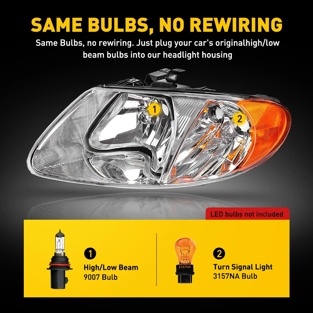 Fit for: 2001-2007 Dodge Caravan models only 2001-2007 Dodge Grand Caravan models only 2001-2007 Chrysler Town & Country models only (Do not fit 2005-2007 Town & Country models with extended wheel base (119.3")) 2001-2003 Chrysler Voyager models only 2001-2002 Chrysler Grand Voyager models only Specifications: OE number: 4857701AB, 4857700AB, 4857700AC, 4857701AC CH2503129, CH2502129 Material: ABS+PC (ABS Plastic Housing/Polycarbonate lens) Appearance color: 1.Housing Color: Chrome 2.Lens Color??Clear 3.Reflector Color??Amber The bulb type of original car: 1.Low beam: 9007 2.High beam: 9007 2Set Black Headlights Lamp Fits 01-07 Dodge Caravan Chrysler Town&Country LH+RH Fit for: 2001-2007 Dodge Caravan models only 2001-2007 Dodge Grand Caravan models only 2001-2007 Chrysler Town & Country models only (Do not fit 2005-2007 Town & Country models with extended wheel base (119.3")) 2001-2003 Chrysler Voyager models only 2001-2002 Chrysler Grand Voyager models only Specifications: OE number: 4857701AB, 4857700AB, 4857700AC, 4857701AC CH2503129, CH2502129 Material: ABS+PC (ABS Plastic Housing/Polycarbonate lens) Appearance color: 1.Housing Color: Chrome 2.Lens Color??Clear 3.Reflector Color??Amber The bulb type of original car: 1.Low beam: 9007 2.High beam: 9007 3.Turn signal light: 3157NA Note: Projector ×??Not include?? DRL × (Not include) Bulb × (Not include) Features: *Easy to install: Direct replacement, drilling and cutting are not required. *Superior quality: Made of ABS and PC materials with toughness and heat resistance functions to ensure its long service life and durability. *Angle adjustment: Equipped with a headlamp Angle adjustment knob, you can adjust the best Angle of view through the knob. *Suggestion: 1.Please confirm the OE number before purchasing!!! 2.Professional installation is required!!! Packaging include: Headlights*2(Left+Right) Item Specifics Light Color Cold White Certifications DOT, SAE Bulbs Included No Items Included Bulbs Placement on Vehicle Left Right Front Bulb Shape Code Use Stock Bulbs Headlight Style Factory, Reflector Manufacturer Warranty 2 Years Voltage 12 V Fits for 4 2001-2003 Chrysler Voyager models only Fits for 3 2001-2007 Chrysler Town & Country models only Features Projector Housing Fits for 2 2001-2007 Dodge Grand Caravan models only Fits for 1 2001-2007 Dodge Caravan models only Finish Polished Lighting Technology LED Mounting Style Screws Color Temperature 6000K Fitment Type Direct Replacement Fits for 5 2001-2002 Chrysler Grand Voyager models only Manufacturer Part Number 4857701AB 4857700AB 4857700AC 4857701AC Number of Bulbs 2 Material ABS Plastic, Polycarbonate Lens Superseded Part Number 4857701AB, 4857700AB, 4857700AC, 4857701AC California Prop 65 Warning The item contains chemicals known by the State of California. Brand Unbranded Type Headlight Assembly Shipping/Return Shipping Fee Free Shipping Within 48 States Interchange Part Number CH2503129 CH2502129 OE/OEM Part Number 4857701AB 4857700AB 4857700AC 4857701AC CH2503129 CH2502129 Housing Color Black Model Headlight Set For 2001-2007 Dodge Grand Caravan Lens Color Clear Country/Region of Manufacture United States Package Includes Driver & Passenger Side Headlights UPC 841808117602 Model Headlight Set For 2001-2007 Dodge Grand Caravan FAQ ♥ If you have a decoding problem or any other problems, please contact us first, we will help you with it. We will reply you within 24 hours in working days. I'm a new seller, thanks a lot for your trust and convince! I will serve you with all my heart. ♥ Q1: Will this bulb fit my vehicle? A: We can match almost any vehicle to one of our bulb sizes. eBay only lets us include some vehicle fitments per listing, but if your vehicle does not show up on the compatibility table at the top of our listings, welcome you to contact us for free consulation before purchasing a product. Q2: My item has not arrived, what's taking so long? A: Sometimes items take longer than expected, especially if it’s going far or to rural area. Check with your post office to see if your item has been held up. Sometimes Royal Mail will not update a tracking number until it has arrived at its destination. If your item still don't arrive after a few days, let us know so we can double check for you and help solve it asap. Q3: My bulbs won't fit, help! A: Special bulb holder may be required. See if you can take the holder from the stock bulb. If not, let us know. The bulb size may be wrong, double check the item you received with the item you ordered. Do you have an aftermarket lighting housing? These may not be perfectly fitted for aftermarket bulbs and will require some manual modifications. Q4: Neither side lighting up? Both sides flicker, hyper flash, or work inconsistantly. A:Check the light fuses, and then check the ballast plugs to insure correct installation. If this doesn't work, there may be a voltage problem with the vehicle. You probably just need a relay or capacitor. Even though some bulbs are builtin resistors, they may still need a decoder. Pay & Ship (1). We gladly accepts payment via PayPal, We will ship your item(s) within 24 hours. (2). Before payment, please keep the consistency of Paypal address and ebay address. (3). Quantity orders are welcome! Returns (1). We offer 60 days free return policy. Please contact us within 60 days from the date you receive your order if you have any issues with the product or want return. Refund will be send after we got your resend package. (2). All returned items should be in the original packaging , return tracking information should be provided . Contact Us (1).Negative feedback will not help resolve any problems you have, please contact us via eBay messages before leaving negative feedback , our customer service will make best effort to help you with the issues. (2).We maintain high standards of excellenceand strive for 100% customer satisfaction! Feedback is very important to us. We request that you contact us immedi