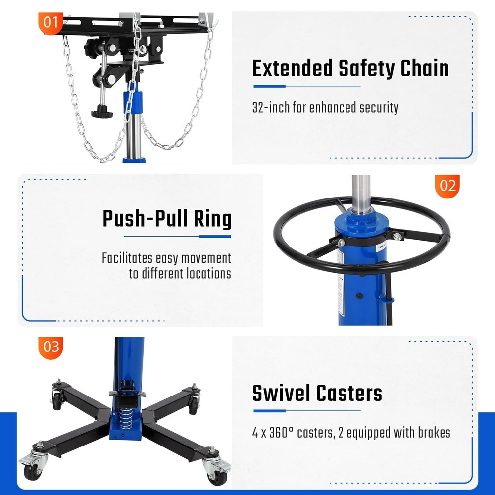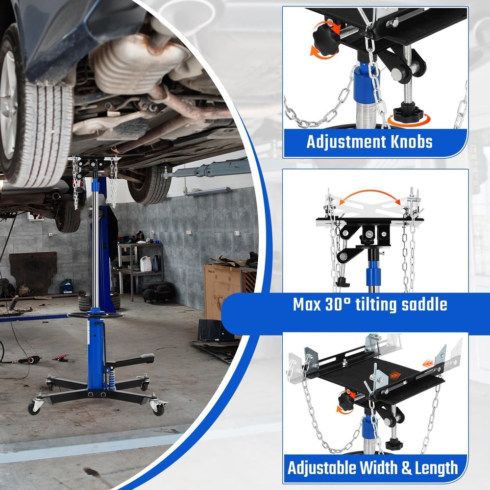 【Heavy-Duty Load Capacity & Secure Handling】Capable of supporting up to 1320 lbs, this two-stage hydraulic transmission jack ensures safe and stable performance during installation or removal of transmissions for cars and light trucks. 【Precision Positioning & Wide Tilt Adjustment】Equipped with an adjustable saddle that tilts up to 30 degrees, enabling fine-tuned angle control for precise positioning during installation and removal operations. 【Extended Lifting Range & Foot-Operated Control】Featuring a 34"-68" lifting range with hydraulic operation, this jack features a convenient foot pedal for easy lifting, allowing you to keep both hands free for better control. 【Smooth Mobility & Enhanced Stability】Four swivel casters provide easy maneuverability, while the wide base design and two hea 2-Stage Transmission Jack Lift 1320lbs Lift Trans Jacks Hoist with Dual Spring Features: 【Heavy-Duty Load Capacity & Secure Handling】Capable of supporting up to 1320 lbs, this two-stage hydraulic transmission jack ensures safe and stable performance during installation or removal of transmissions for cars and light trucks. 【Precision Positioning & Wide Tilt Adjustment】Equipped with an adjustable saddle that tilts up to 30 degrees, enabling fine-tuned angle control for precise positioning during installation and removal operations. 【Extended Lifting Range & Foot-Operated Control】Featuring a 34"-68" lifting range with hydraulic operation, this jack features a convenient foot pedal for easy lifting, allowing you to keep both hands free for better control. 【Smooth Mobility & Enhanced Stability】Four swivel casters provide easy maneuverability, while the wide base design and two heavy-duty safety chains ensure exceptional stability during operation. 【Durable Steel Construction & Secure Design】Built with high-grade steel and a reinforced structure, this transmission jack delivers reliable performance and secure load handling in professional and home garage settings. Package List: Transmission Jack x 1 Payment Delivery details Terms of sales About us Contact us Payment We accept payment either via PayPal or any of the following credit cards; Visa, MasterCard, Discover, and American Express. Delivery details 1. We will delivery out at the handing time when we receive the payment. 2. The delivery time is 3-5 business days to US by usually time.The parcel maybe delay 1-2day of the weekend.Due to the bad weather,Holidays,Hot Season ect.the parcel maybe delay,If you have any problems,mssage us,we will try our best to solve it. 3. We ship to your eBay address. Please make sure your eBay address is correct before you pay. 4. If you want to change the shipping address,message us before our send out. Terms of sales If you are not satisfied with the item for any reason, please do not quick to leave negative/neutral feedback even open request and case without any communication with us. We devote ourselves making EVERY CUSTOMER in 100% Satisfactory and resolve any problem. Thank you for your understanding and recognition,we are always leave positive feedback to all our customers. About Reply: All replies will be sent to your email box, if you do not get response within 24 hours (Sat. & Sun. excluded) please check your eBay My Messages in case that our emails will be filtered automatically by your settings. About us skybridge99 is a brand new store but we are one of North America’s top online suppliers of specialized, high-quality aftermarket online retailers and suppliers, committed to developing new markets. We primarily offers tool sets, auto parts, home goods, etc..With over 20 years of product selection and manufacturing experience, we delivers unparalleled quality, value, service and satisfaction. Our highly-trained, professional staff offer in-depth knowledge and personalized assistance for customers worldwide. Providing our customers with a simple, hassle-free experience with best-in-class customer service is more than a goal. Contact us Any problem please rest assure to contact us by eBay message first. We will reply you as soon as we can. We will deal with it within 24hs on working days. Brand Garvee Manufacturer Part Number Transmission Jack Material Steel Maximum Weight Capacity 1320lbs Item Weight 44 kg/97.00 lb Type Transmission Jack Warranty 5 Year Color Blue Features Heavy-Duty ,Universal Fit Universal Fitment Yes Number of Pieces 1 Drive Hydraulic Vehicle Type Heavy Duty/Commercial Capacity per Stand 1320lbs Minimum Height 34" Maximum Lift Height 68"