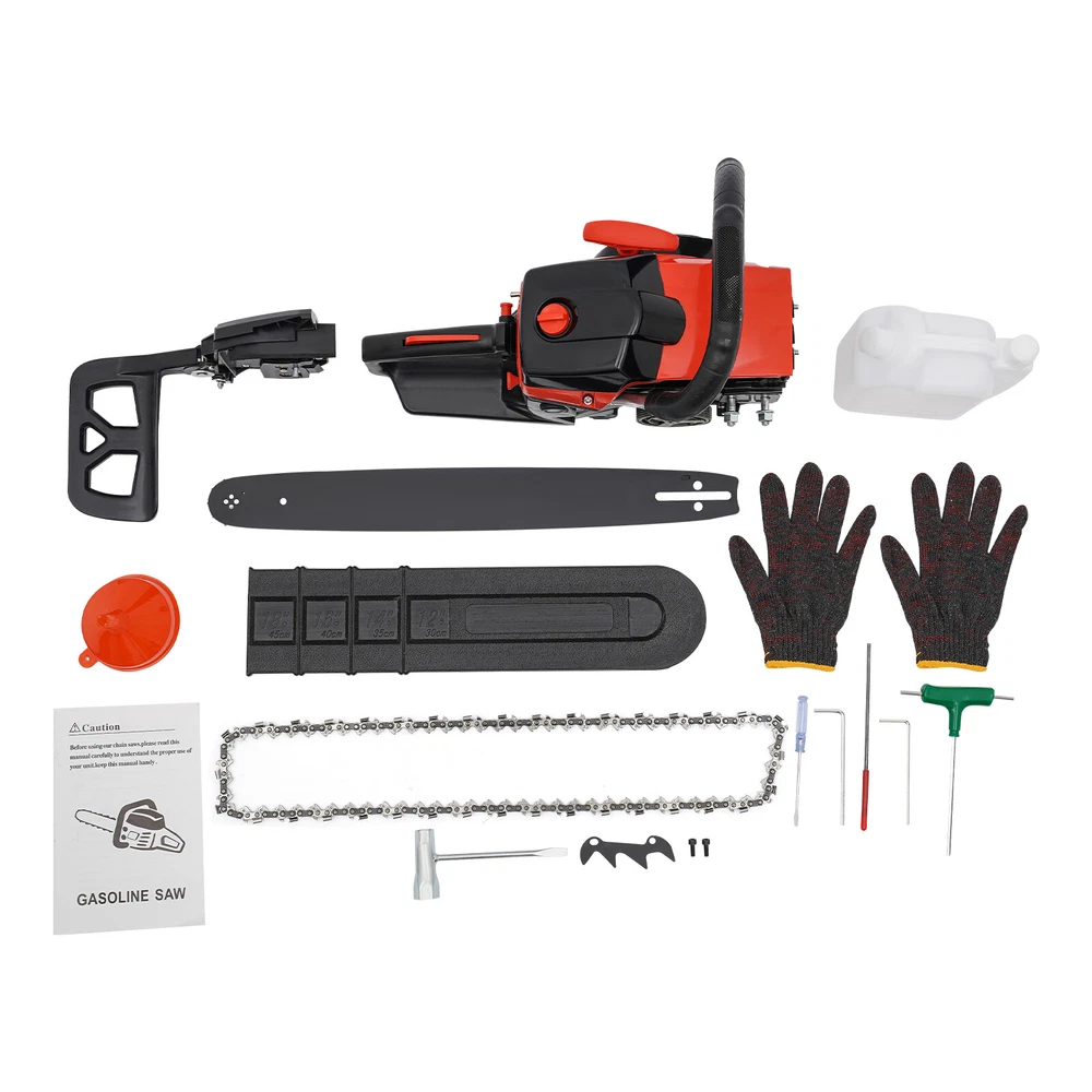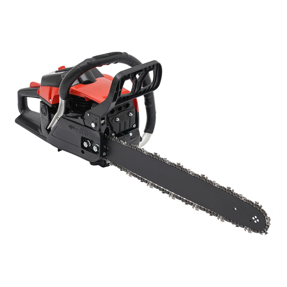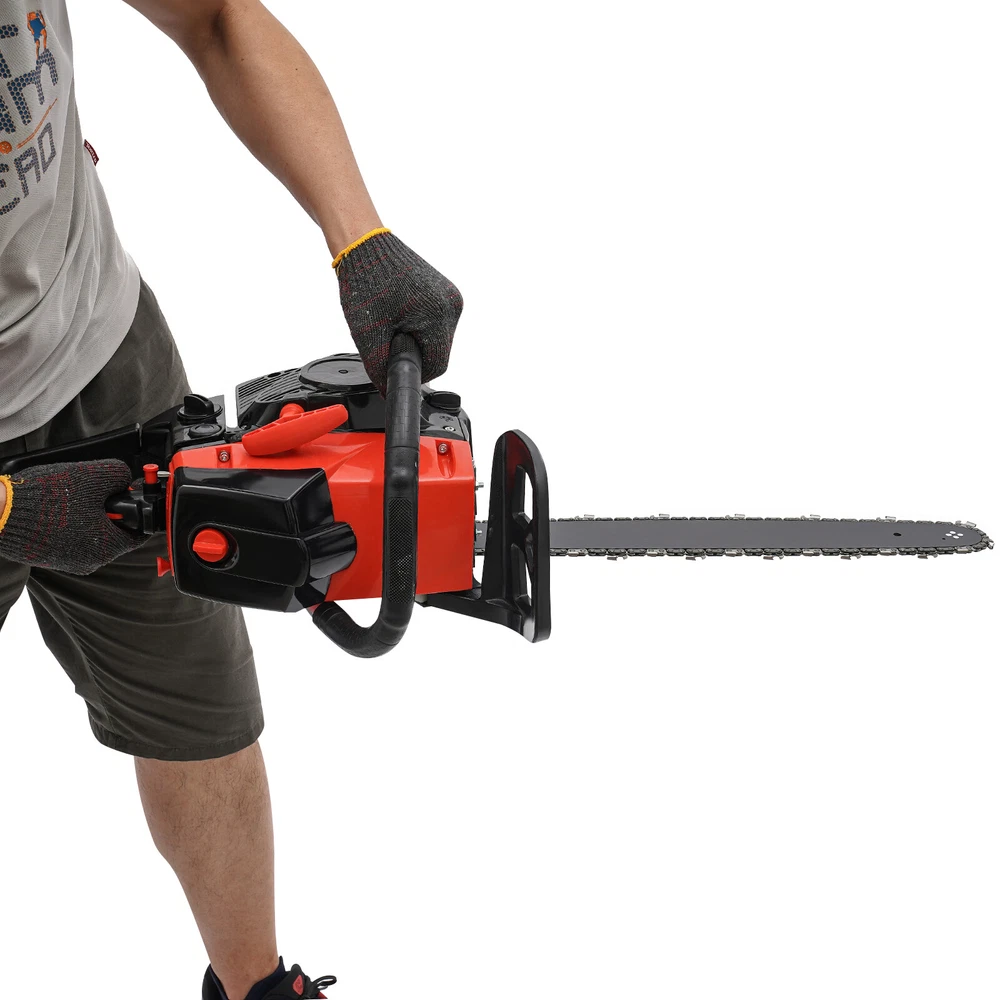 2-Stroke Gas Chainsaw 2.2Kw Handheld Petrol Chain Saw 58cc Gasoline Chainsaw Description This gasoline chainsaw is powered by a high-quality 2-stroke engine with 58cc displacement, featuring high efficiency, high power, reliable operation and long service life, which is ideal for cutting wood with less effort. The lightweight design makes it easier to operate, ergonomic handle ensures a comfortable user experience. With it, your work becomes easier and easier. Key Features High-quality Materials: This gasoline chain saw is made of high-quality plastic, nylon, and 65 Mn steel, which is sturdy and durable, wear-resistant, not easy to deform, and has a long service life. High Efficiency: This product has a 2-stroke air-cooled engine, 58cc displacement, 2800-11000rpm high speed, 2.2Kw high power, and 24.8-inch hardened chain and 18-inch one-piece molded guide, which can achieve chain speeds of 12.5 ft/ s, allowing you to cut through trees quickly and more easily. Cost-saving: This product adopts a diaphragm carburetor and automatic filtration systems, which not only prevent dust and debris from entering the engine, thus reducing fuel consumption, but also burn the gasoline fully and improve the fuel utilization rate. In addition, the advanced automatic lubrication system minimizes friction between the guide bar and the chain, prolonging the life of the chain and ensuring a seamless cutting experience. High Safety: It has a dual protection switch that needs to be pressed at the same time to activate, which prevents the machine from starting accidentally for added safety in use. Moreover, the thicker and wider baffle allows for emergency braking and prevents wood chips from splashing, or accidentally touching the chain, increasing safety in use. Portable and Ergonomic: The ergonomic front handle and starter handle, and anti-vibration system provide you with maximum comfort, allowing you to start the product quickly and ensuring comfortable control during long periods of use. Good Heat Dissipation: Dense cooling holes and three-hole exhaust vent ensure good heat dissipation, which effectively prevents the body temperature and the internal oil temperature from getting too high, ensures that the machine won't go out even after a long period, and also prolongs the service life of the machine. Thoughtful Design: The muffler, vibration-absorbing design and engine pressure reducing valve can effectively reduce noise and vibration, providing you with a comfortable user experience. Easy to Install: The simple structure, complete accessories, and an English manual allow you to install this product in minutes, saving you time and labor. Protective Package: To prevent the product from being damaged and bumped during transportation, we packed it with foam to protect your products to the maximum extent possible. Customer Service: We aim to provide quality products and services. If you have problems, please feel free to contact us. We will reply and solve the problem for you as soon as possible. Details Fuel Tank: With its 18.93 Oz fuel tank, it saves time and effort without frequent refueling for long-term use. Guide Bar Cover: It is easy to store and better protect the guide bar when not in use. Application It is suitable for garden pruning, forest logging, firewood cutting, bamboo harvesting, wood cutting, tree pruning, shrub pruning, and so on. It is suitable for homes, gardens, parks, forests, pastures, farms, orchards, and other places. Specification Color: Black+Red Style: Modern Material: Plastic, Nylon, 65 Mn Steel Process: Quenching, Integrated Molding Assembly Required: Yes Engine Type: Single Cylinder, Air-cooled, 2-Stroke Ignition System: CDI, Self-reset Manual Start Fuel Tank Capacity: 560ml/18.93Oz Chain Tank Capacity: 260ml/8.79 Oz Power: 2.2Kw Speed: 2800-11000rpm Displacement: 58cc Applicable Gasoline Type: Above 90# Oil Mixture: 25:1(Gasoline: Oil) Chain Length: About 63cm/24.80 in Chain Pitch: 8.25mm/ 0.32in Guide Length: 48cm/ 18 in Product Size: 89*20*26cm/35.04*7.87*10.23in Package Size: 50*27*30cm/19.68*10.63*11.81 in Gross Weight: 7.25kg/15.98 lbs Net Weight: 6.85kg/15.1 lbs Package Included 1* Gas Chainsaw 1* Guide Bar Cover 1 Pair* Gloves 1* English Manual 1* Funnel 1* Fuel Oil Mixing Bottle 1*Brake Baffle Other Accessories for Assembly Notes Please use gasoline >90# with special 2-stroke engine oil and never use pure gasoline. Gasoline and oil mixture ratio: 25:1. Please read the instructions carefully before use and take note of the safety precautions contained therein. Please fill the chain lubricating oil tank with chain oil (not included) before using the chainsaw. Then, run the chain for a few seconds without cutting to help lubricate it better. When the chainsaw is not in use, it is better to pack it in plastic bags to avoid dust and water entering the machine and affecting its use. If the chainsaw is not used for a long time, the fuel oil in the tank must be cleaned. Please allow the slight color difference caused by the shooting light and 1-3cm error due to manual measurement, and make sure you do not mind before ordering.