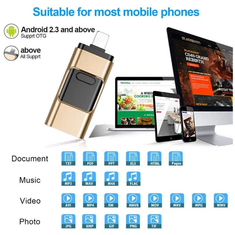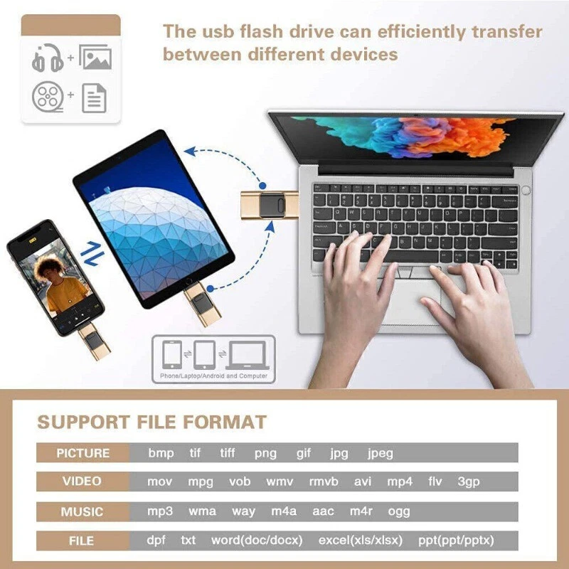 Fu nction: 1. Recording Apple IOS itself system cannot be directly removed the tape with each other , only can transfer out by Email,Now you can put the data transfer out without network as long as using the recording function of iflashdrive. 2. A key contacts backup Apple ios system cannot be backup directory,even can\\'t removed backup in the case of no computer network But iflashdrive can realize to backup and restoreThe operation is simple without network. 3. Mobile office. (You can select files to copy , delete, move , and edit the support files.) With the software of Apple IOS system can rapid modified the document in flash drive,And can transfer out by Email or 3G at anytime. Make your office work portable and shortcut. Support PDF,Word,Excel,PPT,HTM,Html,etc. 4 . Take photo /video on the flash drive. You can take pictures and video with iphone and store it in the flash drive. 5 .Copy photos from albums. You can copy the photos to the "External storage"(Flash drive) or "Local storage" (iPhone). 6 .Play videos / music. You can play the videos / music on the flash drive .Video Support: Mp4, Mov, RM ,RMVB,M4V,FLV,WMV,AVI. Music support: Mp3,AIF,WAV,AAC,WMA,etc. Description: It is very convenient to convert the data between iphone and usb stick. Compatible with new model of iPhone, iPad, iPod and so on. need to download app to work with It build-in a smart IC to supports to recognise and upgrade by itself to insure long-term stable running. No need to synchronize with iTunes to transfer between the usb flash drive and iPhone / iPad / iPod. Your can backup the contact info from iPhone / iPad, and restore the data for them. Support most of the file format, also freely transfer between iPhone/iPad and PC. Independent broadcast program and support to play the music under desktop backgrond. Music-streaming, directly paly music and do not occupy any space of iPhone / iPad. Separate connection to PC, become the normal usb flash drive. About capacity: 4GB=approximately 3.6GB-3.8GB 8GB=approximately 7.4GB-7.6GB 16GB=approximately 14.4GB-14.8GB 32GB=approximately 28.5GB-30GB 64GB=approximately 57GB-60GB Vendors are using Flash memory decimal arithmetic: 1 MB = 1000KB, 1G = 1000 MB Calculated, operating system with binary arithmetic: 1 MB = 1024KB, 1 GB = 1024 MB; So there are some differences between display capacity and nominal capacity of flash memory products
