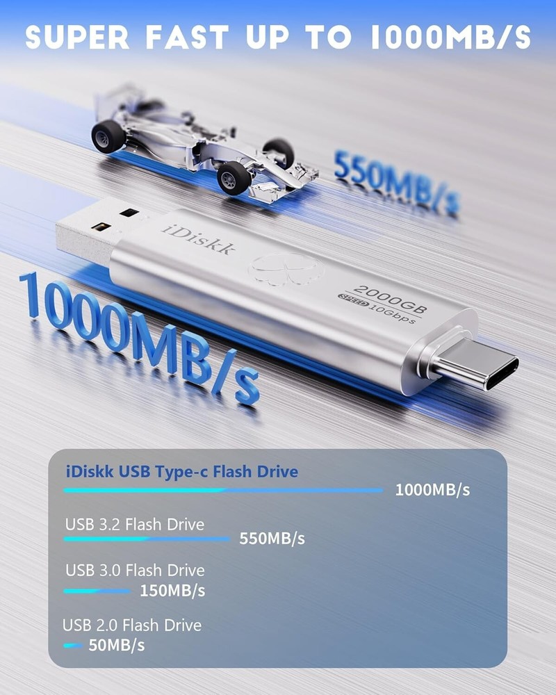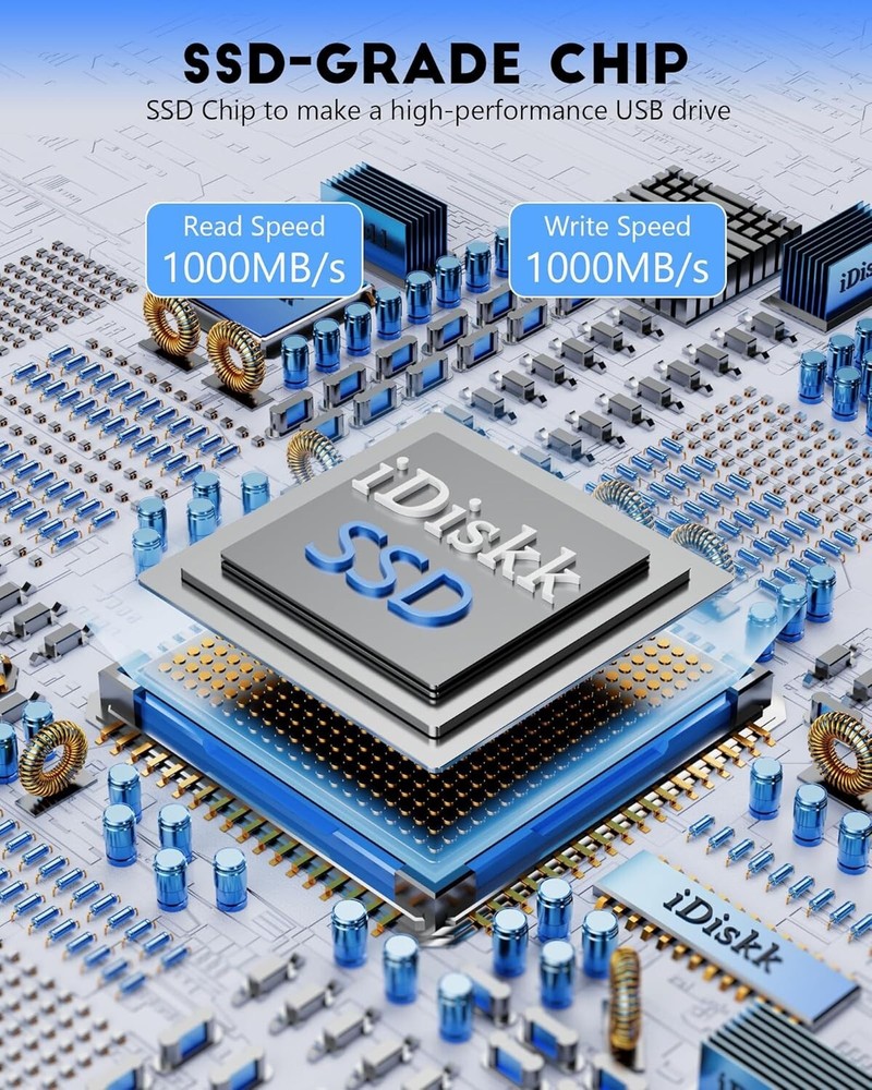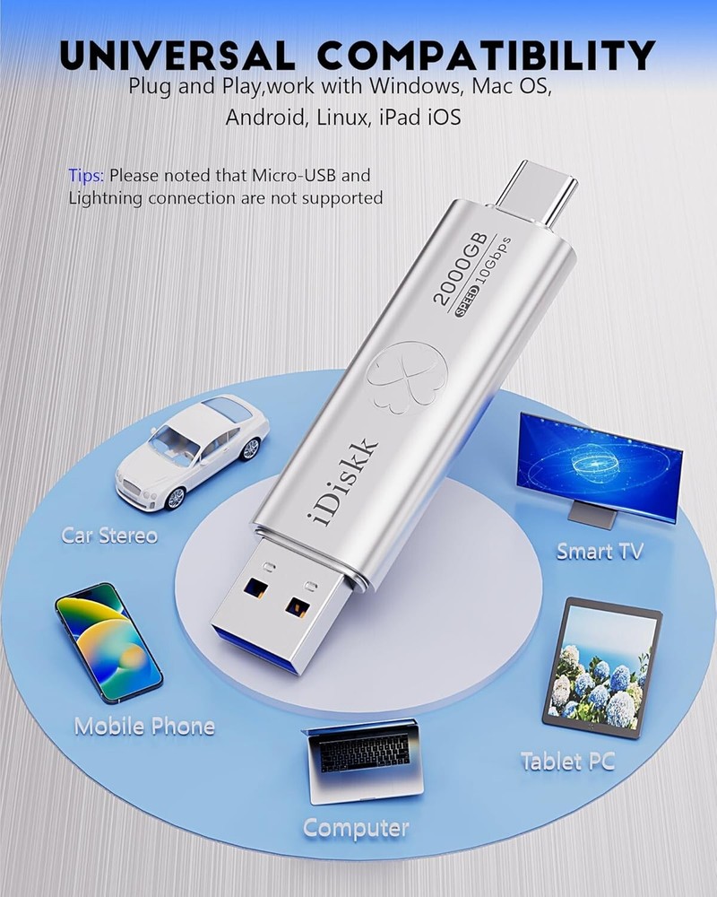 iDiskk 2TB Super Fast Solid State Flash Drive Photo Stick for iPhone 15/15 Plus/15 Pro/15 Pro Max,USB C iPad, MacBook,Laptops,Android Phones and Windows Computer, Up to 1000MB/S Product Details 【APP MANAGEMENT FOR IPHONE 15 SERIES,ONE-CLICK BACUP ALL PHOTOS& VIDEOS, USB 3.2 HIGHER-SPEED DATA TRANSTER】: With latest SSD tech (more faster than TF card or flash), which greatly boost data transfer speed up to 1000MB/S (reading) and writing speed can reach 950MB/S, help to save more time when transferring and uploading files. 【PLUG and PLAY:no APP or cable is required】: When you plug the flash drive into devices, you can directly use it to start data backup,to play music or movies from the flash drive. 【USB and USB C connectors to WORK WITH MOST devices】: Work on all of Android USB-C Phones, Macbooks, iMac,Laptops and Computers, Car audio system, Smart TV and More . 【Processional Data Storage Safety protection】: Experience thousands of data storage test, rigorous SSD Grade Inspection ensure date storage to be more safer and stable.