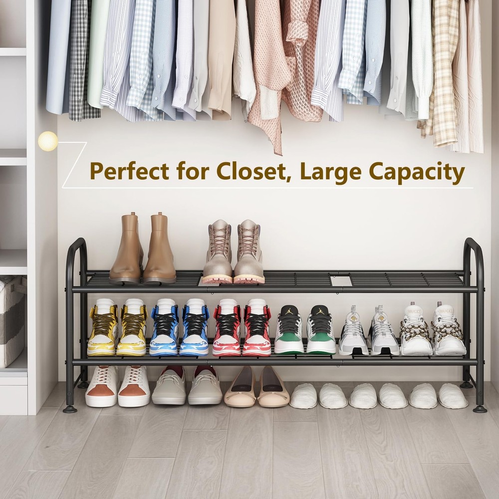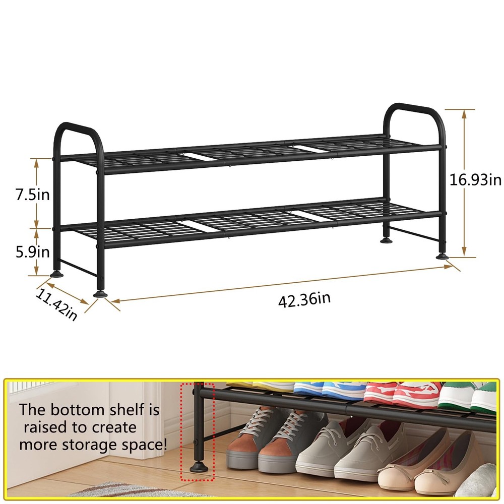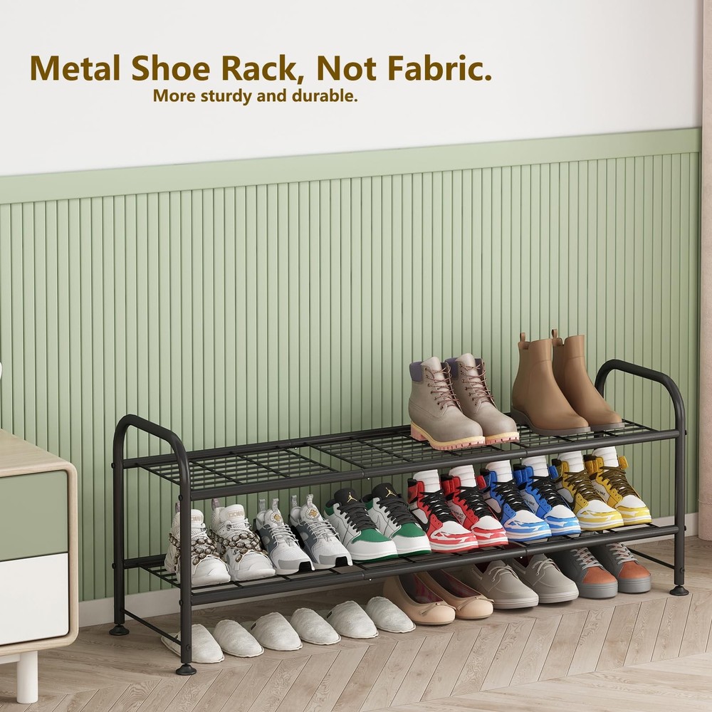 【Large Capacity】This 2-tier long shoe rack can easily stores up to 15-18 pairs of shoes for women, men, and children, such as slippers, sandals, high heels, sneakers, boots, etc. The raised bottom creates extra storage space for more shoes, ideal as a shoe rack for closet. 【Multipurpose Shoe Rack】This is a great storage rack for shoes as well as other living items, keep your entryway, closet, dorm room, garage, bedroom, living room, mud room tidy. 【High Quality】The entire shoe rack is made of iron with anti-rust spray paint on the surface, which is durable, has stronger load-bearing capacity, and can be used for many years. 【Easy to Assemble】Simple parts allow you to easily assemble the shoe rack in minutes. The bottom 4 adjustable feet can be applied to uneven ground. 【SHOPPING 】we provide a free 12-month customer return and exchange service. If you encounter missing parts or have assembly questions, please feel free to us through the Buyer Message.