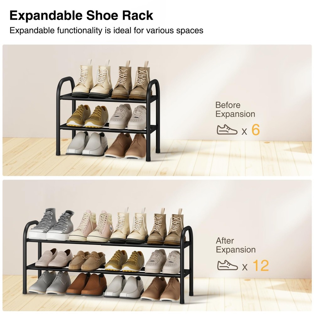 2-Tier Expandable Black Metal Shoe Rack Holds 12 Pairs Adjustable Storage