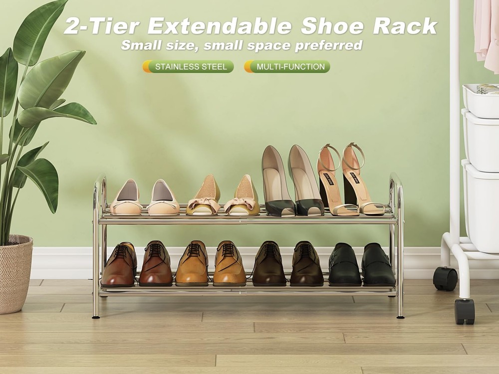 【Expandable Shoe Rack】stainless steel shoe rack adopts a expandable design to meet the requirements of different widths and increase storage space. 【Stretching Free Space】The shelf layer is composed of 4 stretching rods, so that it can store various items, and say goodbye to clutter. 【Sturdy Shoe Rack】Because all the poles are stretchable, it feels difficult to stretch the shoe rack. Don't worry, because we have prioritized the sturdiness of the shoe rack. 【Stainless Steel Material】Made of stainless steel, don't worry about rust, the shoe rack is more durable. Longest dimension: 27.1"W x 9.45"D x 12.6"H, shortest dimension: 15.1"W x 9.45"D x 12.6"H, weight: 4.08lbs/1.85kg. Note: Please use it in indoor spaces!