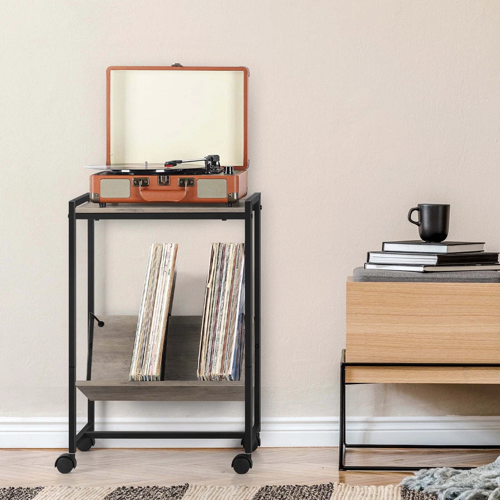This record player stand with storage can protect your precious records and albums. The 4 rolling wheels make the record player stand very convenient to push or lift the table up to move. The fine rods on the side prevent the vinyl's from falling accidentally. The V-shaped bottom rack allows for easy access to the vinyl's. The record player table is matched within 12-inch vinyl's, which can accommodate around 70-90 albums. The end table is made of high quality gray MDF shelves with a durable metal frame making the stand sturdy. [Small Record Player Table] This grey vinyl record player stand only takes up a small space, but the top layer can enlarge most sizes of turntables. The 2 V-shaped independent areas of this record cabinet are designed to help you organize all vinyl records, albums, magazines, books and CDs. You can dismantle the metal wire in the middle compartment and store items as you like, allowing for orderly storage of both large and small items. [Multiple Storage Options] The simple gray vinyl record storage can perfectly fit your modern room and various decorative styles. The wheels at the bottom help you easily move and can be used as a record storage, end table, sofa table, bedside table, making this amazing cube recorder table a part of your home and enjoying happy time with your family in your leisure time. [Convenient and Practical] Our vinyl album stand with wheels offers 2 options, one with wheels and the other with foot pads, to maximize your satisfaction. The bottom wheels can easily help you move, and you can take it to your garden, balcony, swimming pool, or any place you like to enjoy music., And 2 of the wheels can be locked without worrying about sliding. And when you don't need the wheels, you can replace them with foot mats, which is undoubtedly a great choice. [Stable and Stylish] Made of high-quality particle board and metal frame, this vinyl player record holder is sturdy and durable enough. The horizontal bars at the bottom support the entire holder effectively, enhancing its service life. It is also equipped with 4-foot pads that can adjust the height to enhance stability on uneven roads. The unique gray wood pattern incorporates a fashionable modern style, simple and elegant, enhancing your overall decoration level.