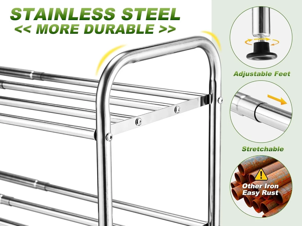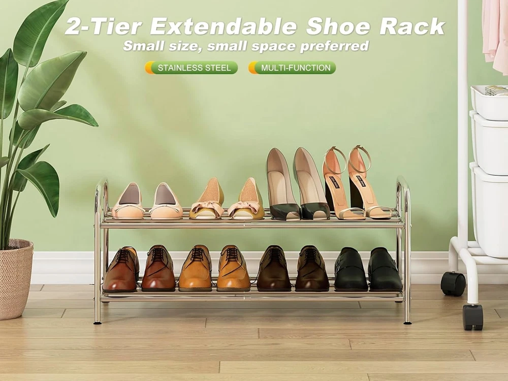 2-Tier Low Shoe Rack, 100% Stainless Steel, Small D: 2-tier, Silver Product Details Room Type: Bathroom, Closet, Laundry Room Number of Shelves: 2 Special Feature: Expandable, Rust Proof, Stackable Product Dimensions: 9.45"D x 27.1"W x 12.6"H Style: Modern Finish Type: Brushed Brand: SKIKEN Product Care Instructions: Wipe with Dry Cloth Assembly Required: Yes Recommended Uses For Product: Shoes Number of Items: 1 Manufacturer: SKIKEN Included Components: Rod Model Name: 2TierShoeRack Item Weight: 2.5 Pounds Furniture Finish: Stainless Steel Installation Type: Freestanding Specific Uses For Product: Shoes Unit Count: 1.0 Count Product Name: Shoe Rack Item Weight: 2.5 pounds Item model number: SKShoeRack MaterialMounting Type: MetalDIY Shelf TypeShape: MetalRectangular 【Expandable Shoe Rack】SKIKEN stainless steel shoe rack adopts a expandable design to meet the requirements of different widths and increase storage space. 【Stretching Free Space】The shelf layer is composed of 4 stretching rods, so that it can store various items, and say goodbye to clutter. 【Sturdy Shoe Rack】Because all the poles are stretchable, it feels difficult to stretch the shoe rack. Don't worry, because we have prioritized the sturdiness of the shoe rack. 【Stainless Steel Material】Made of stainless steel, don't worry about rust, the shoe rack is more durable. Longest dimension: 27.1"W x 9.45"D x 12.6"H, shortest dimension: 15.1"W x 9.45"D x 12.6"H, weight: 4.08lbs/1.85kg. Note: Please use it in indoor spaces!
