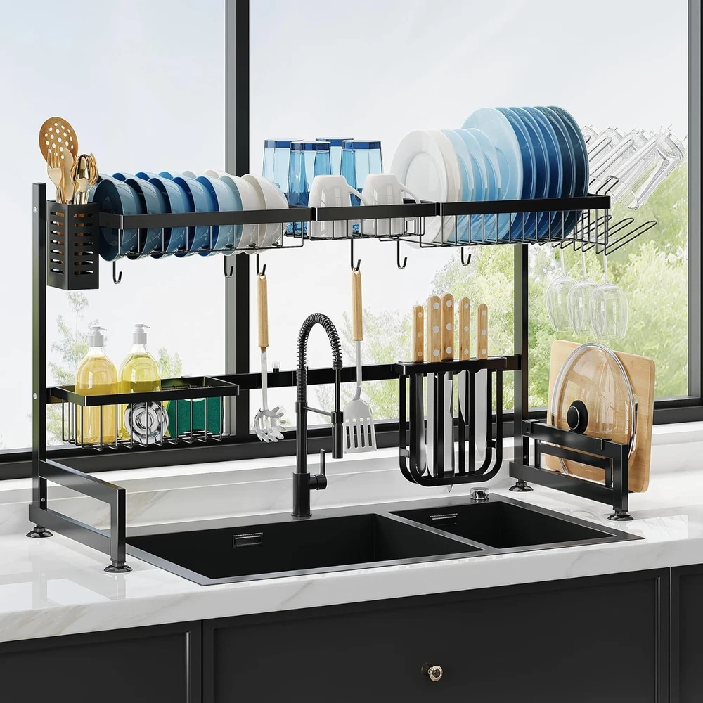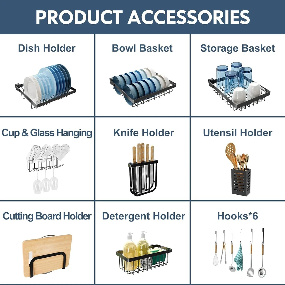 Features: Adjustable, Easy to Clean, Multipurpose Item Height: Over Sink Dish Drying Rack UPC: Does not apply Color: Black Recommended Uses For Product: Dishware Number of Tiers: 2 Number of Compartments: 6 Item Width: Over Sink Dish Drying Rack Brand: Unbranded Personalize: No Mounting: Wall Mounted Style: Modern gtin13: Does not apply Set Includes: Knife holder, Utensil holder, Cup holders, Cutting board holder Rack Type: Pull Down Shape: Rectangular Number of Shelves: 2 Mounting Type: Wall Mount Material: Stainless Steel Type: Dish Drying Rack Item Length: Over Sink Dish Drying Rack Item Weight: 5 pounds Size: Large Wood Tone: None Product Dimensions: 11"d X 33"w X 20"h Item Depth: 12.4 in Department: Unisex, Adults
