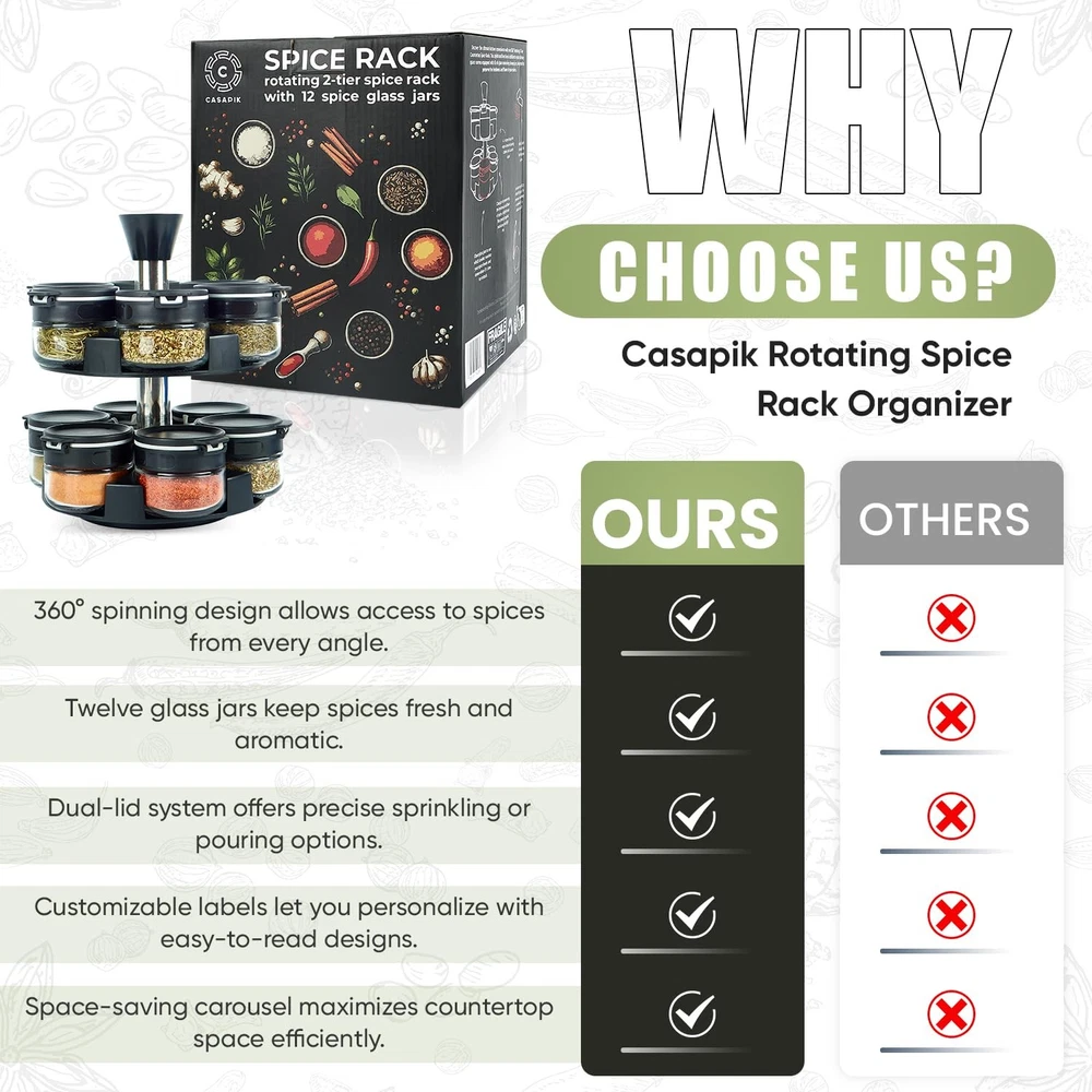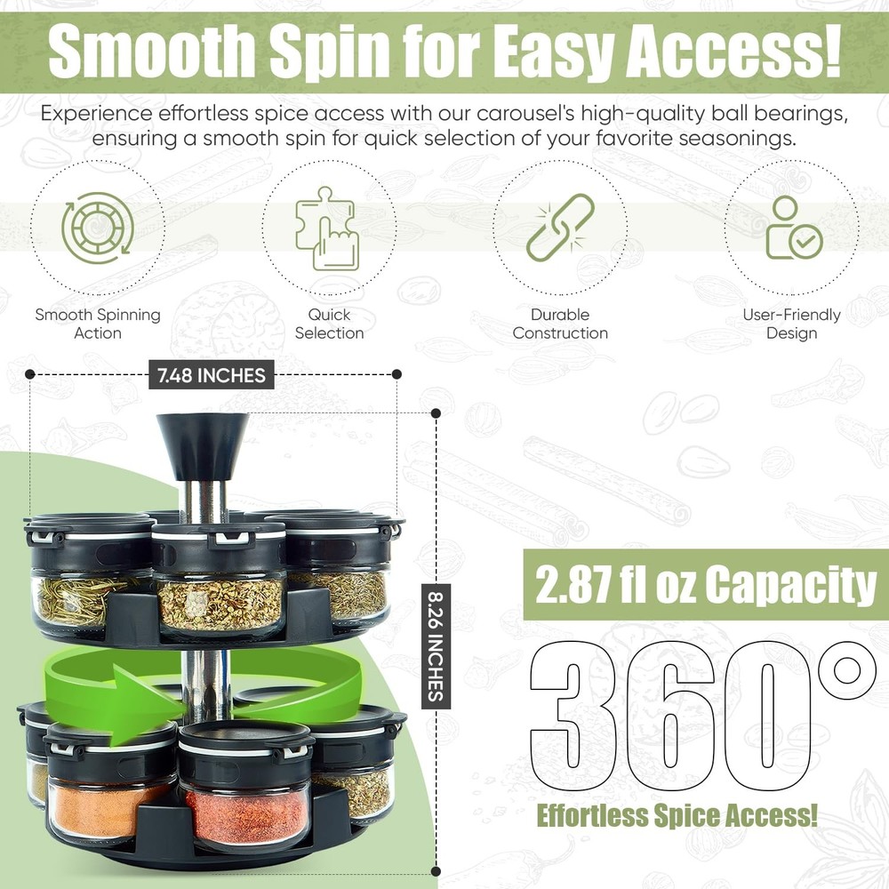 This rotating spice rack is a game-changer for my kitchen! The 360° spin makes finding spices effortless, and the glass jars keep everything fresh. I love how organized and clutter-free my counter looks now—plus, the dual-lid design makes seasoning precise and mess-free. Highly recommend for anyone who loves cooking!