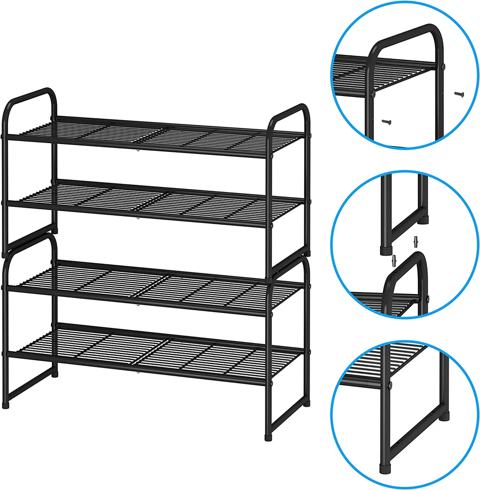 2-Tier Stackable Shoe Rack, Metal Shoe Shelf Storage Organizer, 【2-TIER SHOE RACK】 Stores up 6-9 pairs of shoes for men, women, additional bottom storage for slippers. Allow extra storage which can hold sundries in your wardrobe, living room 【Multifunctional】In the living room, the shelves can hold sundries.Put it in the closet and keep the clothes neat. Make the utility room looks cleaner. 【STACKABLE DESIGN】Include 4 connectors and stack up to multiple units that maximizes storage space in the same footprint (Purchase 2 and more units to vertically storage) 【EASY ASSEMBLY】Simple clip the shelves into the frame. You can easily adjust the height of shelves accommodates different sizes of shoes. Even the High Boots, you can store it easy 【DIMENSION】26.6"W x 11.3"D x 14.5"H What does this Simple Trending shoe rack have to offer? This 2-tier shoe rack provides shelves for keeping flats, boots, high heels, kids’ shoes. Two sets can placed side by side to Keep the shoes are neat and orderly, bid farewell to dirty differences. Versatile Storage Shelf: You can place this rack anywhere you want, such as in the entryway, closet, garage, living room or mudroom; also great as a storage shelf for dry food, books, games, toys, craft supplies, etc. Will you find any more possible uses? Just find out yourself with this Simple Trending versatile utility rack. Specifications: Color:Black Material: Metal Product Size: 26.6" * 11.2" * 14.5" Package Contents: 1x 2 Tiers Shoe Rack 1 x Assembly Manual 4 x Metal Connectors ( for stacking ) 11.2 "h x 26.6 "h x 14.5 "h. Weight: 3.5 lb Style Metal Wire Panel Number of Items 1 Material Metal Mounting Type Floor Mount Country of Origin China Shelf Type Tiered Shelf Shape Rectangular Room Type Garage, Closet, Living Room Assembly Required Yes Product Dimensions 26.6"D x 11.2"W x 14.5"H Installation Type Freestanding Product Name shoe rack Finish Type Multiple Specific Uses For Product Shoes Back Style Backless Item Weight 3.5 pounds Number of Shelves 2 Special Feature Stackable Color Black Furniture Finish Black Recommended Uses For Product Shoe Included Components Instruction Manual Product Care Instructions Wipe with Dry Cloth Size 2-Tier