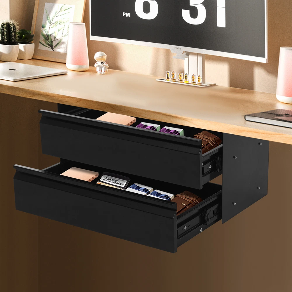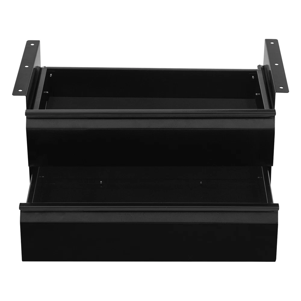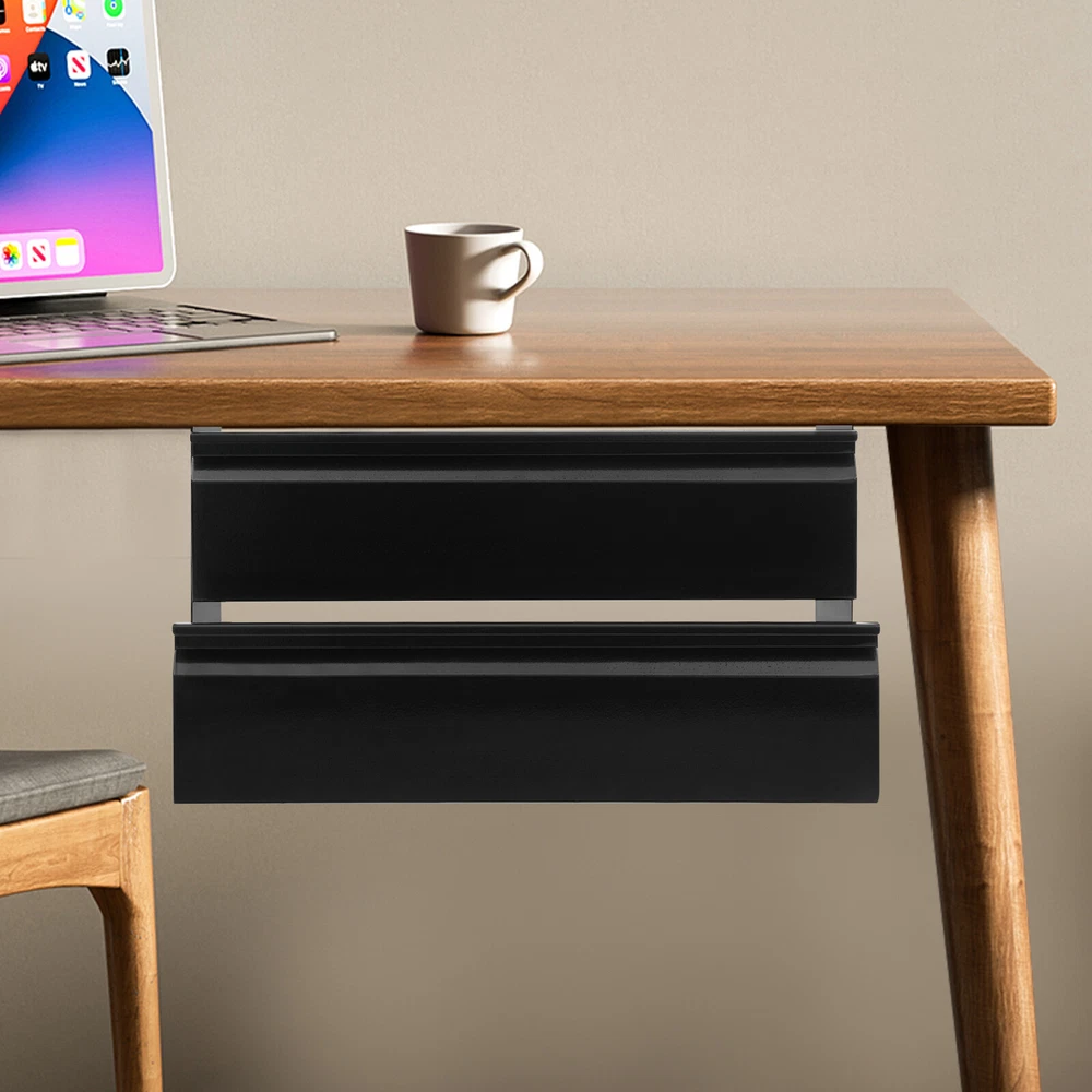 This under-desk sliding drawer is a game-changer for keeping my workspace clutter-free! The sturdy steel construction feels durable, and the smooth gliding tracks make accessing items a breeze. It was easy to assemble and fits snugly under my desk without wobbling. The two-tier design maximizes vertical space, perfect for storing small supplies, cables, or snacks. The black finish looks sleek and blends well with any setup. Even with a full load, it stays secure and stable. Super practical and space-saving—highly recommend for anyone needing extra organization!
